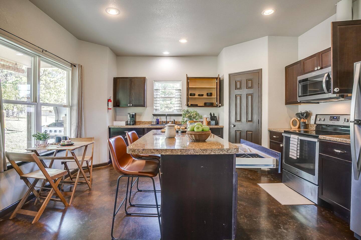 Welcome to Acorn Run Guest House—a beautifully remodeled hideaway brimming with cozy charm and Madagascar-inspired details. Every corner of this thoughtfully curated space is designed to inspire relaxation and creativity, blending unique decor with upscale touches to create a truly memorable stay. Whether you're planning a quiet solo retreat or a memorable stay for two, this hidden gem offers a peaceful escape full of warmth, personality, and attention to detail. When you arrive at the property you will see the main house. The guest house has its own private driveway which leads you to the back of the property and your own private oasis. As you enter, you'll be greeted by a comfortable living room adorned with playful wallpaper, curtains, and delightful decorations, creating a warm and inviting atmosphere. The adoring couch easily converts into a full-size bed, and the large flat-screen Smart TV ensures you're never far from entertainment. Inside, you'll find a selection of card and board games for hours of indoor fun, perfect for relaxing evenings. Abundant windows fill the space with natural light, creating a bright and uplifting atmosphere that complements the decor beautifully. Adjacent to the living room, a fully-equipped, full-sized kitchen awaits, boasting generous counter space that makes meal preparation a pleasure. We've stocked the kitchen with all the amenities you could desire, including a Keurig coffee maker with complimentary coffee pods and sugar. Whether you choose to savor your meals at the breakfast bar or the charming table by the window, you'll relish the view of the yard, surrounded by majestic pine trees. Moving on from the kitchen and living area, you'll discover the spacious master bedroom, where you can unwind in a large, comfortable king-sized bed adorned with high-quality linens. Nightstands with convenient USB charging outlets are provided for your convenience, and a small desk awaits if you need to catch up on work during your stay. The full-sized bathroom offers ample countertop space for your morning routine, and the shower also doubles as a relaxing tub. We provide two full towel sets per guest, a travel blow dryer, as well as shampoo, conditioner, and body wash. For your safety and peace of mind, a complete first aid kit is also provided. Connected to the bathroom, a roomy walk-in closet awaits, complete with hanging space and a chest of drawers for you to fully unpack and make yourself at home. We've even included a stacked washer and dryer with a supply of laundry soap and dryer sheets for your convenience. Outside, the spacious front porch sets the stage for a tranquil atmosphere, with large bamboo shades that offer privacy. You'll find a generous 5-burner grill for your culinary adventures, a comfortable bistro table and chair set, and a fire pit table, perfect for enjoying cooler evenings while you relax and unwind. High-speed Wi-Fi is readily available, ensuring you stay connected during your time at Acorn Run Guest House. Whether you're here for leisure or work, you'll have all the comforts you need for an unforgettable experience. Make your reservation today and escape to this little slice of paradise at Acorn Run Guest House. Your Madagascar-inspired retreat awaits!