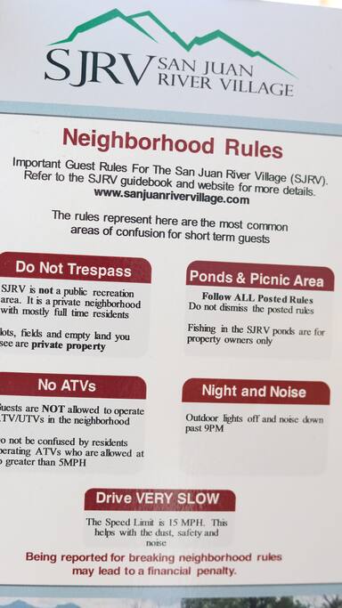 Please inquire first before bringing pets. NEIGHBORHOOD RULES: Important guest rules for the San Juan River Villa (SRJV). The rules represent here are the most common areas of confusion for short term guests: DO NOT TRESPASS SJRV is not a public recreation area. It is a private neighborhood with mostly full time residents. Lots, fields, and empty land you see are private property. PONDS AND PICNIC AREA Follow ALL posted rules. Do not dismiss the posted rules. Fishing in the SJRV ponds are for property owners only. NO ATVs Guests are NOT allowed to operate ATV/UTVs in the neighborhood. Do not be confused by residents operating ATVs who are allowed at no greater than 5MPH. NIGHT AND NOISE Outdoor lights off and noise down past 9pm. DRIVE VERY SLOW The Speed Limit is 5MPH. This helps with the dust, safety and noise. Being reported for breaking neighborhood rules may lead to a financial penalty. GENERAL Check-in after 4:00 PM and check-out by 11:00 AM (unless otherwise arranged). No parties or events are permitted. Quiet hours: 10:00 PM – 8:00 AM. No unauthorized overnight guests. Only the number of guests listed in the reservation are allowed to stay overnight. No smoking or vaping inside the home. Smoking is permitted only outdoors and away from doors and windows. No illegal substances or activities at any time. PETS Pets are welcome only if approved in advance and with payment of the listed pet fee. Please keep pets off furniture and beds. Guests must clean up after their pets indoors and outdoors. KITCHEN & HOME CARE Please treat the home as you would your own. Wash dishes or load the dishwasher before checkout. Do not move or rearrange furniture. Report any damages or maintenance issues promptly so we can address them quickly. SAFETY & SECURITY For your safety, do not disable or cover smoke detectors or exterior cameras. Lock doors and windows when leaving the property. Follow all posted safety signage for fire pits, pools, docks, and outdoor areas. CHECKOUT REMINDER Place used towels in the bathroom or laundry area. Remove all trash to outdoor bins. Verify that personal items are packed before departure. FEES & DAMAGES A $1,500 fee will apply for violation of any house rule (including unauthorized guests, smoking indoors, or tampering with safety devices). Excessive cleaning will result in a $500 fee. This includes, but is not limited to: Stains on furniture, rugs, or bedding. Trash left throughout the home or yard. Dirty dishes left unwashed. Spills or food left on floors, counters, or furniture. Pet waste not cleaned up. Glitter, confetti, or wax residue. Any condition requiring professional cleaning or odor removal.