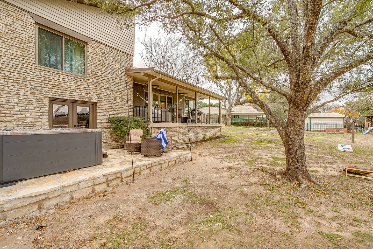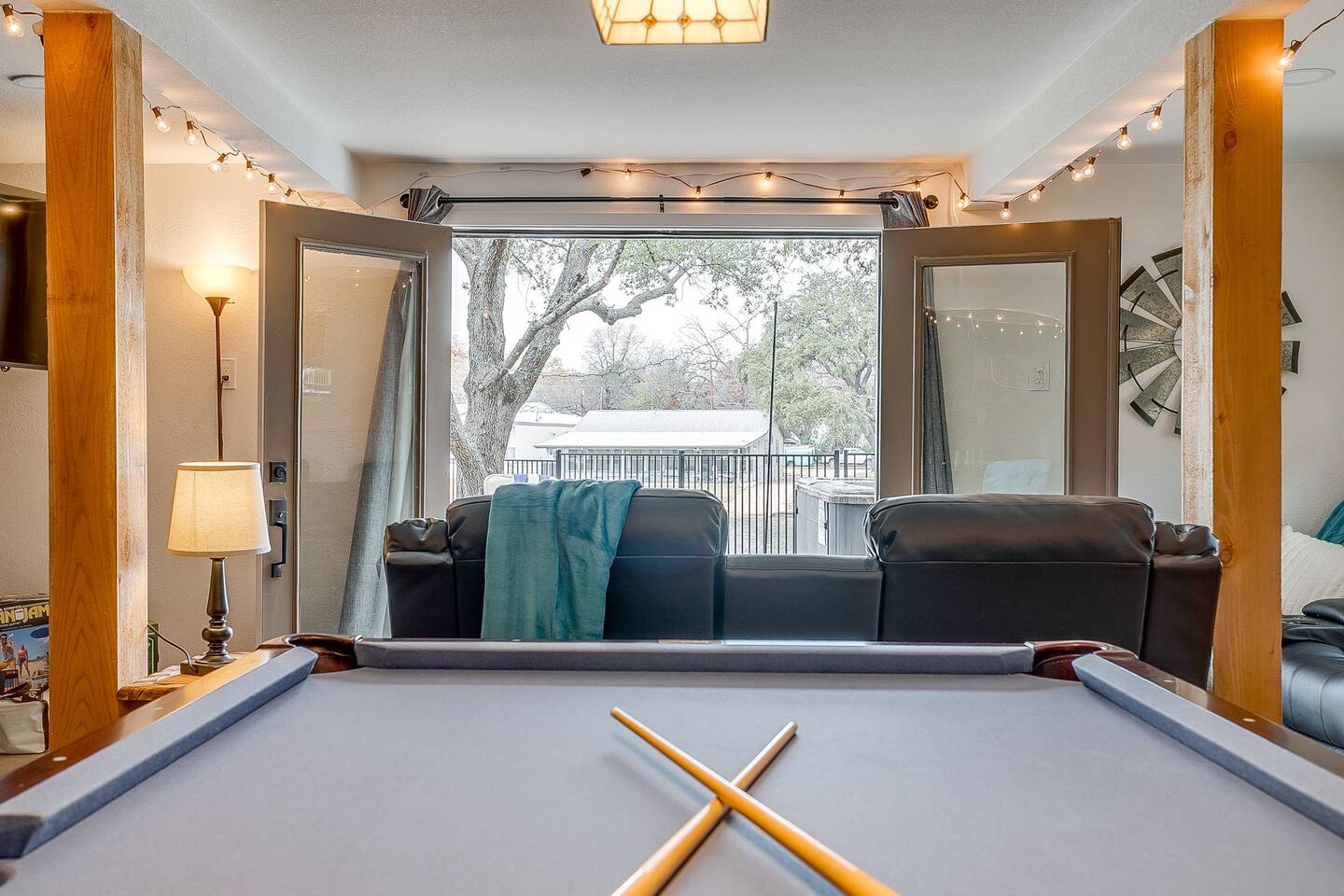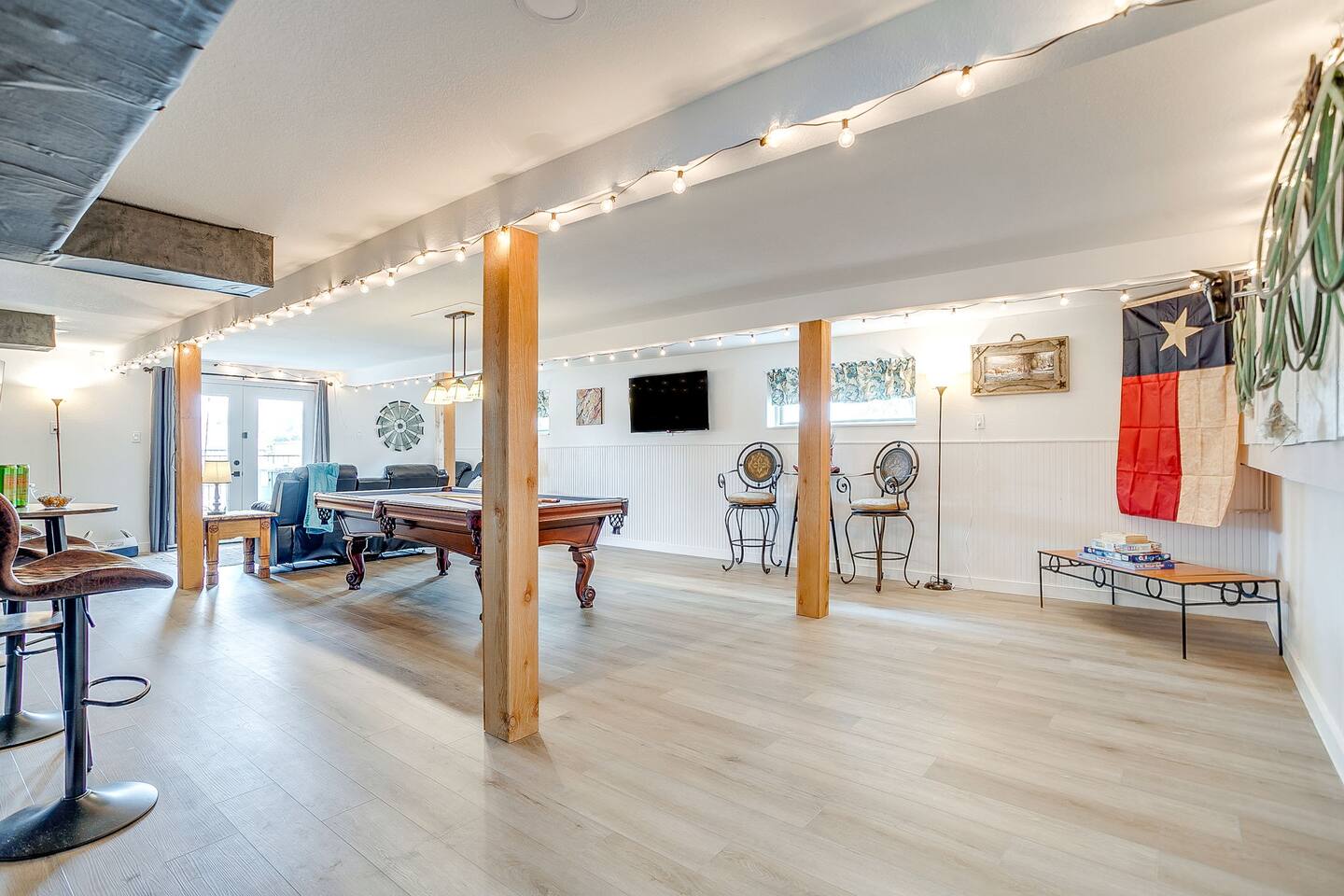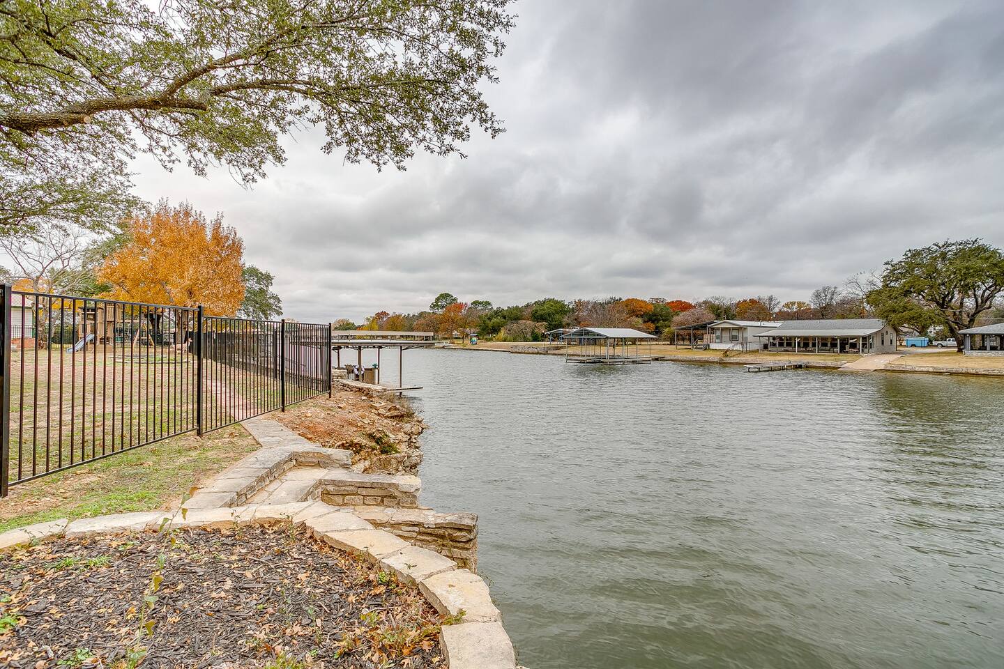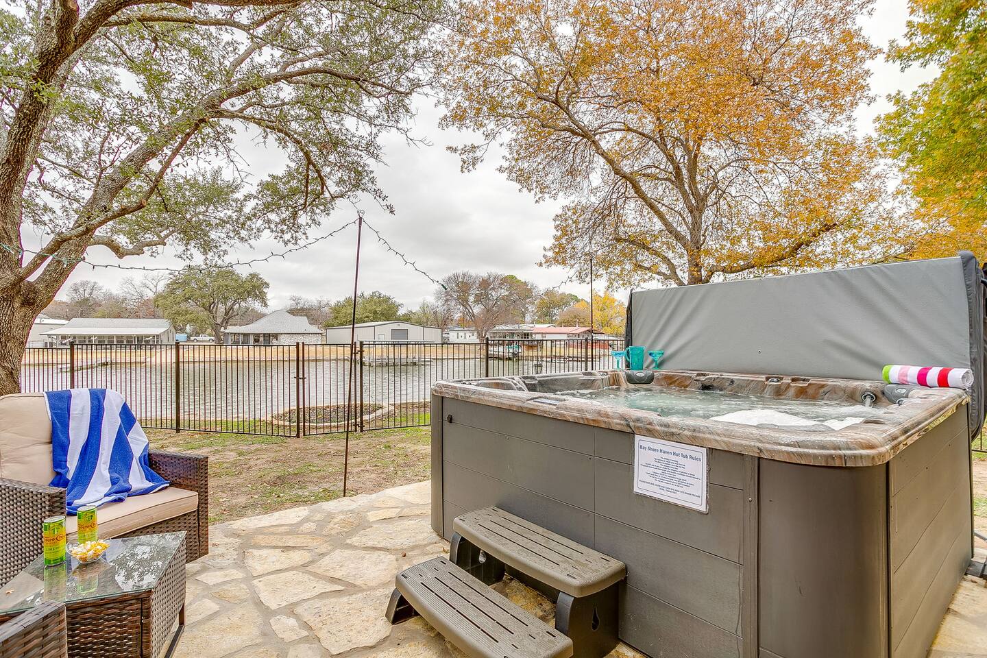 Welcome to Bay Shore Haven, a waterfront lake house located on a peaceful channel of Lake Granbury. This is one of the most desirable channel neighborhoods on the lake: quiet, scenic, and surrounded by beautiful, well-maintained homes. The setting is serene, private, and ideal for a relaxing lake getaway. Waterfront Setting: The calm channel offers gorgeous water views and easy lake access without the noise or traffic of open water. It’s perfect for boating, fishing, floating, or simply enjoying the peaceful surroundings. Guests are welcome to tie up their boat at the private dock. A nearby public boat ramp is available, with details shared after booking. Bedrooms & Bathrooms: - Primary Suite: King bed with ensuite bathroom - Bedroom 2: King bed - Bedroom 3: Two double beds (great for kids or additional guests) - Bedroom 4: King bed The home includes four bedrooms and two full bathrooms, offering a flexible layout for families, couples, or group stays. Living, Kitchen & Dining: The open living area provides plenty of seating for everyone to relax together. The recently remodeled kitchen is fully equipped with modern finishes and generous prep space. - Large island with seating for four - Dining table with seating for eight Game Room & Hot Tub: Downstairs, the fully converted game room features a pool table, recliners, and lounge seating. French doors open directly to the private hot tub, creating an ideal indoor-outdoor entertainment space. Outdoor Spaces: - Covered porch with seating and grill - Large fenced-style backyard with play structure - Fire pit table with seating - Private waterfront dock with seating Work-From-Anywhere: A dedicated workspace includes a desk, chair, monitor, and printer- perfect for remote work or longer stays. Why Guests Love Bay Shore Haven: - Waterfront on a calm channel of Lake Granbury - Quiet, upscale lake neighborhood - Hot tub + game room - Kid-friendly backyard - Spacious layout for groups Whether you’re boating, grilling, working remotely, or relaxing by the water, Bay Shore Haven offers a peaceful and comfortable Lake Granbury vacation home in a truly special setting.
