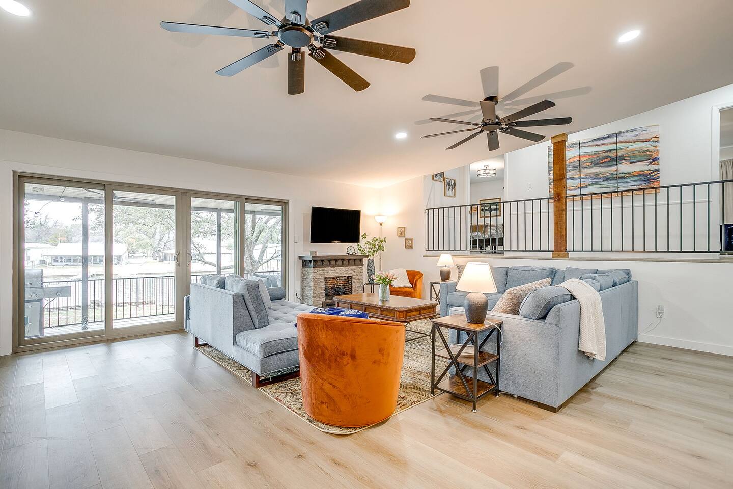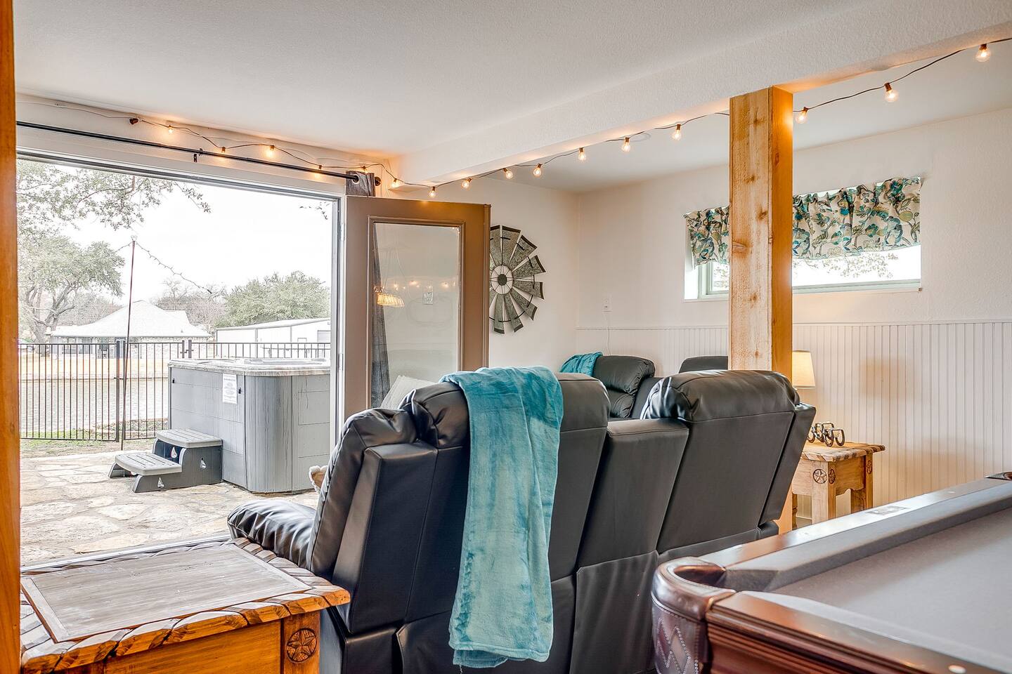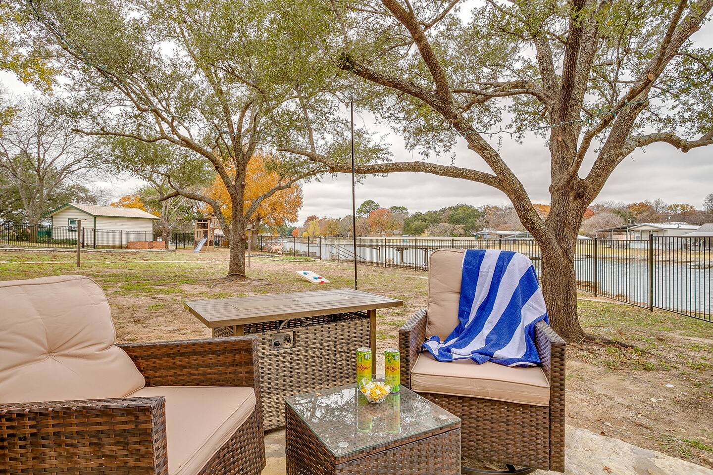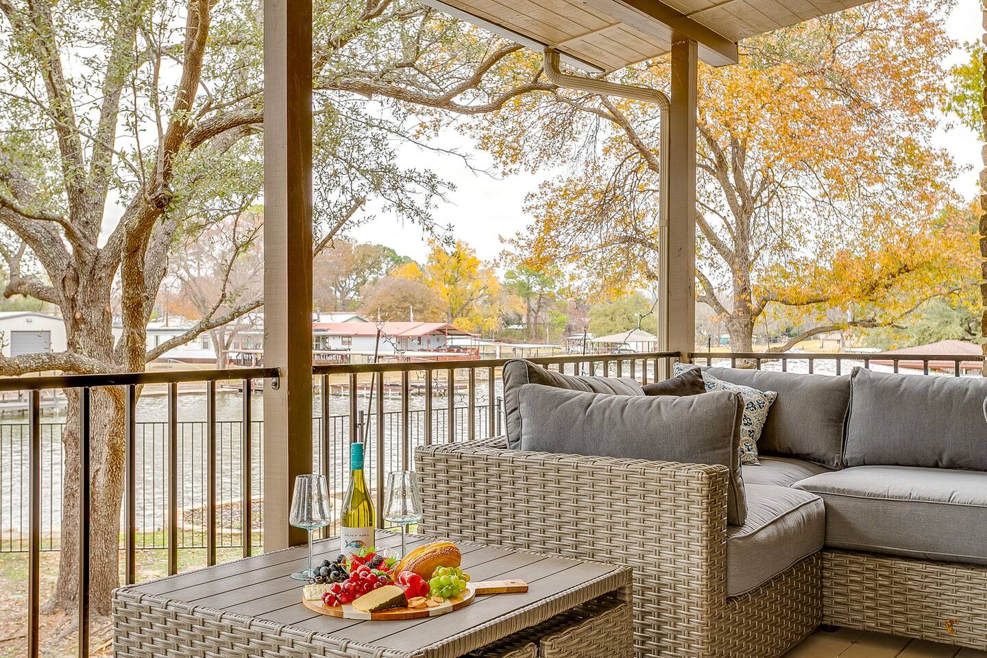 Welcome to Bay Shore Haven, a waterfront lake house located on a peaceful channel of Lake Granbury. This is one of the most desirable channel neighborhoods on the lake: quiet, scenic, and surrounded by beautiful, well-maintained homes. The setting is serene, private, and ideal for a relaxing lake getaway. Waterfront Setting: The calm channel offers gorgeous water views and easy lake access without the noise or traffic of open water. It’s perfect for boating, fishing, floating, or simply enjoying the peaceful surroundings. Guests are welcome to tie up their boat at the private dock. A nearby public boat ramp is available, with details shared after booking. Bedrooms & Bathrooms: - Primary Suite: King bed with ensuite bathroom - Bedroom 2: King bed - Bedroom 3: Two double beds (great for kids or additional guests) - Bedroom 4: King bed The home includes four bedrooms and two full bathrooms, offering a flexible layout for families, couples, or group stays. Living, Kitchen & Dining: The open living area provides plenty of seating for everyone to relax together. The recently remodeled kitchen is fully equipped with modern finishes and generous prep space. - Large island with seating for four - Dining table with seating for eight Game Room & Hot Tub: Downstairs, the fully converted game room features a pool table, recliners, and lounge seating. French doors open directly to the private hot tub, creating an ideal indoor-outdoor entertainment space. Outdoor Spaces: - Covered porch with seating and grill - Large fenced-style backyard with play structure - Fire pit table with seating - Private waterfront dock with seating Work-From-Anywhere: A dedicated workspace includes a desk, chair, monitor, and printer- perfect for remote work or longer stays. Why Guests Love Bay Shore Haven: - Waterfront on a calm channel of Lake Granbury - Quiet, upscale lake neighborhood - Hot tub + game room - Kid-friendly backyard - Spacious layout for groups Whether you’re boating, grilling, working remotely, or relaxing by the water, Bay Shore Haven offers a peaceful and comfortable Lake Granbury vacation home in a truly special setting.