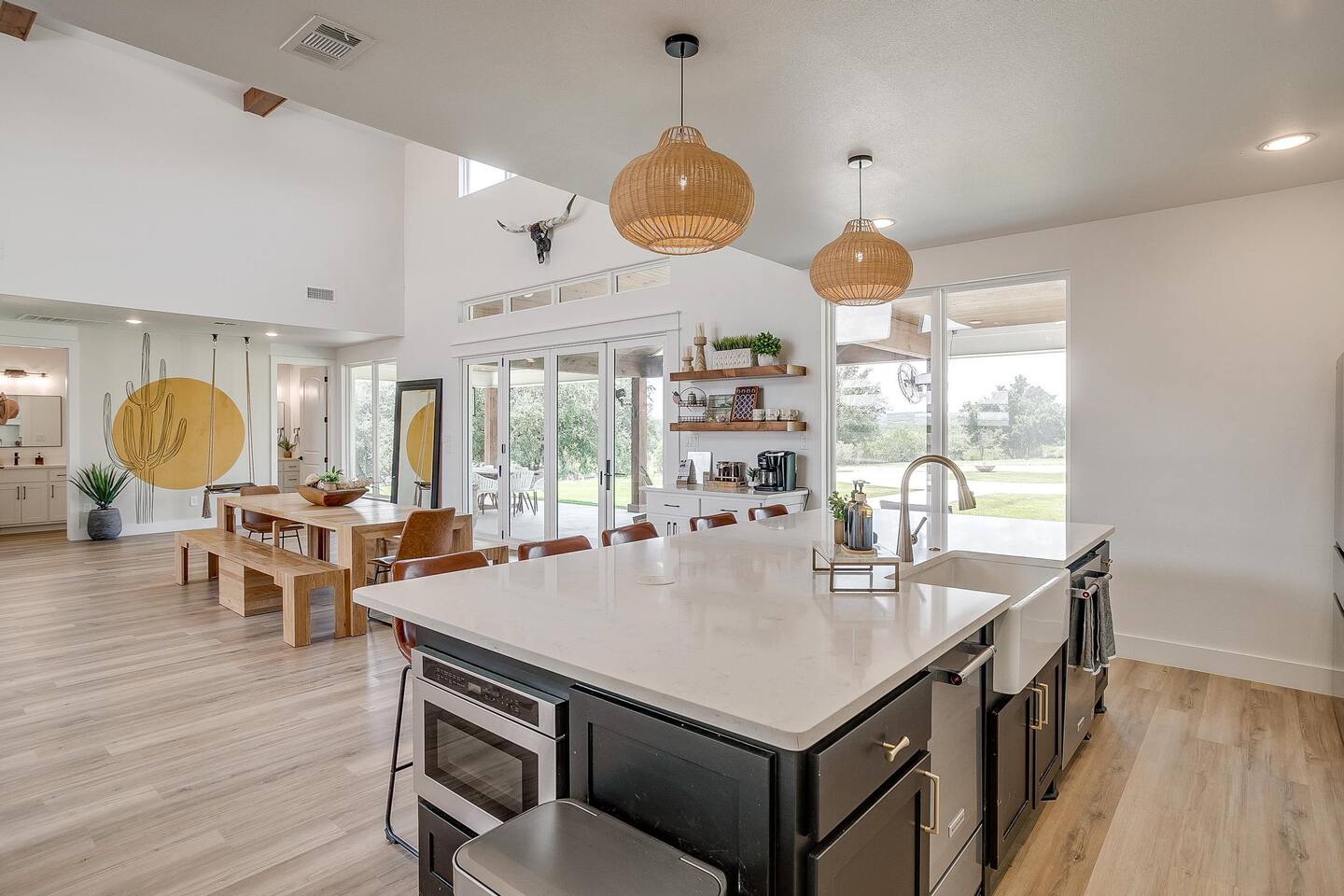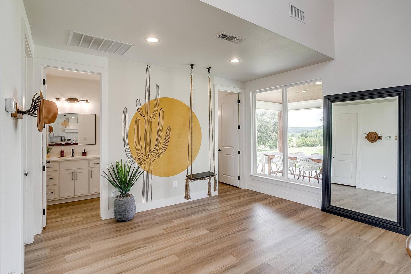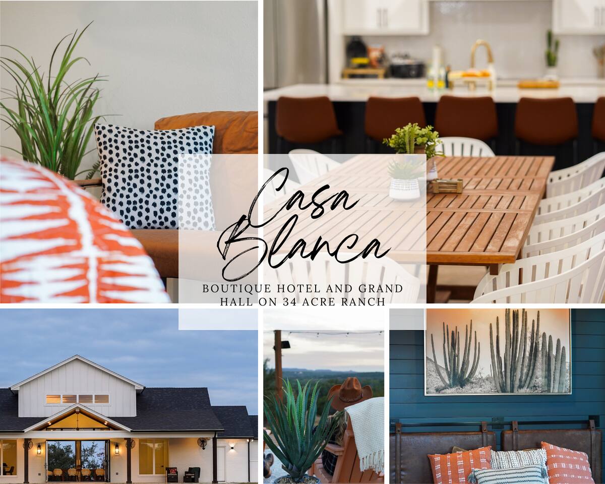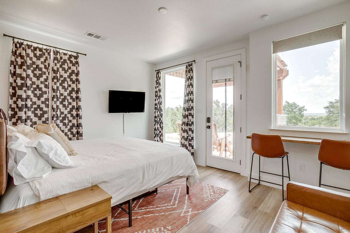 Welcome to our brand new Casa Blanca family getaway on Skyview Ranch! Picture waking up to birdsong, surrounded by a peaceful valley dotted with trees and wide-open skies—all while enjoying the comfort of your own chic King Suite Villa. Casa Blanca sits at the heart of the ranch and includes 5 private King Suite Villas, all under one roof and connected to a spacious Gathering Room. Each suite includes a kitchenette with a mini fridge and freezer, Keurig, microwave, dinnerware, a full en-suite bathroom with walk-in shower, a cozy couch, a dining shelf, and a Smart TV. Casa Blanca can comfortably sleep 16 guests total with plenty of space to relax, connect, and explore. Additional sleeping accommodations: There are 4 twin-size air mattresses stored in the laundry room. These are available for guests to set up as needed—perfect for children or to accommodate additional guests in the Gathering Room or any of the Villas. Between the villas is the true heart of Skyview Ranch: the Grand Hall. This light-filled Gathering Room features a modern kitchen, 10-seat dining table, coffee bar, and two bathrooms—making it the perfect space for your group to relax, cook, and come together. Step outside and enjoy everything Casa Blanca has to offer. Out front, you’ll find two fire pits—one wood-burning and one propane—along with Adirondack seating, perfect for late-night s’mores and stargazing. The backyard features a large grassy area that's ideal for a game of soccer, cornhole, or just letting the kids run free. About 30 feet from the Gathering Room, you’ll find our 36’ swimming pool—fully fenced for safety. The pool deck offers plenty of space to soak up the sun in comfortable loungers, and there’s a propane Weber grill ready for your outdoor meals. Pets: We’re dog-friendly! Up to three well-behaved dogs are welcome with a $75 non-refundable pet fee per dog. Outdoor amenities: Explore 34 acres of natural beauty with hiking trails, wide-open skies, and plenty of room to roam. Enjoy a game of horseshoes or tetherball in the game arena tucked further into the ranch, near our additional cabins (also available to book). Our stocked fishing pond is a peaceful spot to cast a line—bring your poles and relax. If you’re in the mood for an outdoor meal, enjoy our picnic area shaded by trees, complete with string lights and four picnic tables. The wooden swing nearby is a guest favorite for quiet moments and morning coffee. EV Charger: A Tesla EV charger is available and easy to access for all guests. Events: Hosting a celebration, retreat, or gathering? Events are welcome—just reach out for pricing and details. Photography sessions: Skyview Ranch is a stunning setting for family photos. Ask us about our recommended local photographer! Pizza Oven Package: Ask us about our outdoor Pizza Oven package to be able to make your own individual sized 8" pizzas! Nearby attractions: Granbury Historic Square – 4.6 miles Fossil Rim Wildlife Center – 12 miles Dinosaur Valley State Park – 13 miles Big Rocks Park – 15 miles Hard Eight BBQ in Stephenville – 23 miles Wiseman House Chocolates in Hico – 22 miles Fort Worth Stockyards – 64 miles