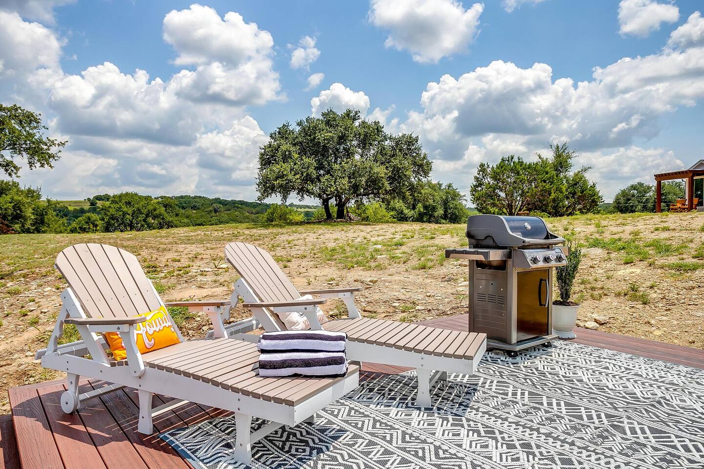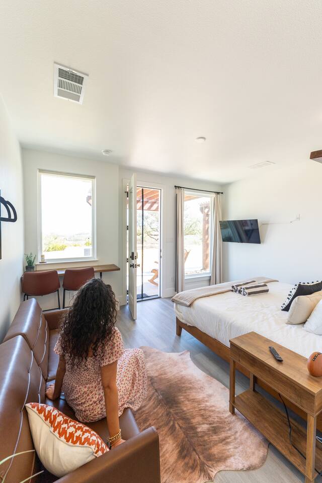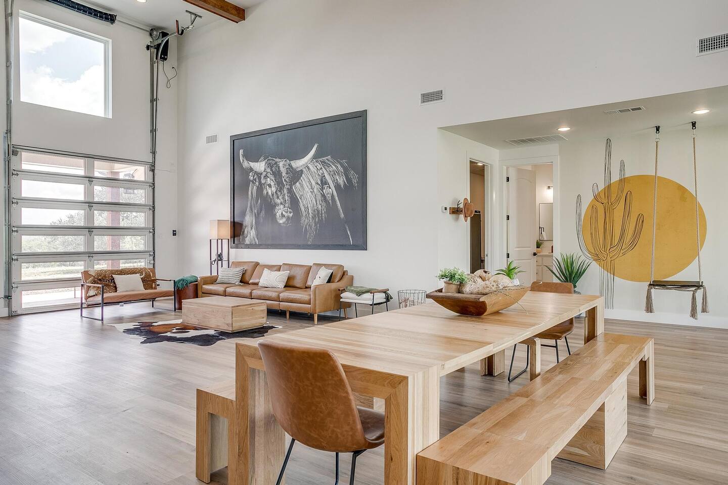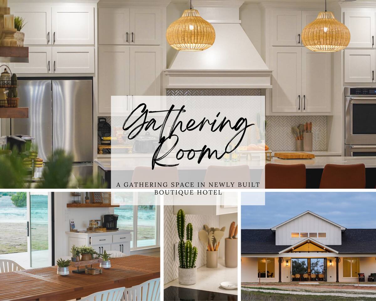 Welcome to our brand new Casa Blanca family getaway on Skyview Ranch! Picture waking up to birdsong, surrounded by a peaceful valley dotted with trees and wide-open skies—all while enjoying the comfort of your own chic King Suite Villa. Casa Blanca sits at the heart of the ranch and includes 5 private King Suite Villas, all under one roof and connected to a spacious Gathering Room. Each suite includes a kitchenette with a mini fridge and freezer, Keurig, microwave, dinnerware, a full en-suite bathroom with walk-in shower, a cozy couch, a dining shelf, and a Smart TV. Casa Blanca can comfortably sleep 16 guests total with plenty of space to relax, connect, and explore. Additional sleeping accommodations: There are 4 twin-size air mattresses stored in the laundry room. These are available for guests to set up as needed—perfect for children or to accommodate additional guests in the Gathering Room or any of the Villas. Between the villas is the true heart of Skyview Ranch: the Grand Hall. This light-filled Gathering Room features a modern kitchen, 10-seat dining table, coffee bar, and two bathrooms—making it the perfect space for your group to relax, cook, and come together. Step outside and enjoy everything Casa Blanca has to offer. Out front, you’ll find two fire pits—one wood-burning and one propane—along with Adirondack seating, perfect for late-night s’mores and stargazing. The backyard features a large grassy area that's ideal for a game of soccer, cornhole, or just letting the kids run free. About 30 feet from the Gathering Room, you’ll find our 36’ swimming pool—fully fenced for safety. The pool deck offers plenty of space to soak up the sun in comfortable loungers, and there’s a propane Weber grill ready for your outdoor meals. Pets: We’re dog-friendly! Up to three well-behaved dogs are welcome with a $75 non-refundable pet fee per dog. Outdoor amenities: Explore 34 acres of natural beauty with hiking trails, wide-open skies, and plenty of room to roam. Enjoy a game of horseshoes or tetherball in the game arena tucked further into the ranch, near our additional cabins (also available to book). Our stocked fishing pond is a peaceful spot to cast a line—bring your poles and relax. If you’re in the mood for an outdoor meal, enjoy our picnic area shaded by trees, complete with string lights and four picnic tables. The wooden swing nearby is a guest favorite for quiet moments and morning coffee. EV Charger: A Tesla EV charger is available and easy to access for all guests. Events: Hosting a celebration, retreat, or gathering? Events are welcome—just reach out for pricing and details. Photography sessions: Skyview Ranch is a stunning setting for family photos. Ask us about our recommended local photographer! Pizza Oven Package: Ask us about our outdoor Pizza Oven package to be able to make your own individual sized 8" pizzas! Nearby attractions: Granbury Historic Square – 4.6 miles Fossil Rim Wildlife Center – 12 miles Dinosaur Valley State Park – 13 miles Big Rocks Park – 15 miles Hard Eight BBQ in Stephenville – 23 miles Wiseman House Chocolates in Hico – 22 miles Fort Worth Stockyards – 64 miles