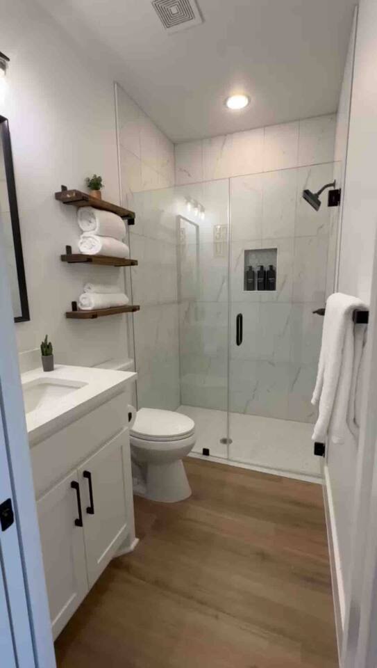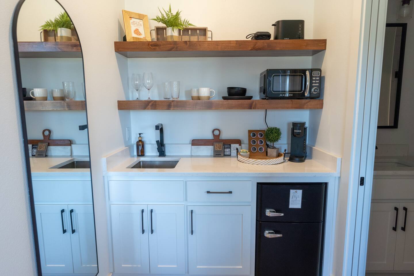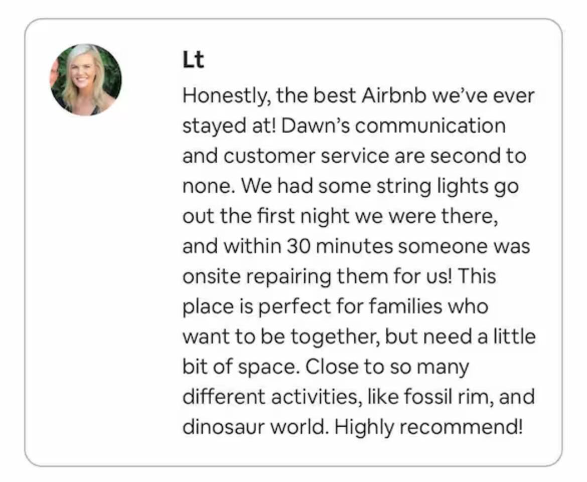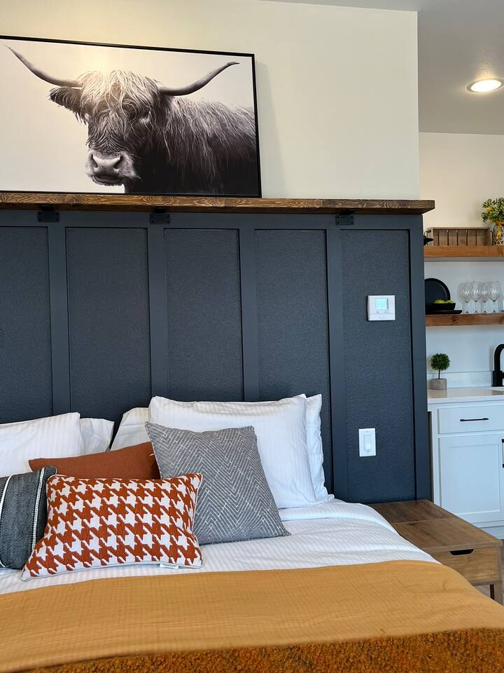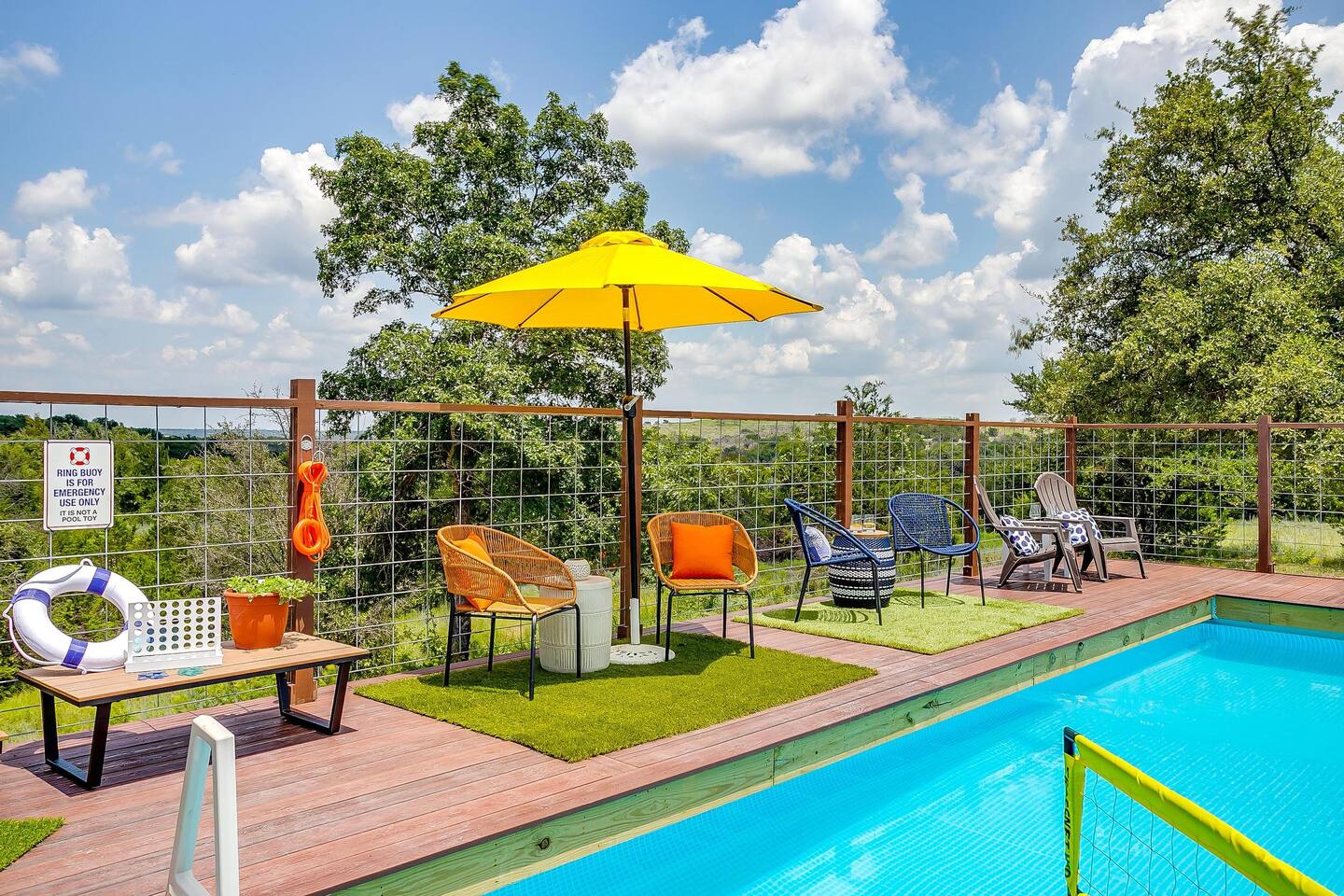 Welcome to our brand new Casa Blanca family getaway on Skyview Ranch! Picture waking up to birdsong, surrounded by a peaceful valley dotted with trees and wide-open skies—all while enjoying the comfort of your own chic King Suite Villa. Casa Blanca sits at the heart of the ranch and includes 5 private King Suite Villas, all under one roof and connected to a spacious Gathering Room. Each suite includes a kitchenette with a mini fridge and freezer, Keurig, microwave, dinnerware, a full en-suite bathroom with walk-in shower, a cozy couch, a dining shelf, and a Smart TV. Casa Blanca can comfortably sleep 16 guests total with plenty of space to relax, connect, and explore. Additional sleeping accommodations: There are 4 twin-size air mattresses stored in the laundry room. These are available for guests to set up as needed—perfect for children or to accommodate additional guests in the Gathering Room or any of the Villas. Between the villas is the true heart of Skyview Ranch: the Grand Hall. This light-filled Gathering Room features a modern kitchen, 10-seat dining table, coffee bar, and two bathrooms—making it the perfect space for your group to relax, cook, and come together. Step outside and enjoy everything Casa Blanca has to offer. Out front, you’ll find two fire pits—one wood-burning and one propane—along with Adirondack seating, perfect for late-night s’mores and stargazing. The backyard features a large grassy area that's ideal for a game of soccer, cornhole, or just letting the kids run free. About 30 feet from the Gathering Room, you’ll find our 36’ swimming pool—fully fenced for safety. The pool deck offers plenty of space to soak up the sun in comfortable loungers, and there’s a propane Weber grill ready for your outdoor meals. Pets: We’re dog-friendly! Up to three well-behaved dogs are welcome with a $75 non-refundable pet fee per dog. Outdoor amenities: Explore 34 acres of natural beauty with hiking trails, wide-open skies, and plenty of room to roam. Enjoy a game of horseshoes or tetherball in the game arena tucked further into the ranch, near our additional cabins (also available to book). Our stocked fishing pond is a peaceful spot to cast a line—bring your poles and relax. If you’re in the mood for an outdoor meal, enjoy our picnic area shaded by trees, complete with string lights and four picnic tables. The wooden swing nearby is a guest favorite for quiet moments and morning coffee. EV Charger: A Tesla EV charger is available and easy to access for all guests. Events: Hosting a celebration, retreat, or gathering? Events are welcome—just reach out for pricing and details. Photography sessions: Skyview Ranch is a stunning setting for family photos. Ask us about our recommended local photographer! Pizza Oven Package: Ask us about our outdoor Pizza Oven package to be able to make your own individual sized 8" pizzas! Nearby attractions: Granbury Historic Square – 4.6 miles Fossil Rim Wildlife Center – 12 miles Dinosaur Valley State Park – 13 miles Big Rocks Park – 15 miles Hard Eight BBQ in Stephenville – 23 miles Wiseman House Chocolates in Hico – 22 miles Fort Worth Stockyards – 64 miles