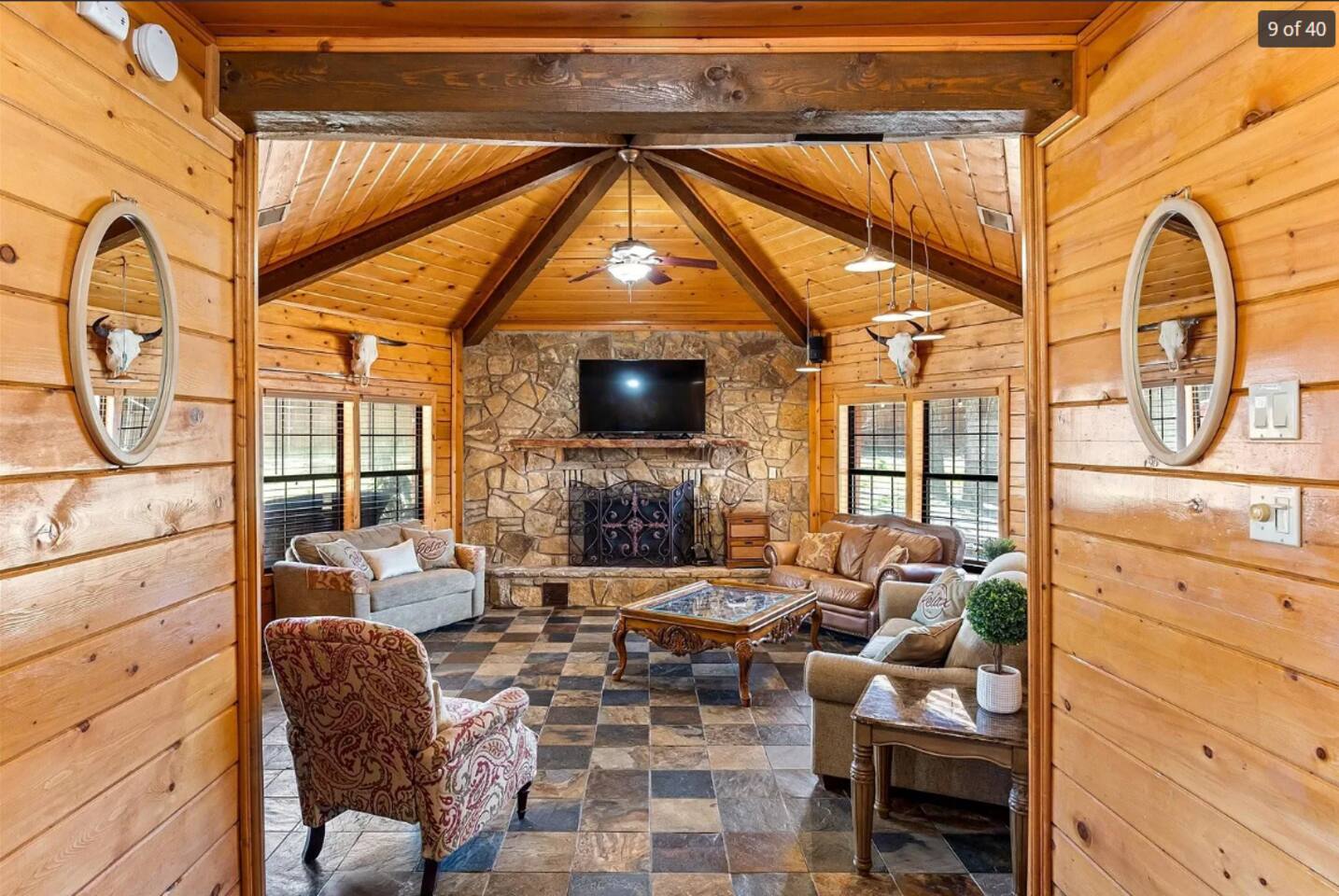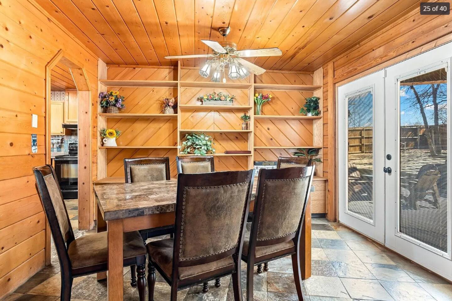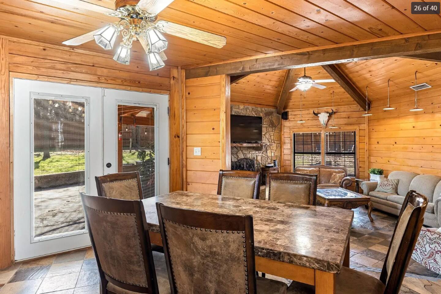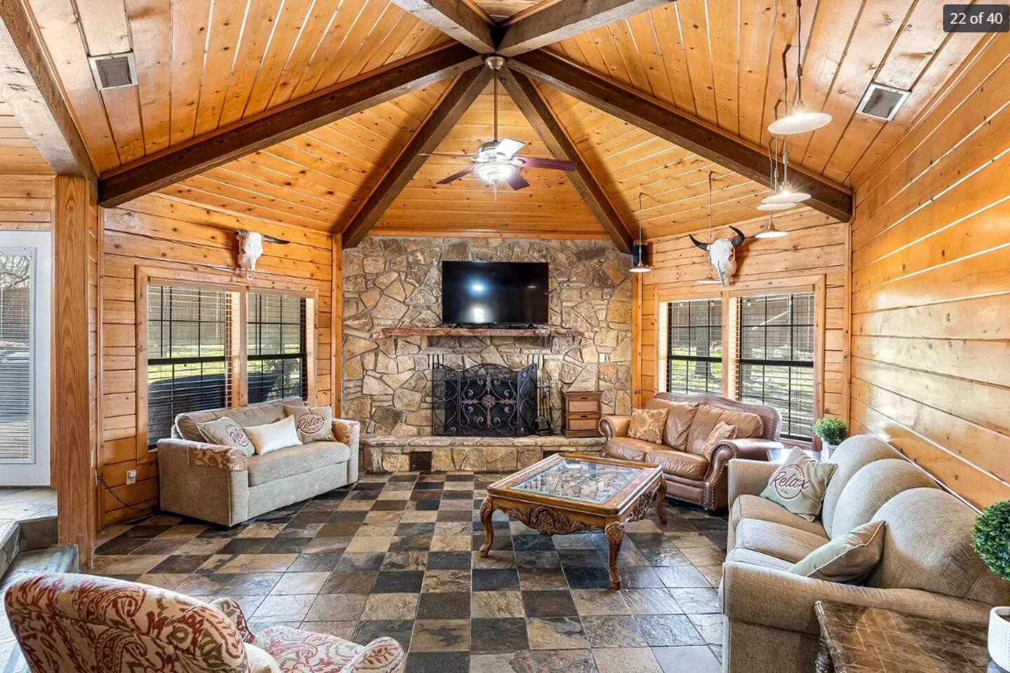 Escape to Double D Lodge, a cozy log cabin just minutes from Granbury Square. Relax under shady oaks, unwind on the porch swing, or enjoy the game room with ping-pong and air hockey. With four queen bedrooms, two dining areas, a large backyard with a hot tub, and pet-friendly charm, this peaceful home blends rustic comfort with family fun near shops, parks, and local dining.