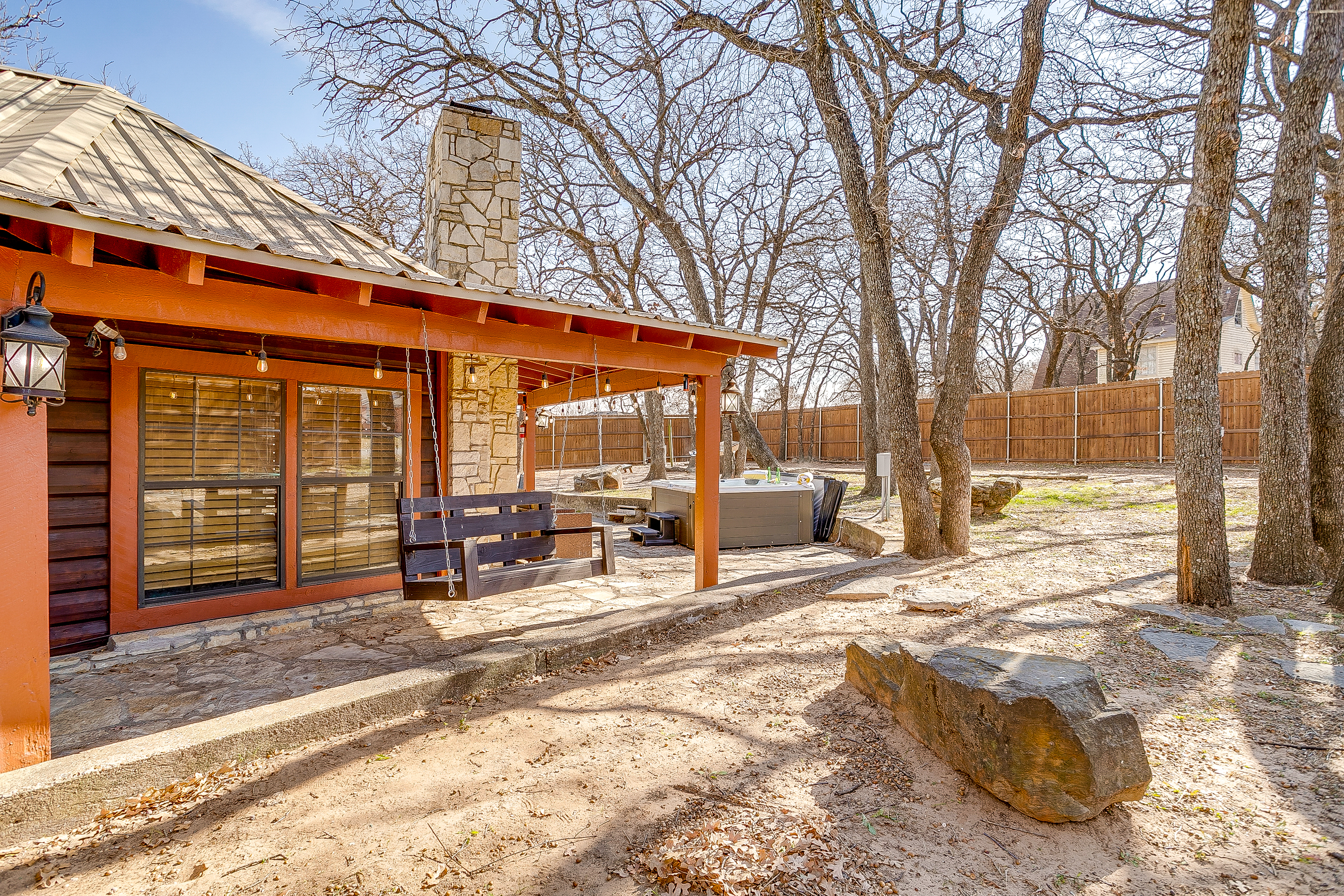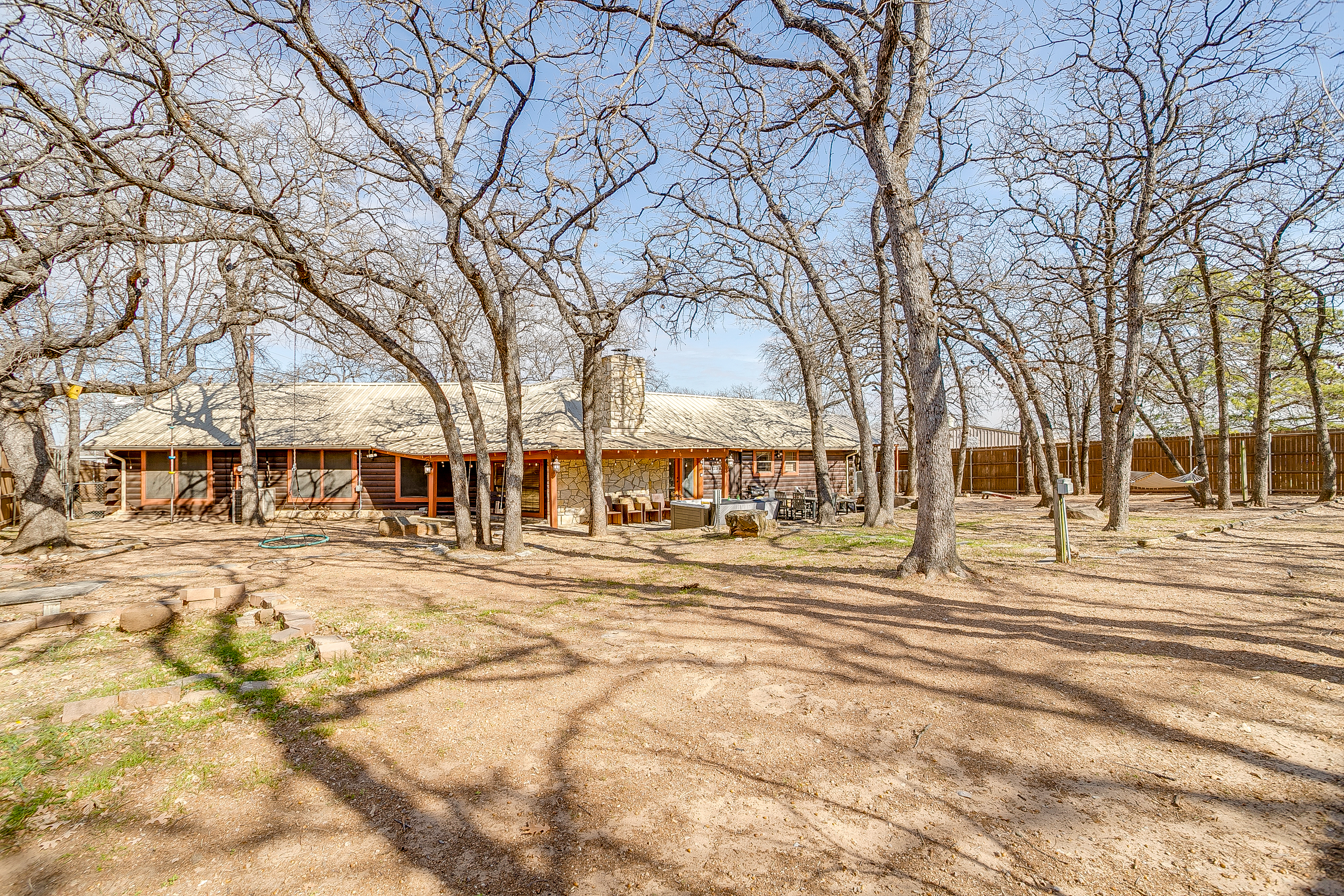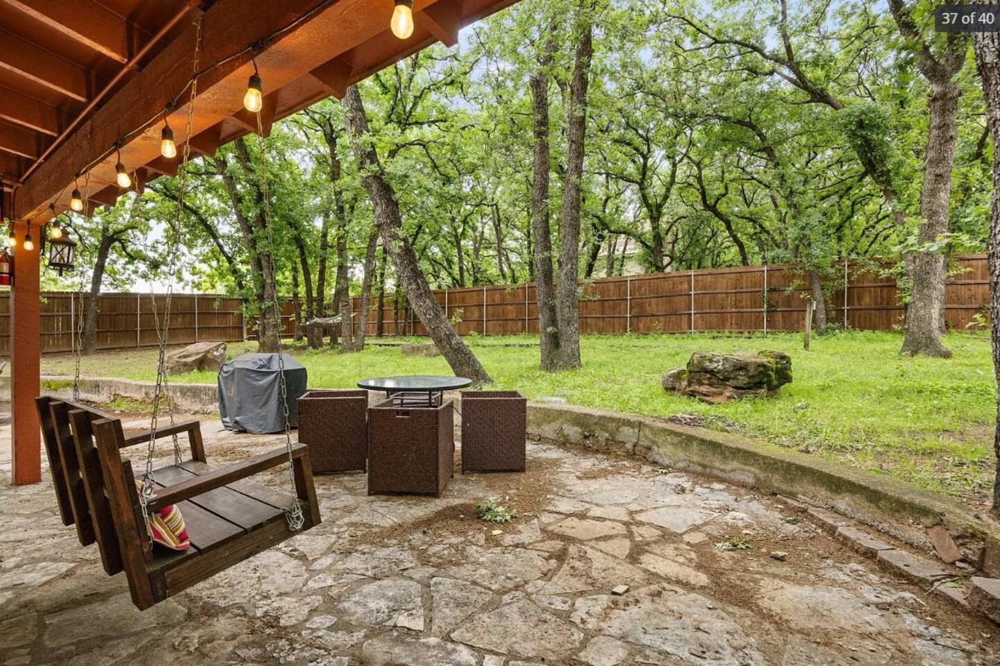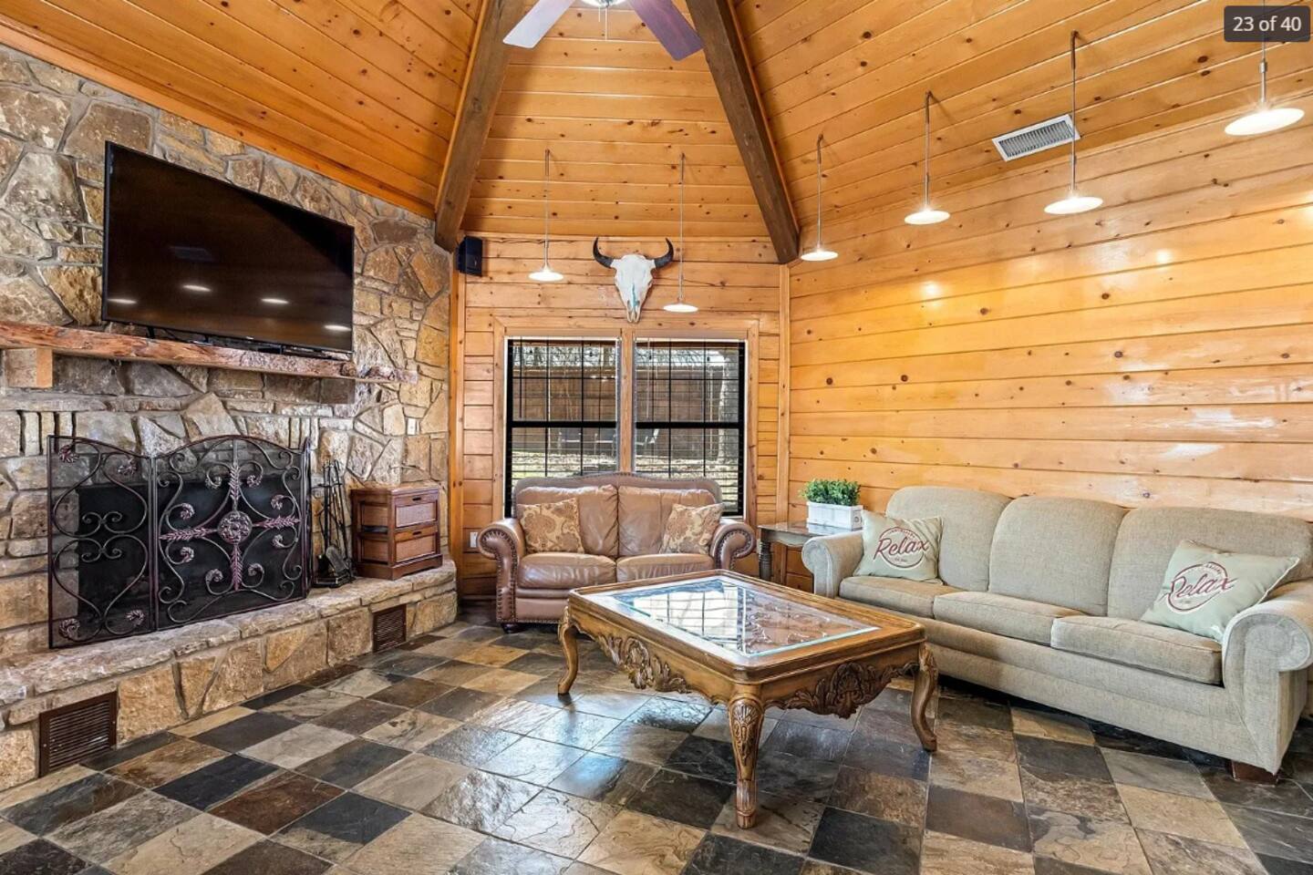 Escape to Double D Lodge, a cozy log cabin just minutes from Granbury Square. Relax under shady oaks, unwind on the porch swing, or enjoy the game room with ping-pong and air hockey. With four queen bedrooms, two dining areas, a large backyard with a hot tub, and pet-friendly charm, this peaceful home blends rustic comfort with family fun near shops, parks, and local dining.