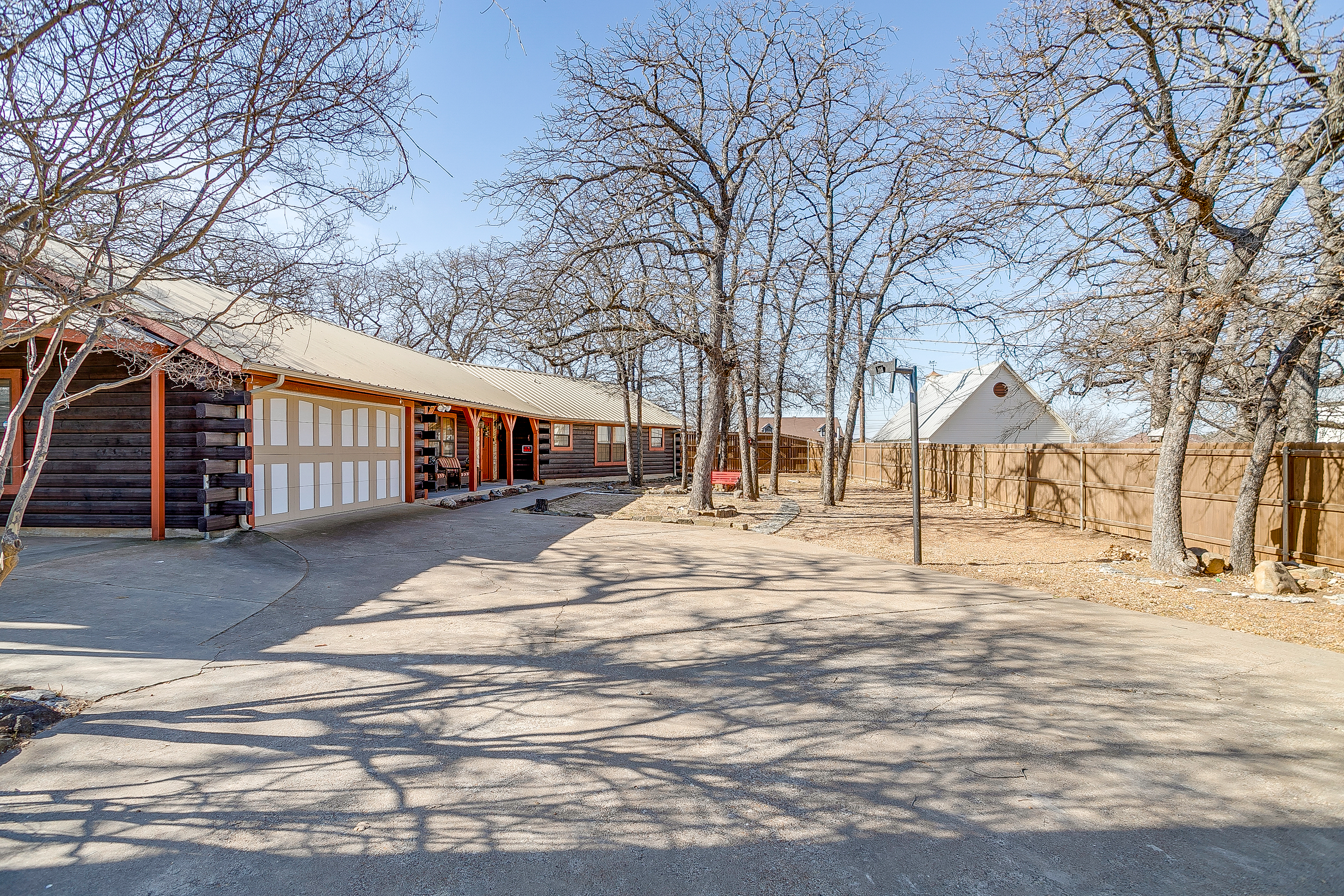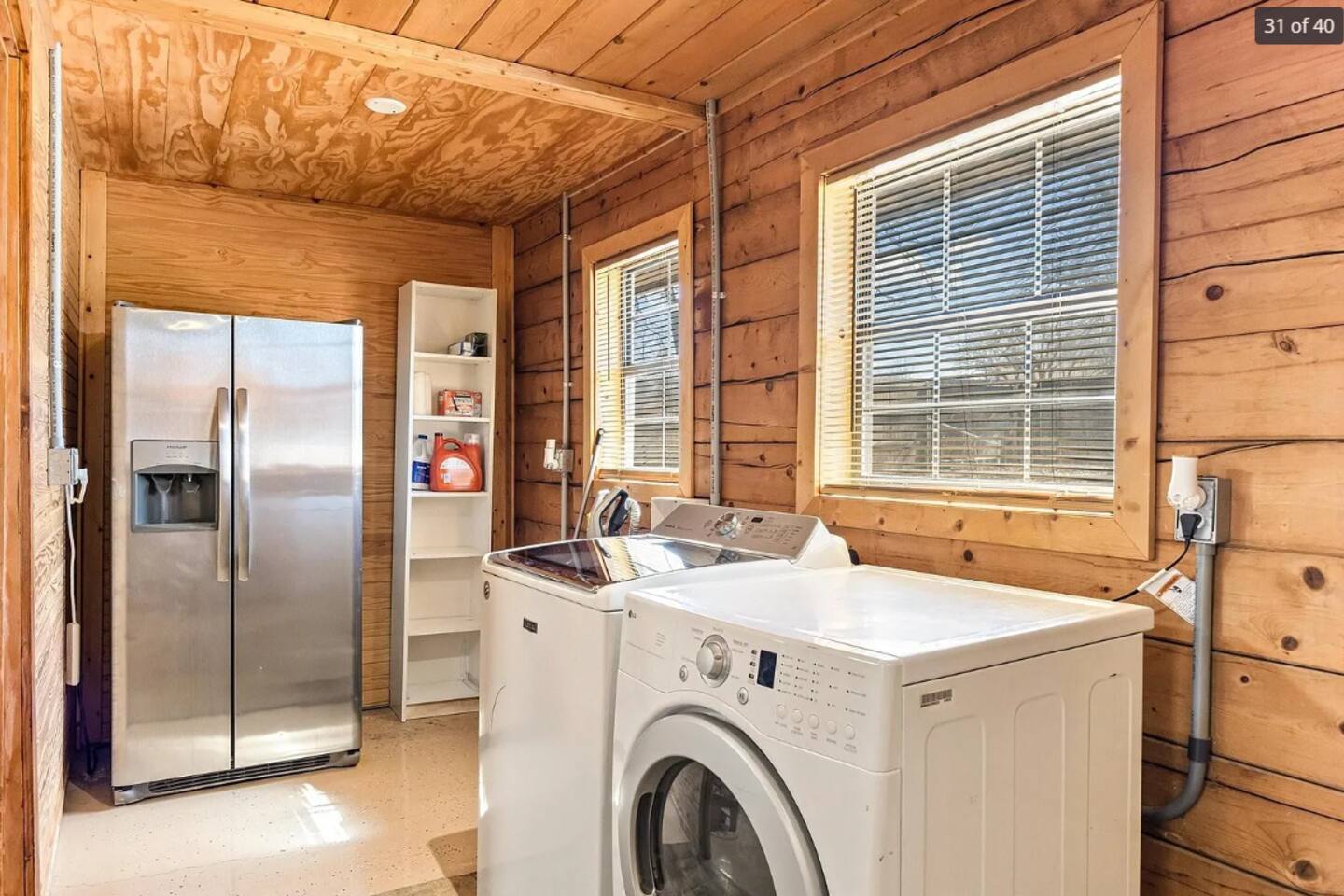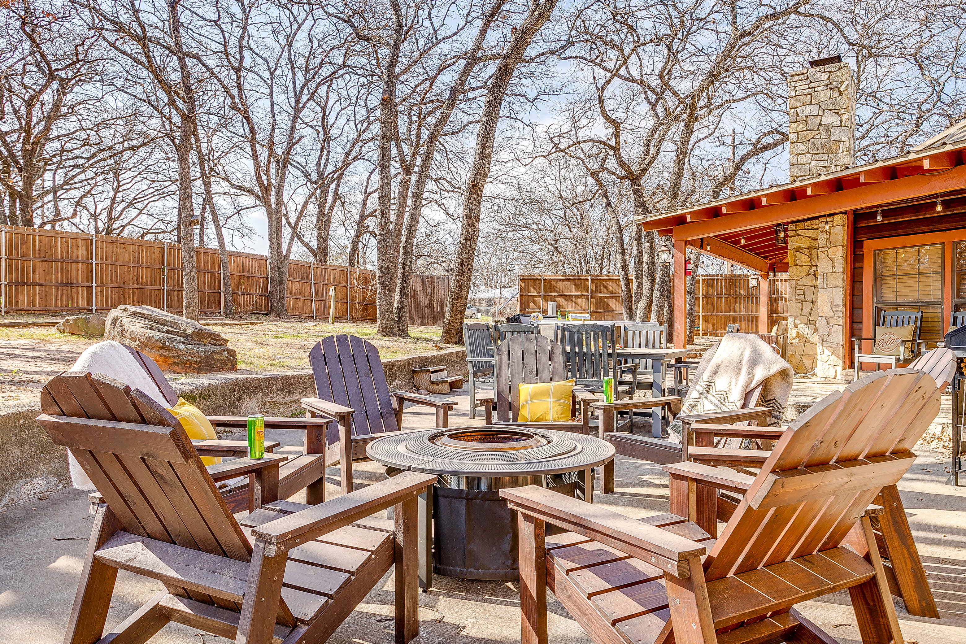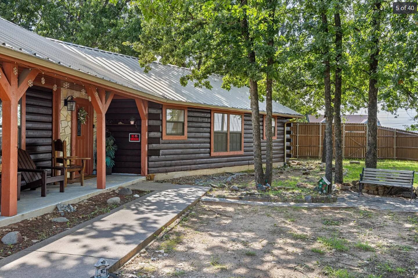 Welcome to Double D Lodge, a warm and inviting log cabin retreat nestled beneath tall shade trees in a quiet Granbury neighborhood just minutes from the Historic Square. This home is perfect for families and small groups who want to relax, play, and reconnect in a peaceful, cozy setting. When you arrive, you’ll find a spacious front yard with a charming porch and seating area, perfect for morning coffee. The driveway accommodates up to four vehicles, plus a carport for one large vehicle. Inside, the living room features comfortable seating for eight, two sofas, a chair, and a large smart TV for movie nights. (The fireplace is decorative only and not for guest use.) To the left of the entryway, a dining area offers open shelving, family games, and a table for shared meals. A second dining nook off the kitchen provides seating for four. The kitchen is fully equipped with everything you need for your stay, including full-size appliances, cookware, utensils, and dinnerware. There’s also a smaller refrigerator in the kitchen and an additional full-size refrigerator in the adjoining laundry area for extra storage. Enjoy a morning cup at the dedicated coffee bar, featuring a Keurig, drip coffee maker, and complimentary K-Cups, creamers, and sugars. Guests also have access to a full washer and dryer with starter laundry supplies provided. Off the laundry room, the converted garage serves as a spacious game room with epoxy floors, a full-size ping-pong table, air hockey table, a train table for children, and oscillating fans for comfort. All four bedrooms feature queen beds, nightstands, and full-size closets. The primary suite includes a TV, ample closet space, and an ensuite bathroom with a tub, shower, and vanity. The remaining bedrooms are comfortably furnished with cozy linens and simple, welcoming decor. Step outside to the large backyard shaded by mature trees. The covered porch features a swing, Weber propane grill, fire pit table, hammock, and plenty of seating. Cornhole boards are also available for outdoor fun. This home is pet-friendly for one well-behaved dog with a $125 pet fee. Please include your dog in your reservation so the fee is applied automatically. Unauthorized pets will incur a $250 fee. Additional dogs may be approved upon request. Double D Lodge is just five minutes from Granbury Square, where you’ll find local restaurants, boutiques, and family-friendly attractions. Be sure to stop by nearby favorites Frog Juice and Vampyre Penguin for a sweet treat. Whether you’re relaxing on the porch, laughing around the fire pit, or enjoying a game night inside, Double D Lodge offers a cozy retreat with all the comforts of home.