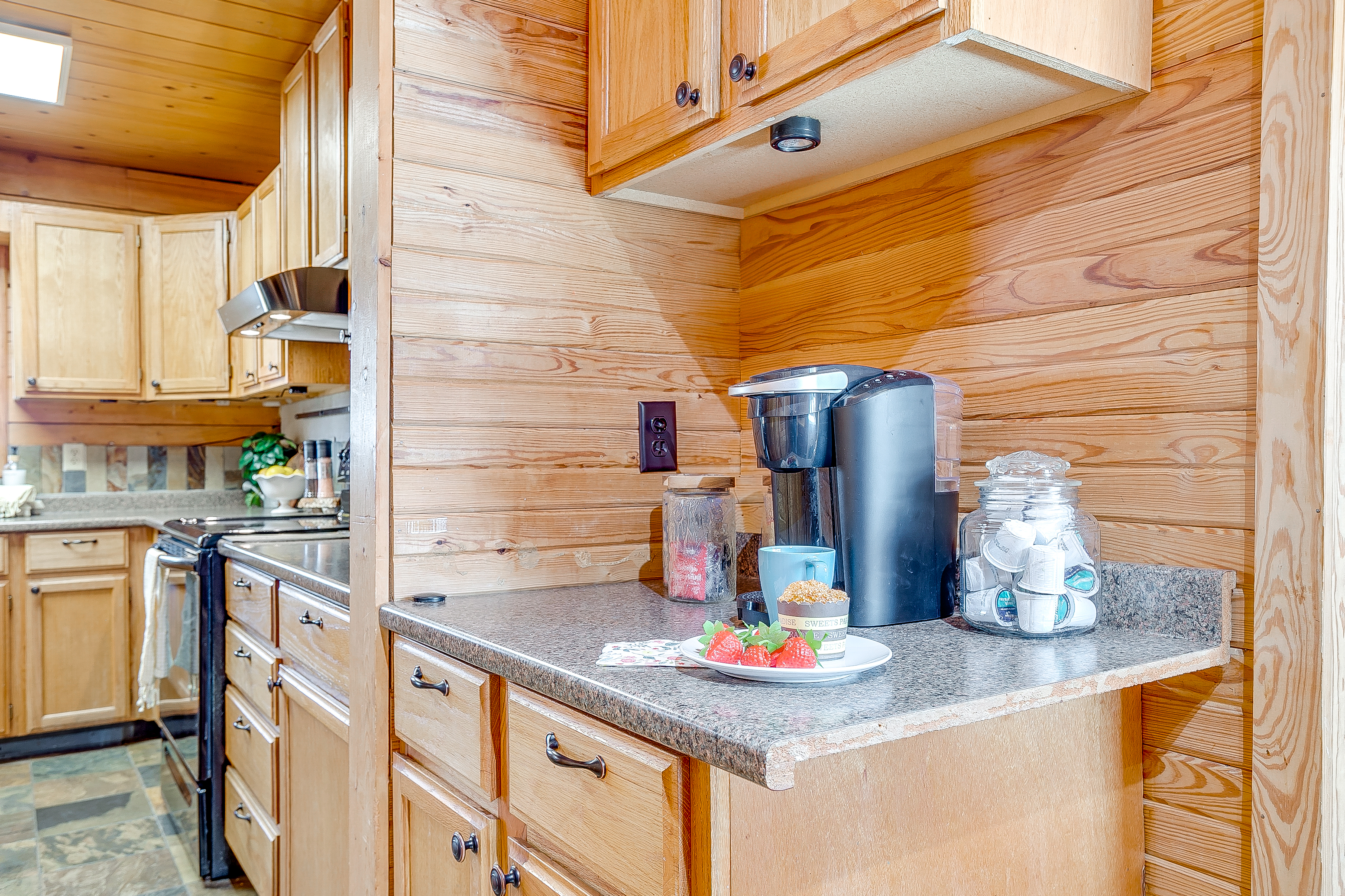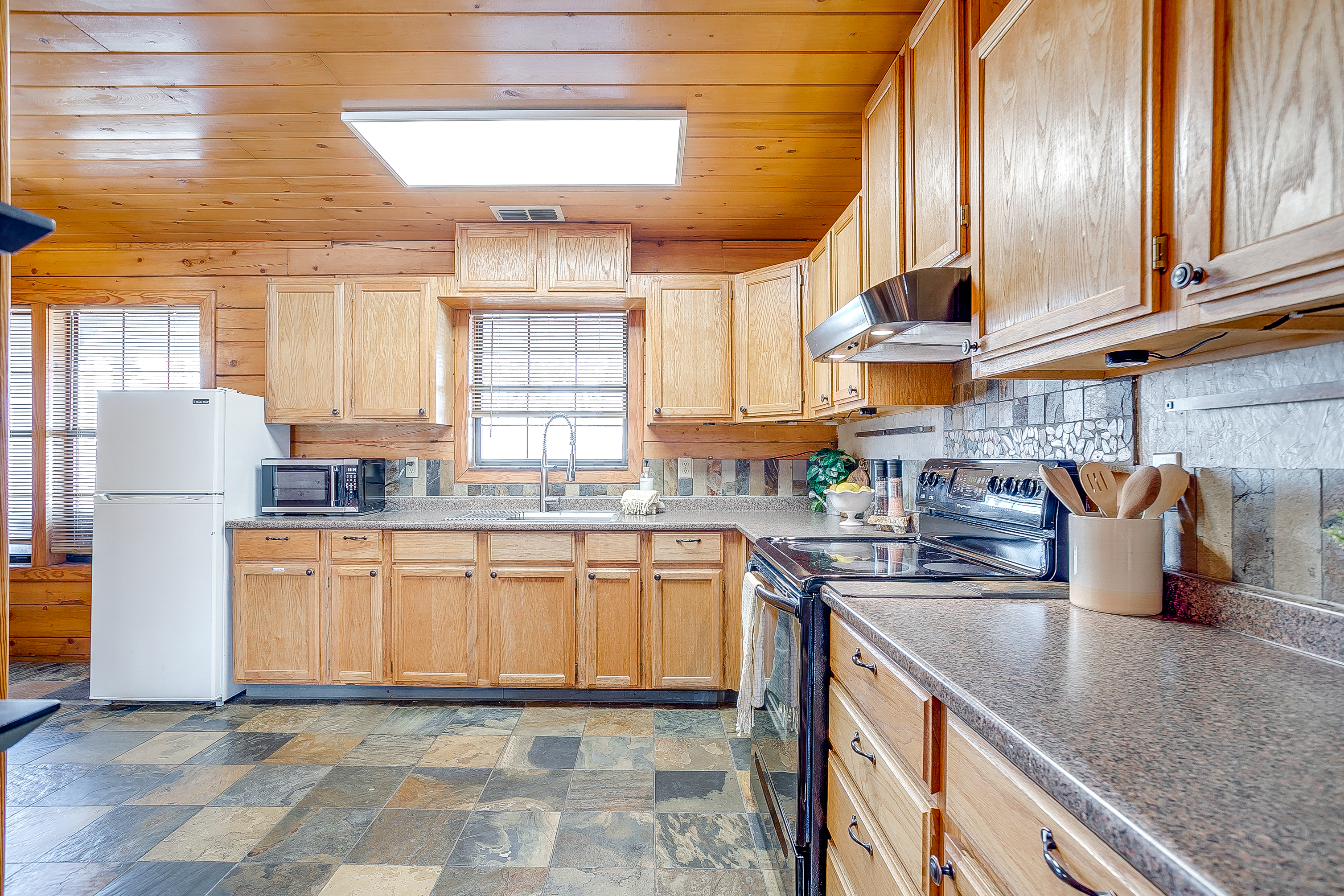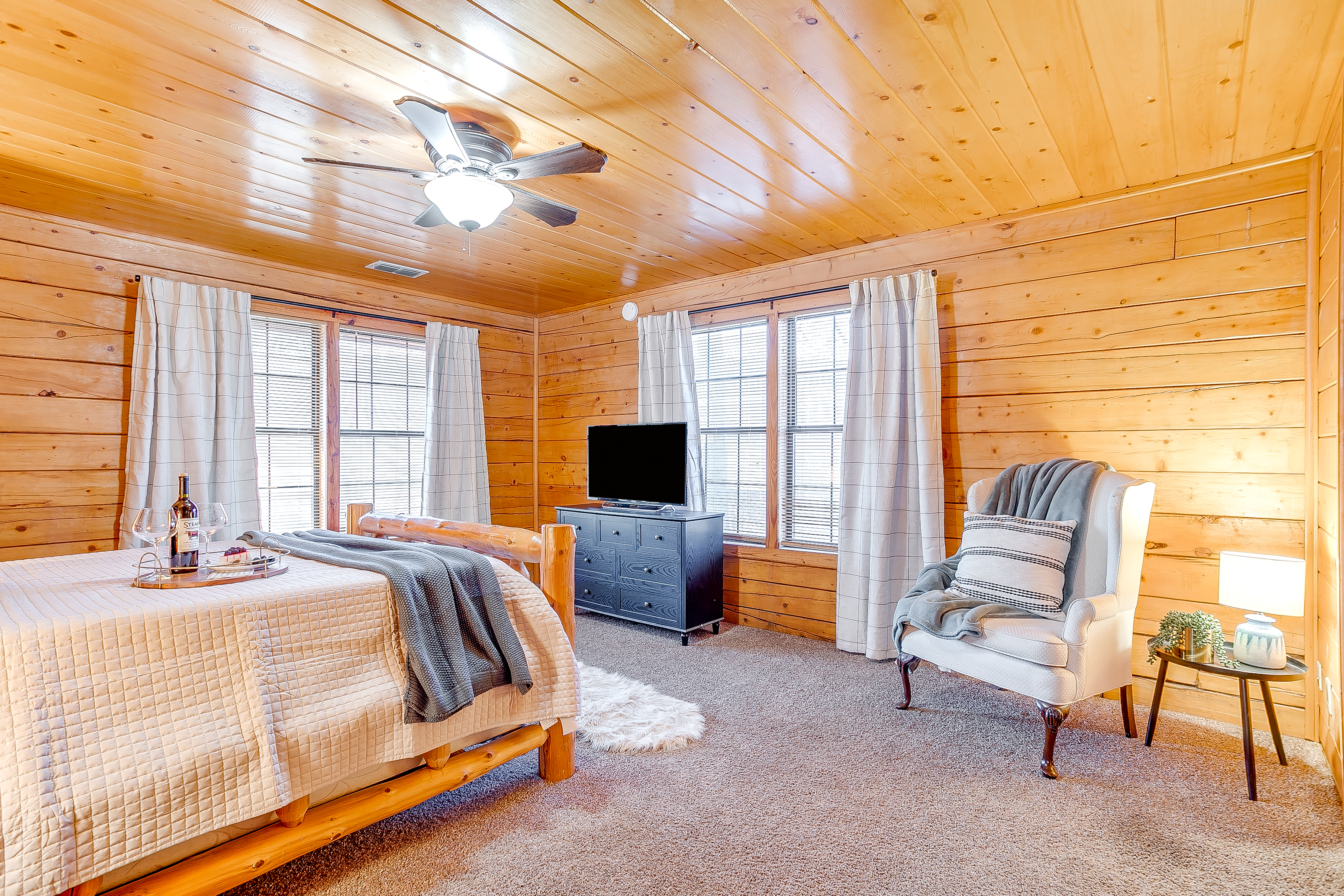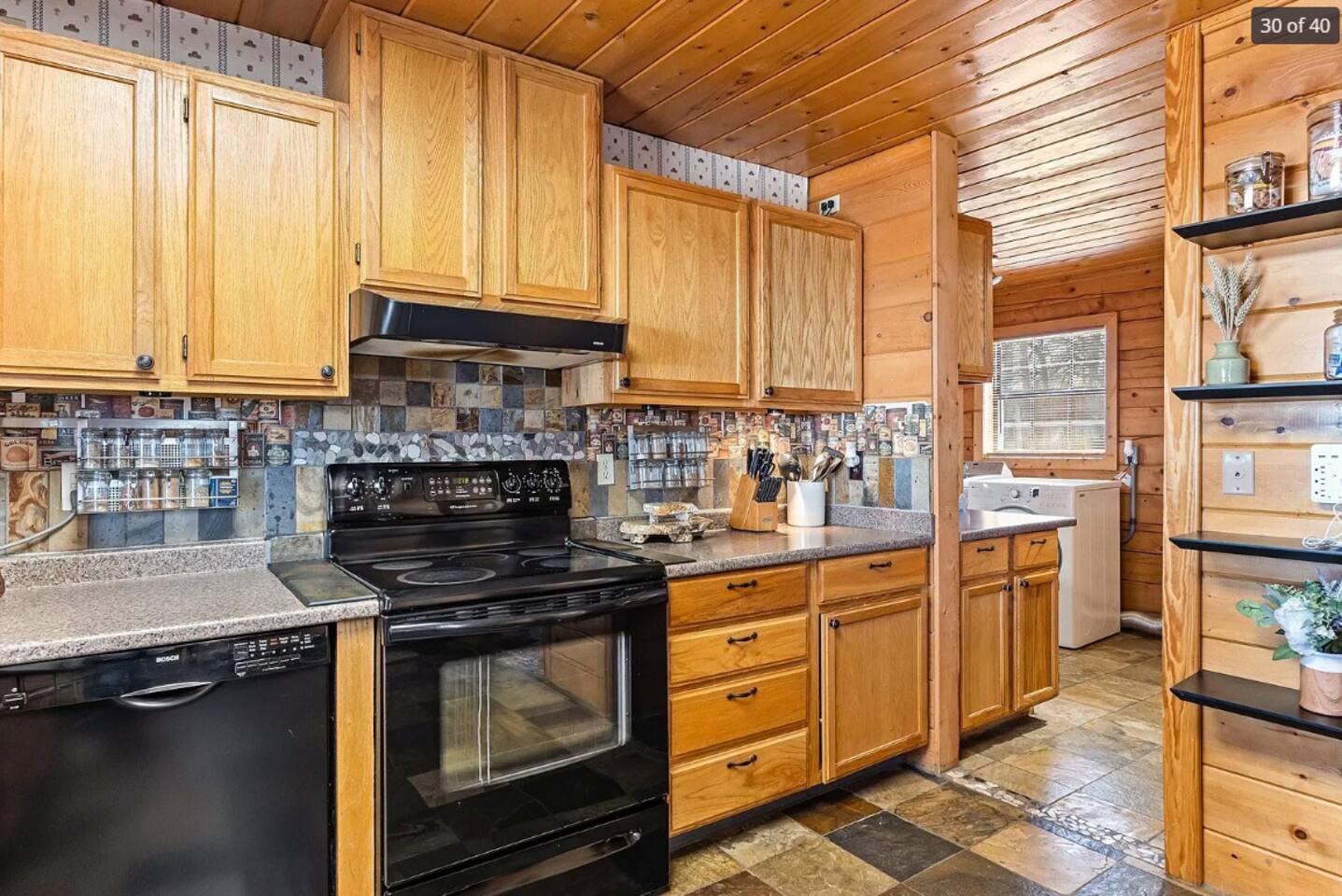 Welcome to Double D Lodge, a warm and inviting log cabin retreat nestled beneath tall shade trees in a quiet Granbury neighborhood just minutes from the Historic Square. This home is perfect for families and small groups who want to relax, play, and reconnect in a peaceful, cozy setting. When you arrive, you’ll find a spacious front yard with a charming porch and seating area, perfect for morning coffee. The driveway accommodates up to four vehicles, plus a carport for one large vehicle. Inside, the living room features comfortable seating for eight, two sofas, a chair, and a large smart TV for movie nights. (The fireplace is decorative only and not for guest use.) To the left of the entryway, a dining area offers open shelving, family games, and a table for shared meals. A second dining nook off the kitchen provides seating for four. The kitchen is fully equipped with everything you need for your stay, including full-size appliances, cookware, utensils, and dinnerware. There’s also a smaller refrigerator in the kitchen and an additional full-size refrigerator in the adjoining laundry area for extra storage. Enjoy a morning cup at the dedicated coffee bar, featuring a Keurig, drip coffee maker, and complimentary K-Cups, creamers, and sugars. Guests also have access to a full washer and dryer with starter laundry supplies provided. Off the laundry room, the converted garage serves as a spacious game room with epoxy floors, a full-size ping-pong table, air hockey table, a train table for children, and oscillating fans for comfort. All four bedrooms feature queen beds, nightstands, and full-size closets. The primary suite includes a TV, ample closet space, and an ensuite bathroom with a tub, shower, and vanity. The remaining bedrooms are comfortably furnished with cozy linens and simple, welcoming decor. Step outside to the large backyard shaded by mature trees. The covered porch features a swing, Weber propane grill, fire pit table, hammock, and plenty of seating. Cornhole boards are also available for outdoor fun. This home is pet-friendly for one well-behaved dog with a $125 pet fee. Please include your dog in your reservation so the fee is applied automatically. Unauthorized pets will incur a $250 fee. Additional dogs may be approved upon request. Double D Lodge is just five minutes from Granbury Square, where you’ll find local restaurants, boutiques, and family-friendly attractions. Be sure to stop by nearby favorites Frog Juice and Vampyre Penguin for a sweet treat. Whether you’re relaxing on the porch, laughing around the fire pit, or enjoying a game night inside, Double D Lodge offers a cozy retreat with all the comforts of home.