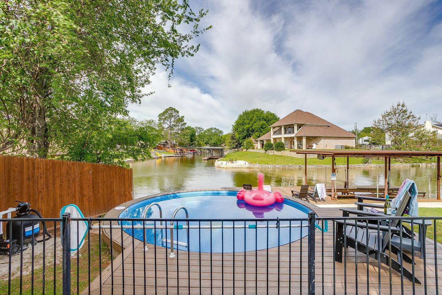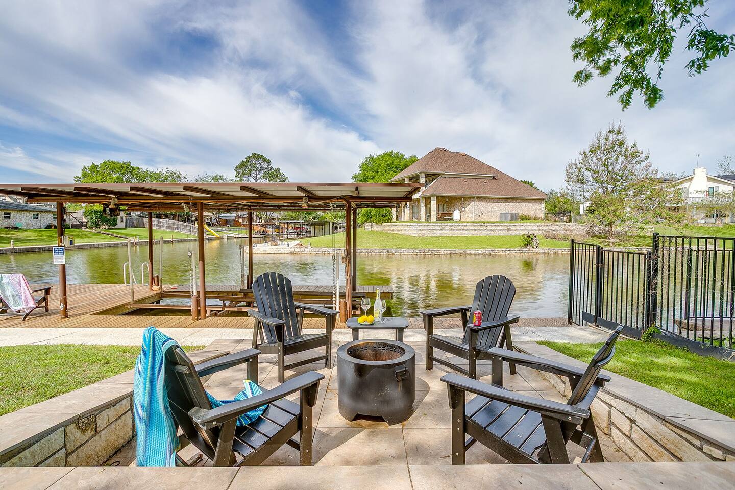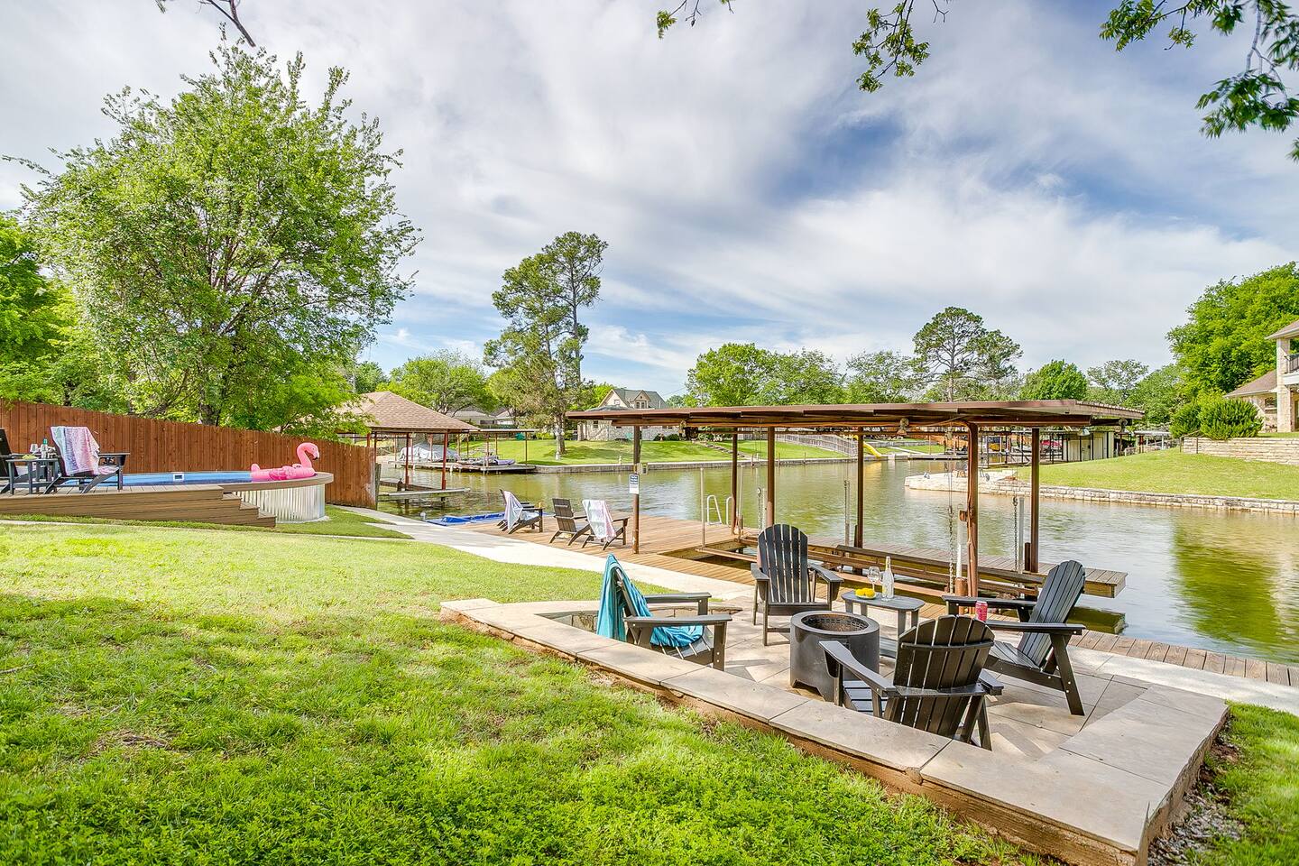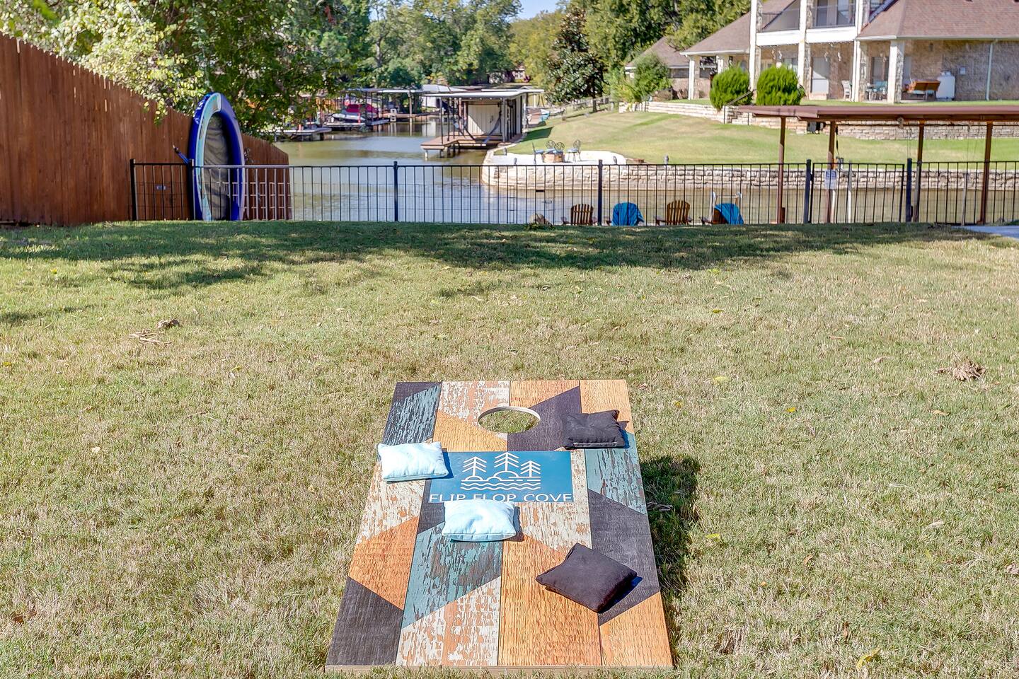 Welcome to Flip-Flop Cove – A Relaxing Canal-Side Getaway on Lake Granbury Flip-Flop Cove is a comfortable and beautifully updated retreat with a main house and guest house, perfect for family trips, couples’ weekends, or peaceful lake escapes. Located on a quiet canal just off Lake Granbury, the home offers the perfect mix of indoor comfort and outdoor enjoyment. Sleeping Arrangements Main House - Primary Bedroom: King bed, Queen Murphy bed, ensuite spa-style shower, walk-in closet, and 55" Smart TV - Second Bedroom: King bed, 55" Smart TV, walk-in closet, and access to a shared bathroom with Jacuzzi tub and shower Guest House - Third Bedroom: Queen bed, full private bathroom, walk-in closet, 55" Smart TV, and private workstation Living & Lounge Spaces - Spacious living room with a 75" Smart TV, Bluetooth soundbar, cozy seating, and a dedicated workstation with printer - Fully stocked kitchen with island seating, standard coffee maker and single-cup brewer, and all the tools you need to cook meals at home - Dining area with seating for your group to gather and enjoy meals together Outdoor Features - Located on a calm canal with private dock access—great for fishing, relaxing, or tying up a boat - Lakeside fire pit for evening conversations under the stars - Private hot tub overlooking the water, perfect for unwinding after a day on the lake - Patio with outdoor dining, a griddle, and a comfortable seating area Technology and Connectivity - High-speed Wi-Fi available throughout the property - Smart TVs in every room with streaming and casting capabilities Nature and Wildlife The backyard offers beautiful views and regular visits from ducks, turtles, fish, and other wildlife. Please observe them from a distance and avoid feeding them. Coffee and Kitchen Essentials The coffee bar includes complimentary pods, grounds, creamer, and tea. The kitchen is fully stocked with cookware, dinnerware, utensils, and more so you can feel right at home. For entertainment We’ve included an air hockey table, ping pong table, plus outdoor favorites like giant Jenga, giant Connect Four, and Cornhole boards — perfect for family fun and group gatherings!