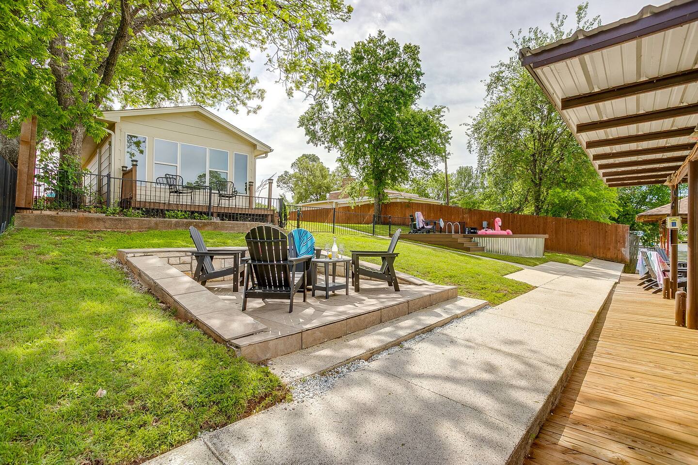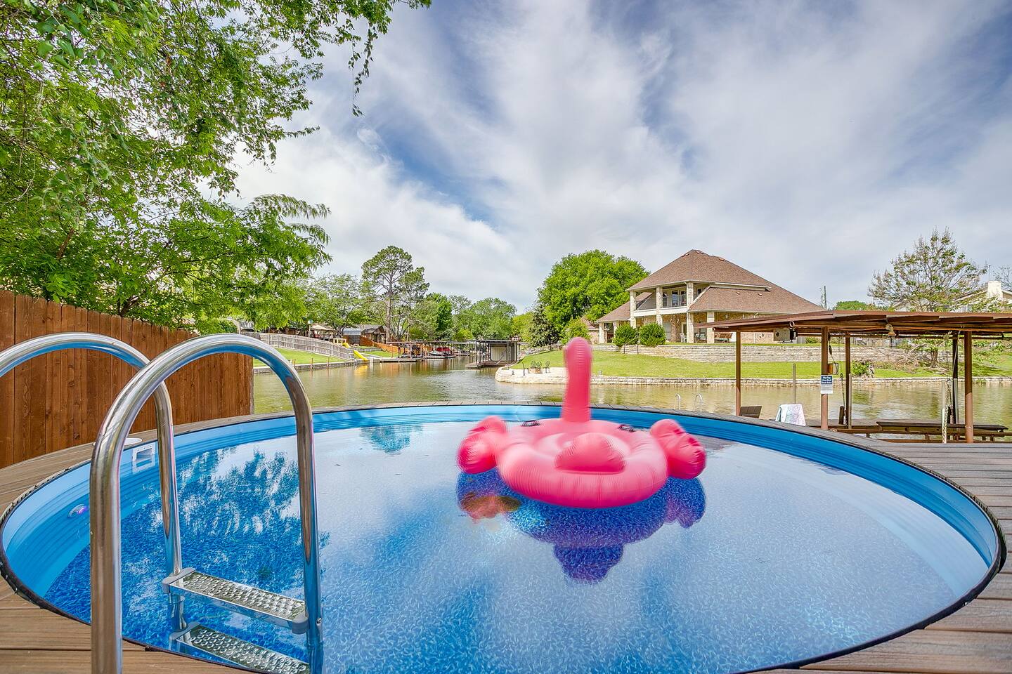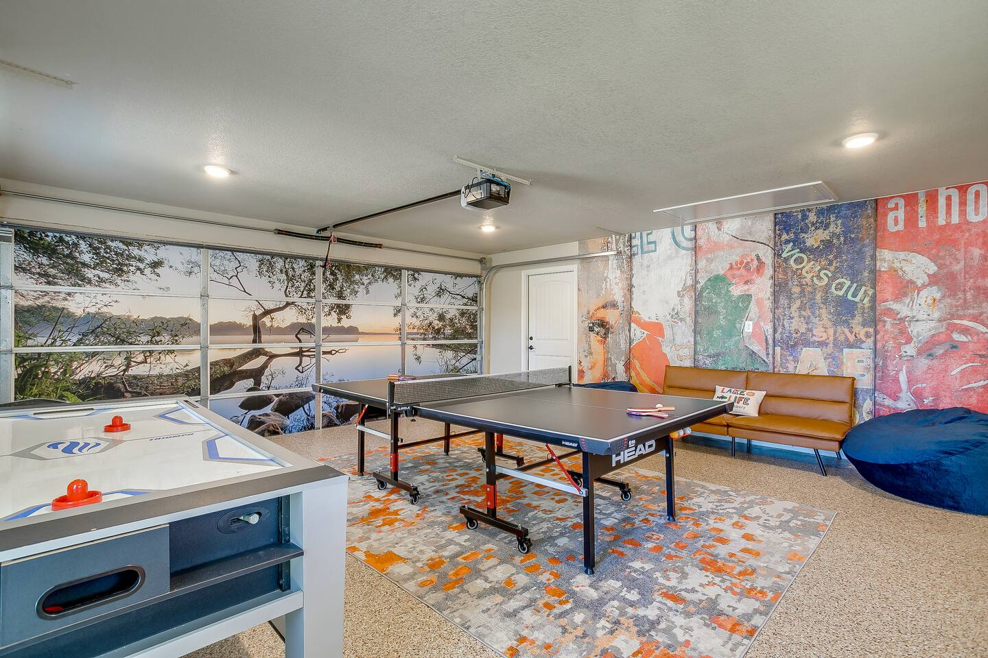 Welcome to Flip-Flop Cove – A Relaxing Canal-Side Getaway on Lake Granbury Flip-Flop Cove is a comfortable and beautifully updated retreat with a main house and guest house, perfect for family trips, couples’ weekends, or peaceful lake escapes. Located on a quiet canal just off Lake Granbury, the home offers the perfect mix of indoor comfort and outdoor enjoyment. Sleeping Arrangements Main House - Primary Bedroom: King bed, Queen Murphy bed, ensuite spa-style shower, walk-in closet, and 55" Smart TV - Second Bedroom: King bed, 55" Smart TV, walk-in closet, and access to a shared bathroom with Jacuzzi tub and shower Guest House - Third Bedroom: Queen bed, full private bathroom, walk-in closet, 55" Smart TV, and private workstation Living & Lounge Spaces - Spacious living room with a 75" Smart TV, Bluetooth soundbar, cozy seating, and a dedicated workstation with printer - Fully stocked kitchen with island seating, standard coffee maker and single-cup brewer, and all the tools you need to cook meals at home - Dining area with seating for your group to gather and enjoy meals together Outdoor Features - Located on a calm canal with private dock access—great for fishing, relaxing, or tying up a boat - Lakeside fire pit for evening conversations under the stars - Private hot tub overlooking the water, perfect for unwinding after a day on the lake - Patio with outdoor dining, a griddle, and a comfortable seating area Technology and Connectivity - High-speed Wi-Fi available throughout the property - Smart TVs in every room with streaming and casting capabilities Nature and Wildlife The backyard offers beautiful views and regular visits from ducks, turtles, fish, and other wildlife. Please observe them from a distance and avoid feeding them. Coffee and Kitchen Essentials The coffee bar includes complimentary pods, grounds, creamer, and tea. The kitchen is fully stocked with cookware, dinnerware, utensils, and more so you can feel right at home. For entertainment We’ve included an air hockey table, ping pong table, plus outdoor favorites like giant Jenga, giant Connect Four, and Cornhole boards — perfect for family fun and group gatherings!