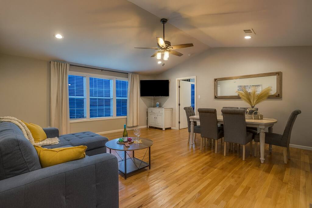 Unwind and connect at Granbury Grove—a thoughtfully designed retreat where comfort meets convenience. The spacious living room offers a plush sleeper sofa, a smart TV for entertainment, and a large dining table perfect for shared meals and game nights. Just steps away, the fully equipped kitchen features everything you need to prepare delicious meals, including a charming bistro set for quiet morning coffee. Start your day with a fresh cup from the Keurig coffee station, stocked with pods, creamers, and sweeteners to fuel your Granbury adventure. Each of the two bedrooms features comfortable king-sized beds with built-in dresser drawers and ceiling fans. The master bedroom includes an ensuite bathroom and closet space, while the second bedroom offers a beautiful view of the large oak trees that shade the backyard. Both rooms are designed with comfort and style in mind, ensuring a restful stay. For those working remotely, the dedicated office boasts a large desk space, a comfortable rolling chair, and a peaceful view of the backyard, providing the perfect setting for productivity. Step outside, and you’ll discover the crown jewel of Granbury Grove – a beautifully maintained backyard, perfect for outdoor enjoyment. Shaded by towering trees, the yard features a large dining table, a hot tub for four, cornhole games, giant Jenga, a hammock, a fire pit, and string lights to set the mood for a relaxing evening. Whether you're enjoying a peaceful morning coffee, an evening soak in the hot tub, or a game of cornhole under the stars, Granbury Grove is the perfect place to unwind and make lasting memories. Book your stay today and experience the beauty and comfort of this exceptional home!
