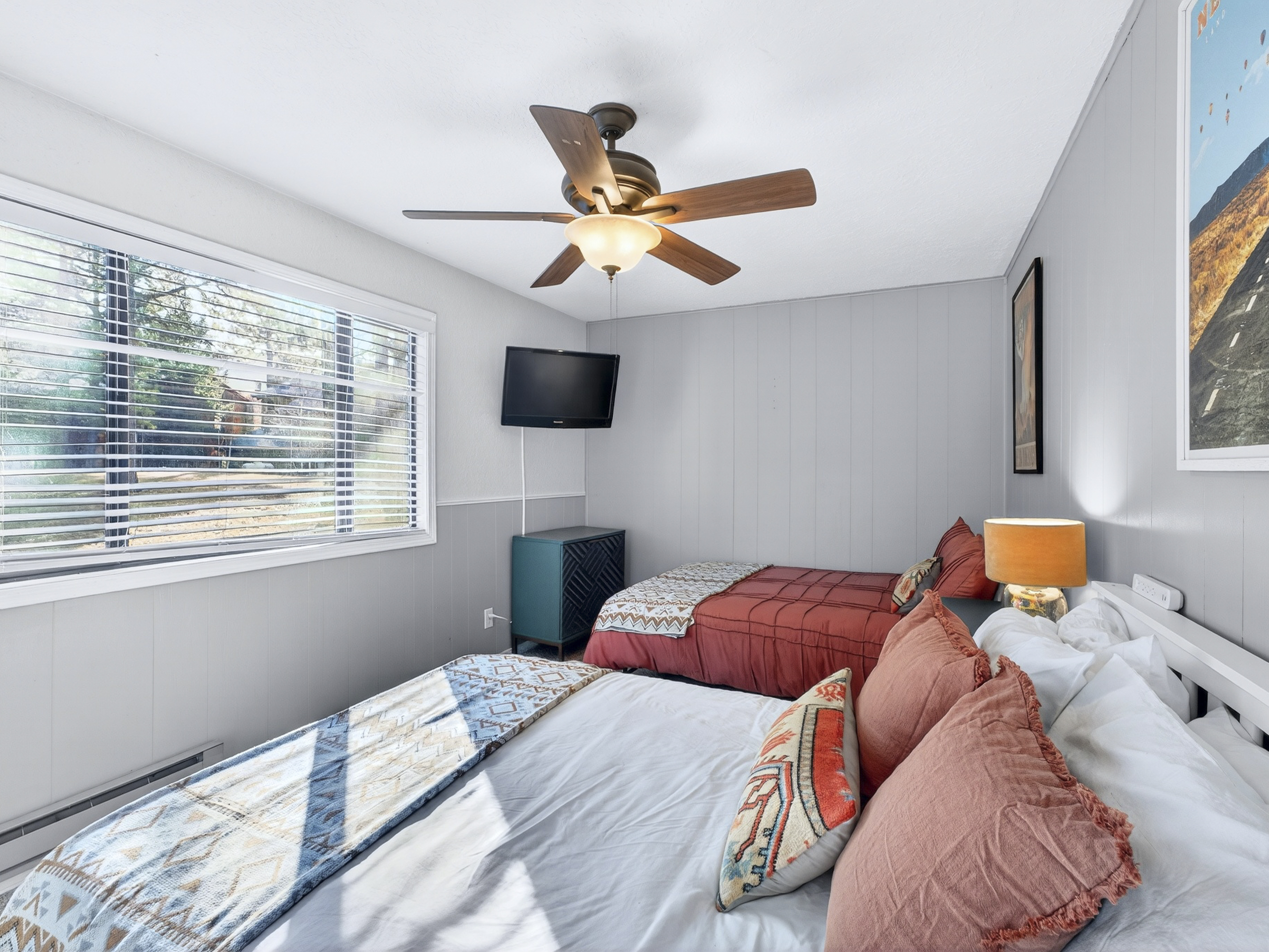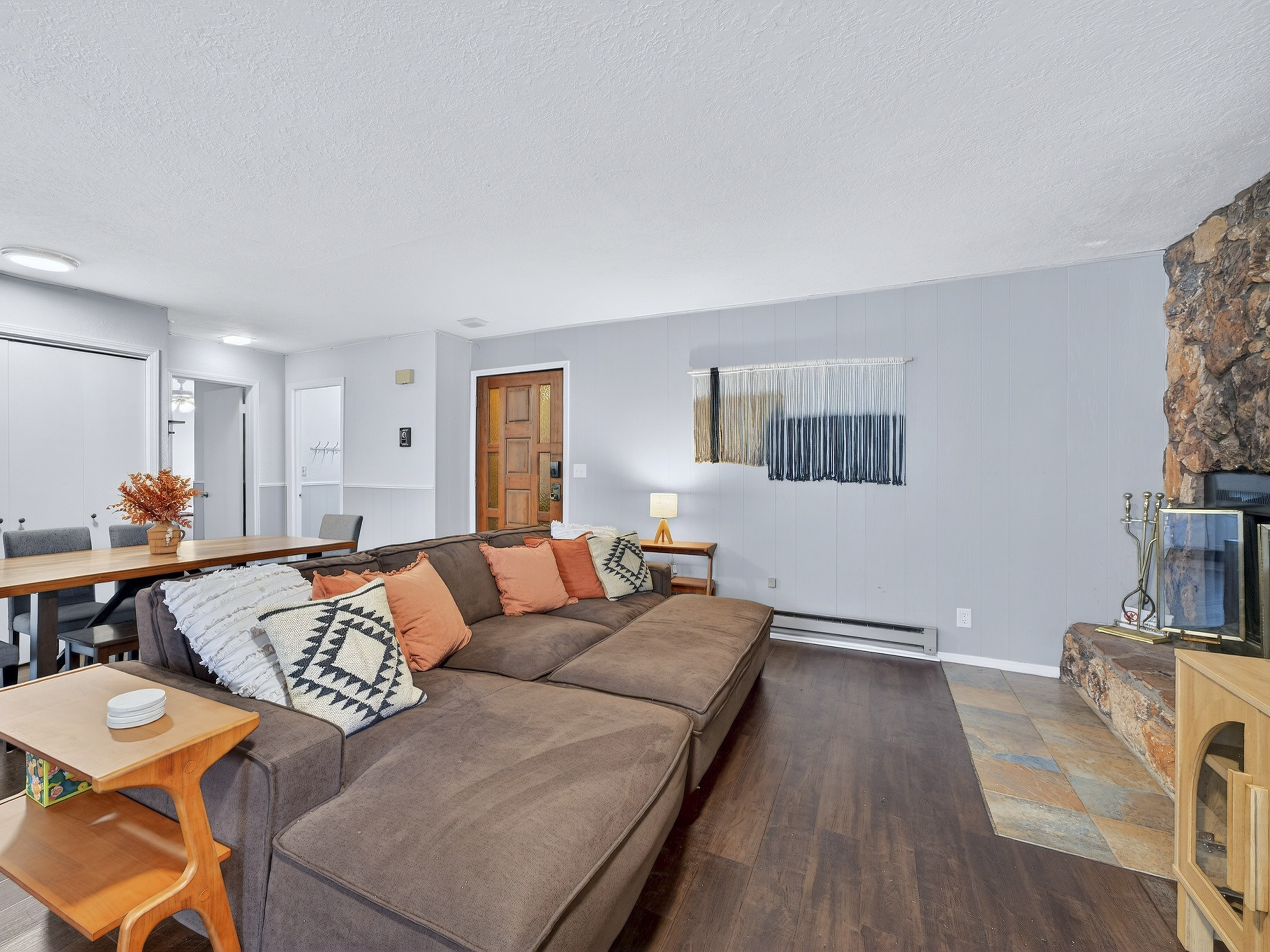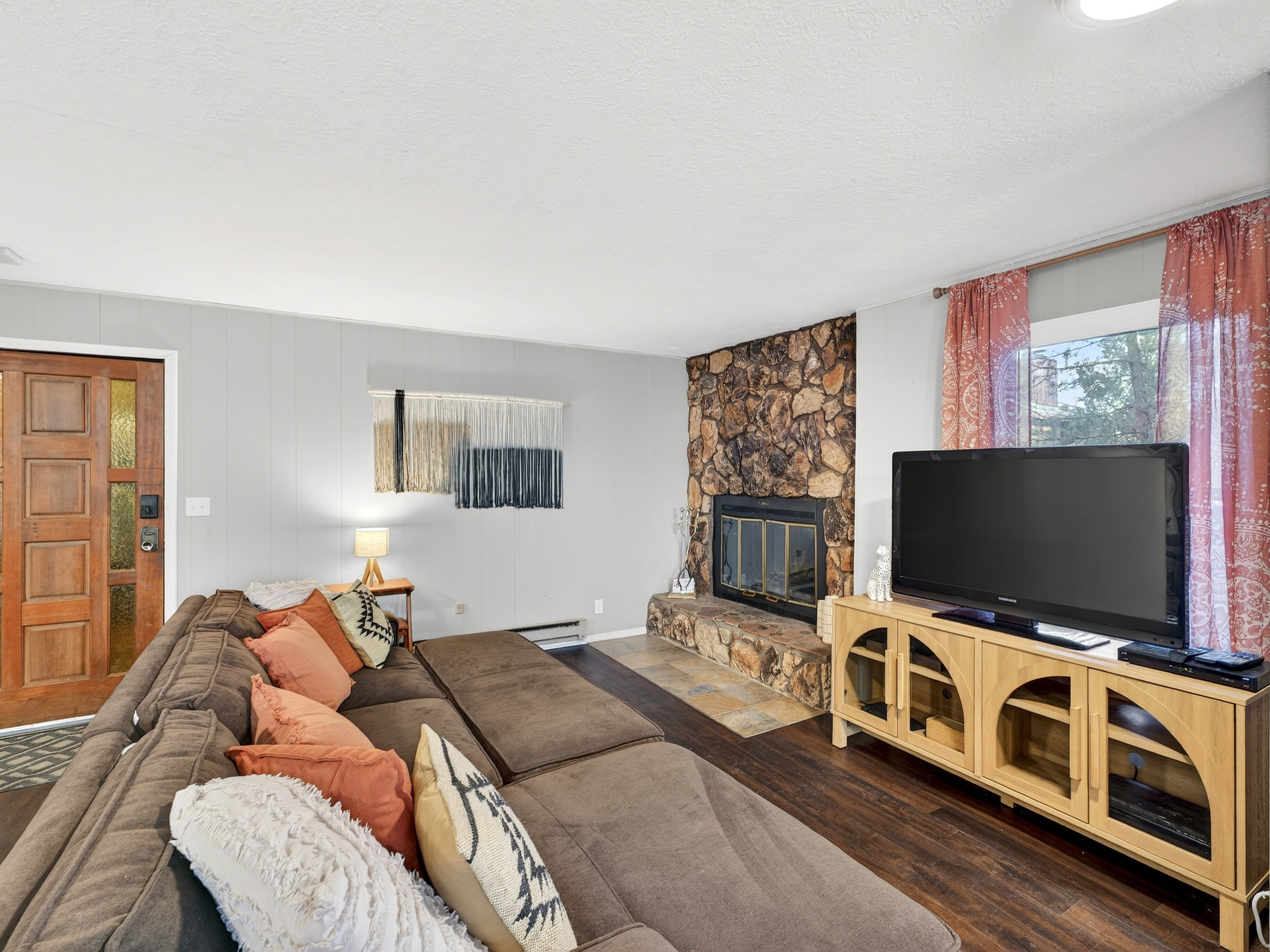 This inviting 3-bedroom, 2-bath condo in Angel Fire comfortably accommodates up to six guests and offers an ideal location near the ski resort. The open-concept living area features a cozy wood-burning fireplace, comfortable seating, and a Smart TV—perfect for relaxing after a day on the slopes. The fully equipped kitchen includes full-size appliances and cookware, with a dining area that makes it easy to enjoy meals together. The two primary bedrooms each offer a plush king bed, while the third bedroom includes two twin beds—great for kids or additional guests. Both bathrooms are well-appointed with modern fixtures, and a convenient laundry area with a washer and dryer adds extra comfort for longer stays. Whether you're here for winter skiing or summer mountain adventures, this home provides the perfect blend of comfort and convenience.
