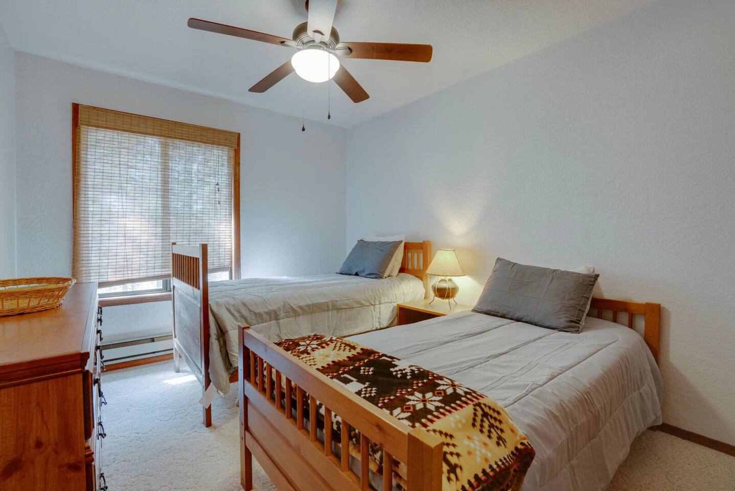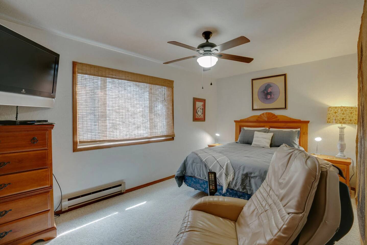 This spacious 3-bedroom, 2-bath condo sleeps up to eight guests and boasts a prime location—just across from the Cougar resort shuttle and three blocks from the Chile Express lift. After a day on the slopes or trails, relax in the inviting living room with seating for five, a queen sleeper sofa, wood-burning fireplace, and Smart TV with Dish service. The dining area seats four, and the fully equipped kitchen includes full-size appliances, cookware, and direct access to a private balcony. The main bedroom features a queen bed, mounted TV with Dish, and a massage chair. The second bedroom has a queen bed, while the third offers two twin beds. Bathrooms include a shower/tub combo and a separate shower stall. For convenience, a full-size washer and dryer are tucked away off the living room.