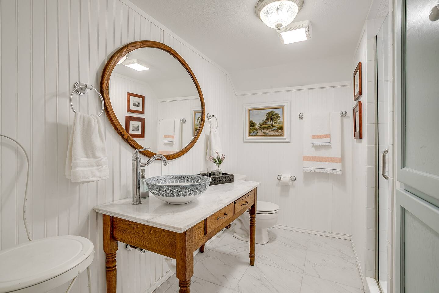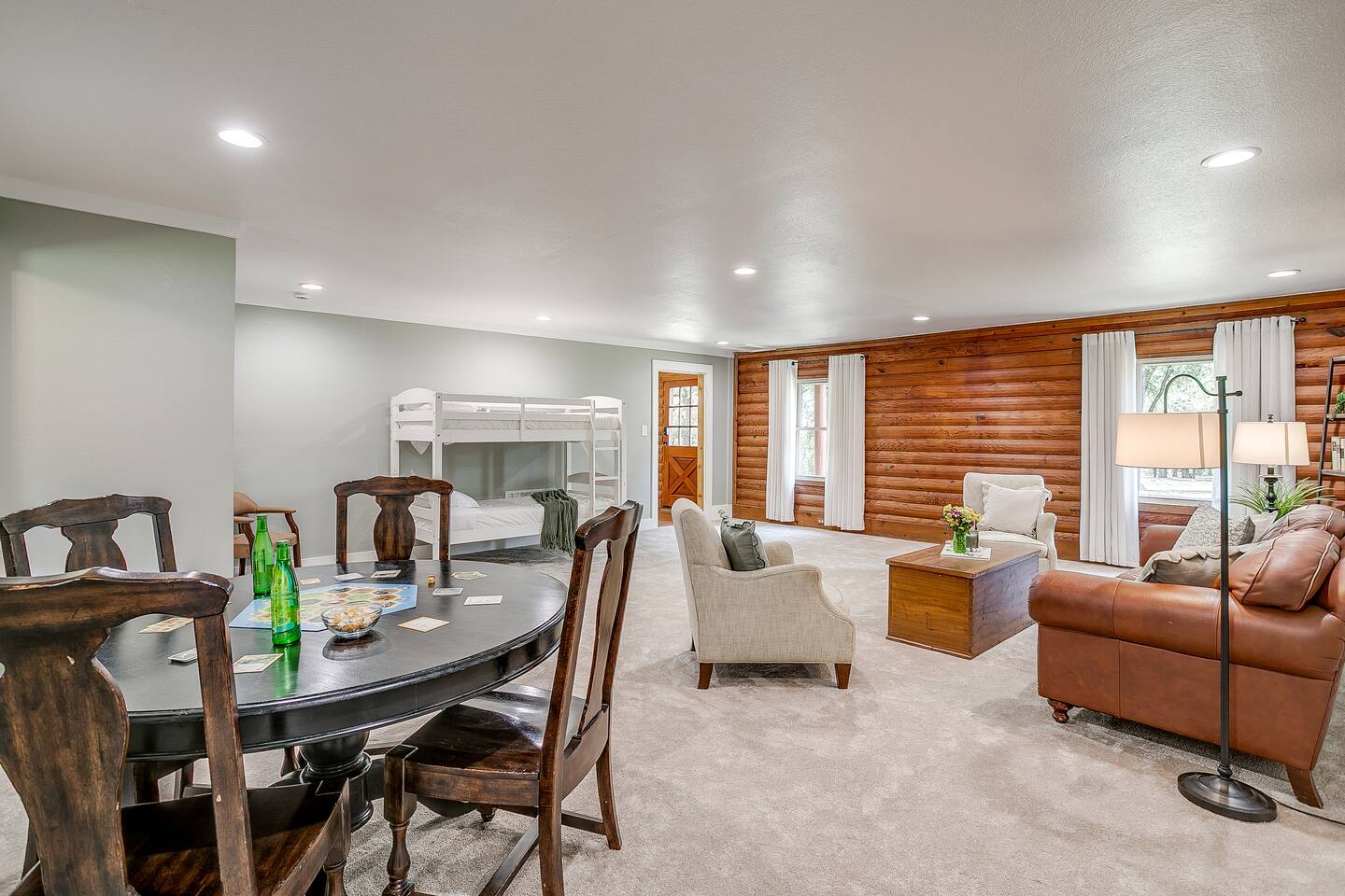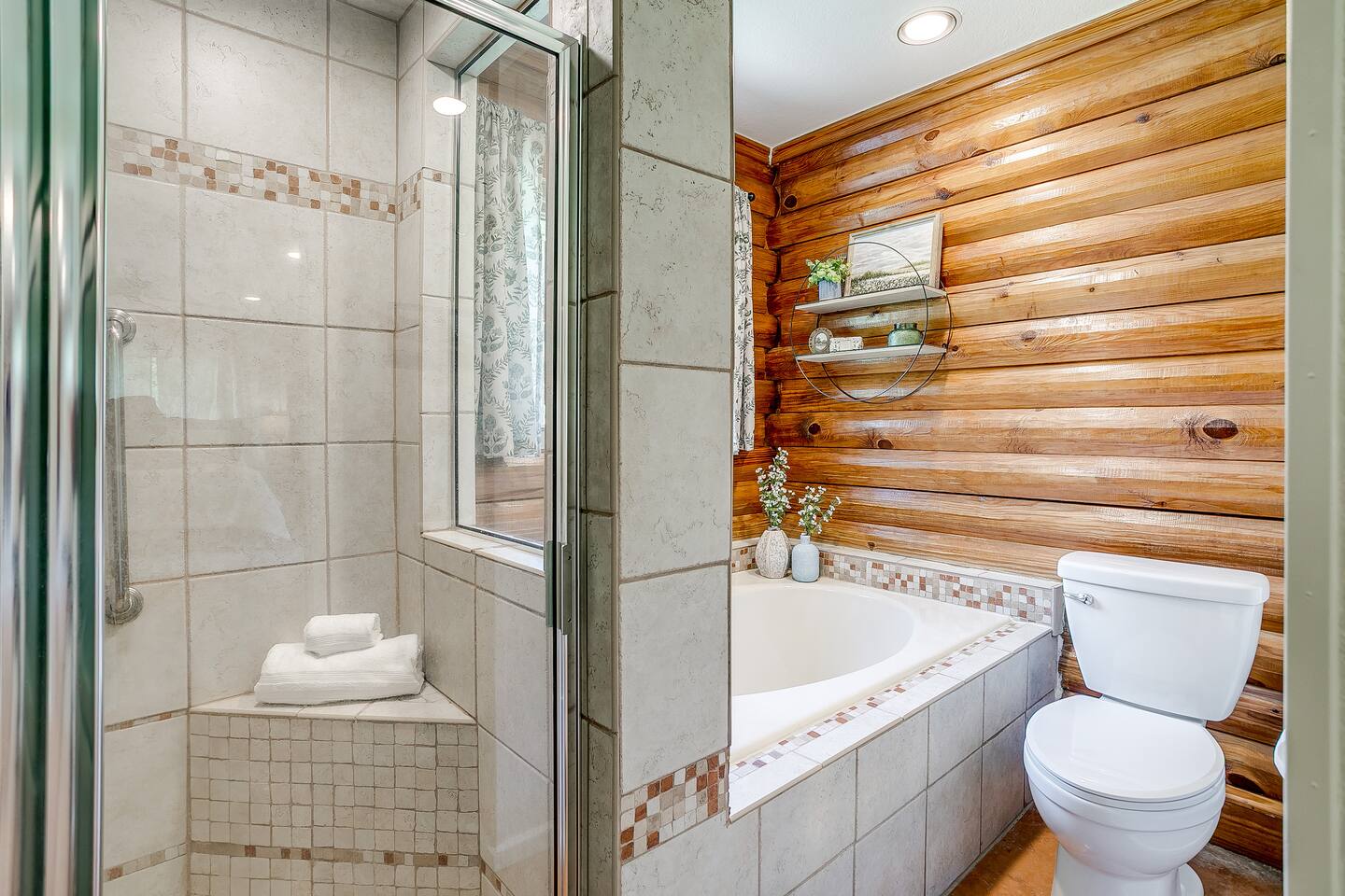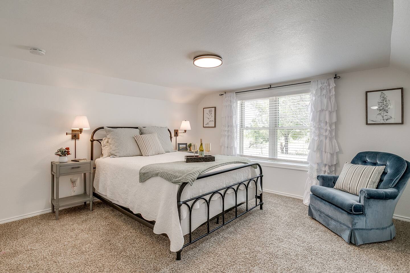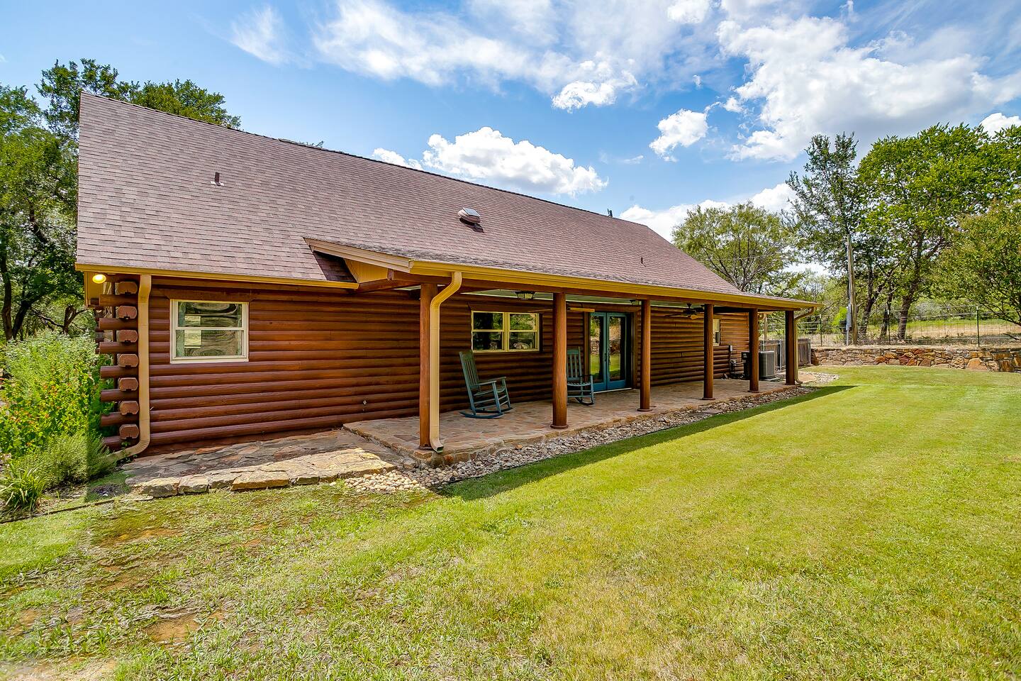 Welcome to Pleasant Valley Cabin — a picturesque log-cabin escape with all the comforts of home. When you step inside, you’re greeted by a soaring great room bathed in natural light. Vaulted ceilings adorned with log beams elevate the sense of space, and the cozy wood-burning stove invites gathering around the flames. A large sectional sofa offers plenty of seating, and a piano adds a touch of charm for music lovers. The kitchen is as charming as it is functional. Baby-blue cabinets, full-size stainless-steel appliances, and plenty of counter space make it a joy for cooking. A quaint dining table sits nearby, perfect for family breakfasts or cozy dinners. Just off the main living area is a bonus room that serves as the second bedroom. It features a bunk bed but also works beautifully as a second living space with its own seating area and an additional small dining spot. On the main floor, you’ll also find a half bath, a full laundry room, and the luxurious master suite. The master offers a king bed, a vanity space for getting ready, and a private bathroom with both a bathtub and shower. Every window in the home offers serene views of towering trees, making the space feel tucked away from the world. Upstairs, there are two more bedrooms and a fully remodeled bathroom. One bedroom features two sets of twin bunk beds, perfect for kids or groups. The other bedroom has a comfortable queen bed. Between them is a brand-new bathroom with a stylish shower and modern vanity. Step outside and you’ll find just as much to love. A covered front porch offers seating for a slow morning coffee or an evening glass of wine. Out back, a large grassy yard is framed by mature trees, offering space to relax, play games, or simply breathe in the fresh air. Pleasant Valley Cabin is an intimate yet spacious retreat, perfect for families, couples, or groups who want a blend of cabin charm and modern amenities. Nearby Fun Lake Weatherford is just a short drive away and is perfect for fishing, boating, or strolling along the nearly mile-long floating boardwalk. Chandor Gardens is a peaceful spot for a walk among beautiful landscaping and historic charm. Holland Lake Park offers trails for walking or biking and scenic spots for a picnic. Love Street Park and Cherry Park have splash pads, playgrounds, and picnic areas, great for kids to run and play. Grand Adventure Fun Center is nearby for go-karts, mini-golf, and arcade games, perfect for a family outing. Historic Downtown Weatherford is full of boutique shops, cafés, and local charm, along with the beautiful courthouse square.