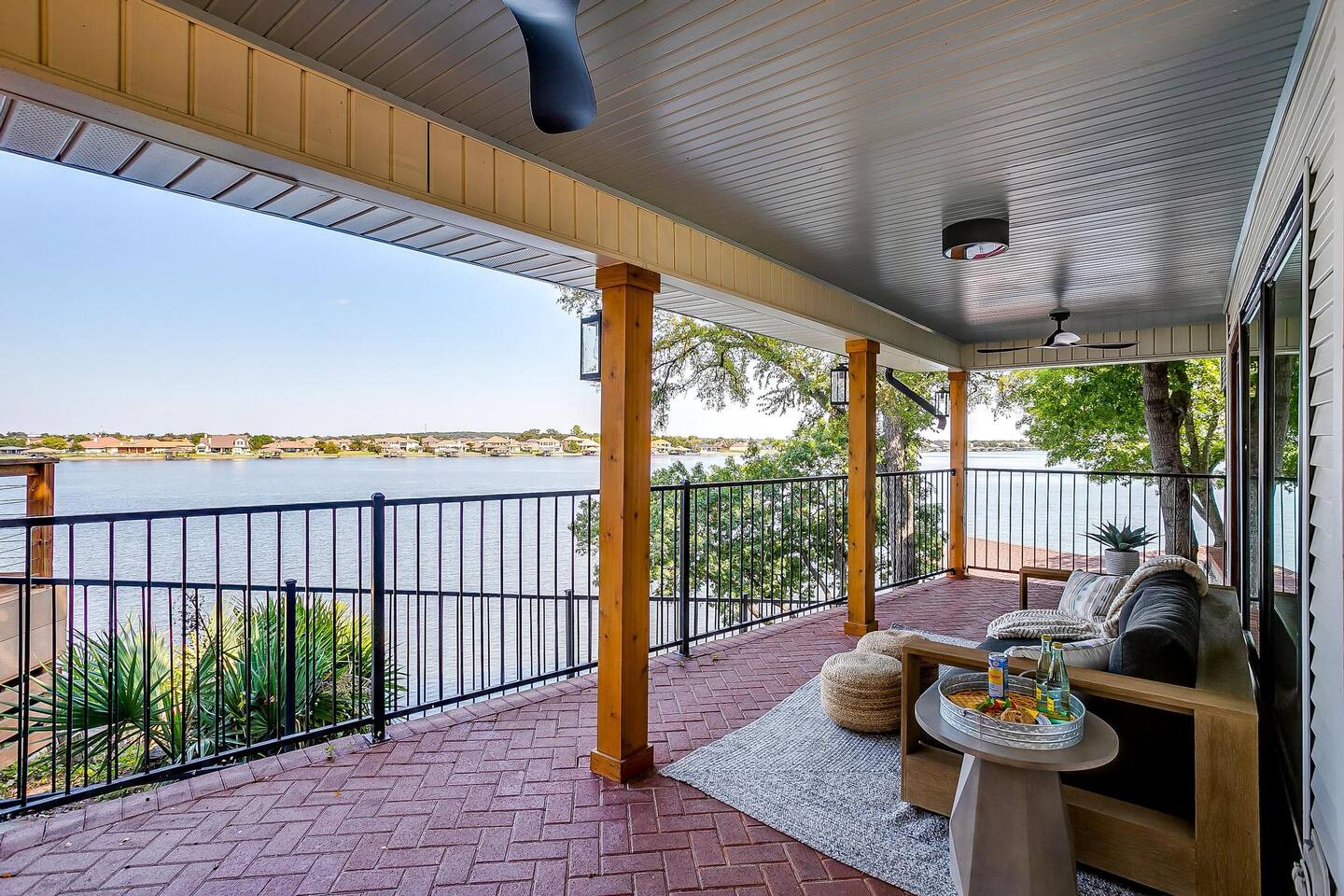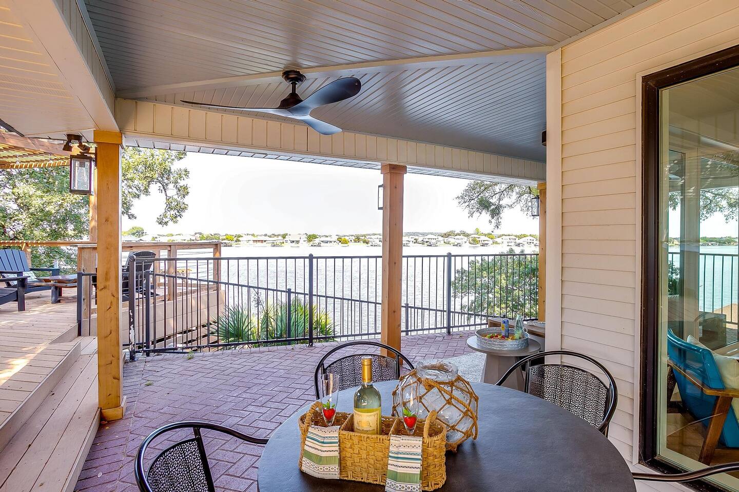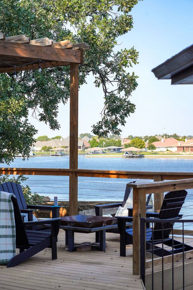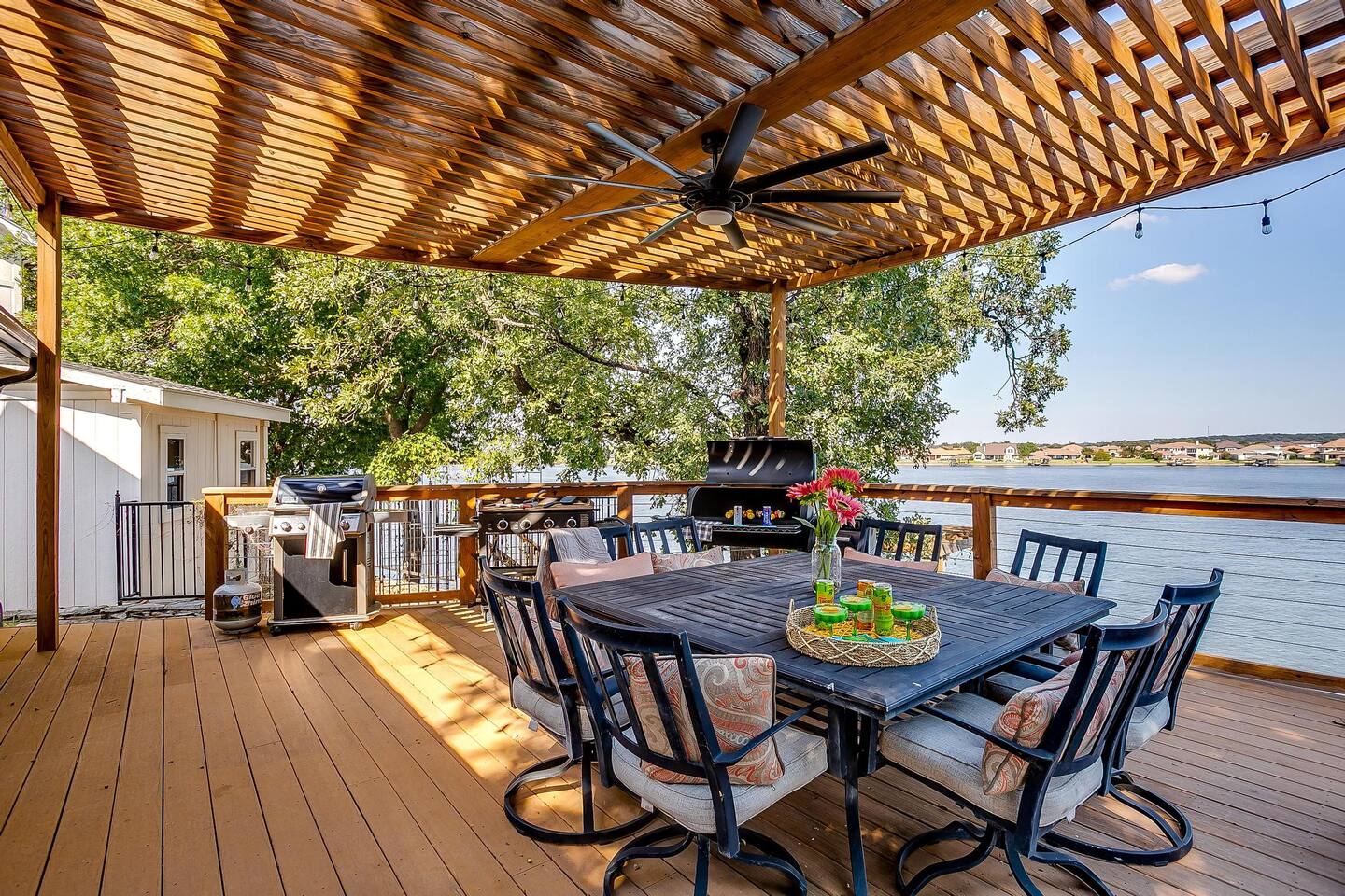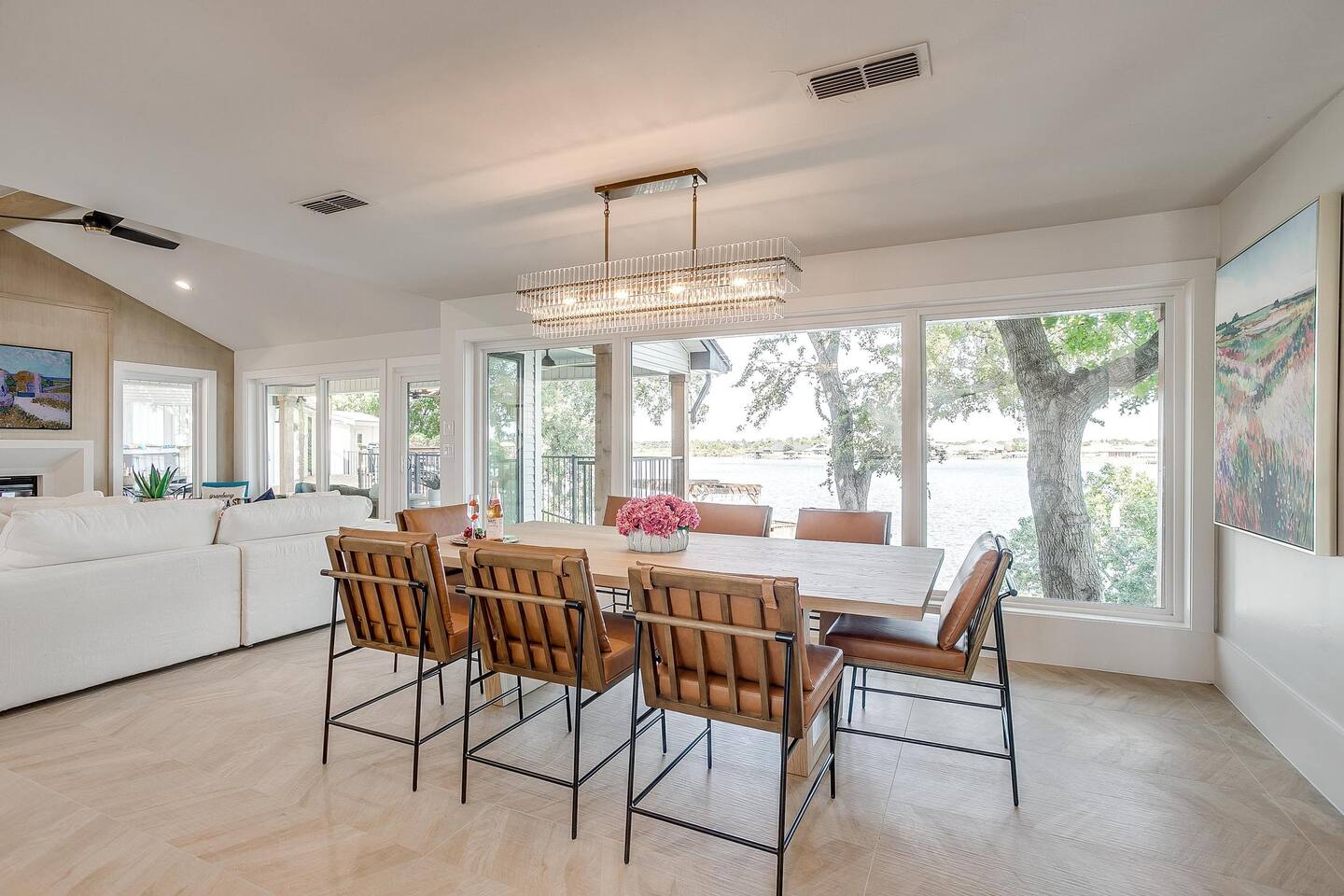 Welcome to Rough Creek Falls—your private lakefront escape tucked away in a peaceful cul-de-sac. This beautifully remodeled 4-bedroom retreat features 2 full and 2 half bathrooms, custom design touches, and sweeping water views. With space to comfortably host up to 12 guests, it’s the perfect setting for family vacations, group getaways, or a restful recharge surrounded by nature and style. Outdoor Spaces: Arrive to a long driveway that fits 6 vehicles, with additional street parking available. The front yard features a grassy area shaded by large trees. Step onto the front porch that flows into a large wrap around deck complete with Lake Granbury views, a hot tub, Adirondack chairs, a small balcony with an outdoor dining table for 4, and a comfortable couch—all overlooking scenic Lake Granbury. The deck extends to the back of the house, revealing a large pergola-covered dining area with seating for 8, a wood-burning firepit surrounded by Adirondack chairs, and a grill. Follow the stone path along the home and pass the beautiful waterfall feature as you make your way down to the private boat dock. Here, you’ll find a shaded area with fans and seating for two, perfect for fishing or soaking in the views. Please note: The boat parked on site is off-limits to guests, but you’re welcome to enjoy the dock. Additionally, the water near the dock can have rougher conditions, especially for kayaks or paddleboards. We recommend extra caution for those using these, especially inexperienced paddlers. Additionally, the water is very deep immediately off the dock, making it less suitable for wading but great for diving and boating. Main Level: Upon entering the home, you’ll find a welcoming entryway that flows into the butler’s pantry and a colorful half bath featuring a washer and dryer and a unique blue concrete sink. The adjoining gourmet kitchen is fully stocked and features a large gas stove, full-sized refrigerator, wine fridge, ice maker, coffee station, and a spacious island with additional bar seating. It’s perfect for family meals and entertaining! The dining area features a custom solid white oak table that seats 8 under a stunning chandelier, offering panoramic lake views. The adjacent living room includes a large sectional, a fun blue accent chair, and a Samsung Frame TV. Note: The fireplace in the living room is not available for use. Just off the dining area is the master suite, featuring a king-sized bed, electric fireplace, Samsung Frame TV, and a bay window seating area with lake views. The en-suite bathroom includes dual vanities, a walk-in shower, and a spacious walk-in closet—perfect for extended stays. Lower Level: Downstairs, the second living area is perfect for groups or families, featuring two custom-built double sized bunk beds, a cozy sectional sofa, a half bath, and a Samsung Smart TV. There’s a game cabinet filled with board games, a card table for 4, and a desk area for anyone needing a dedicated workspace. The dark, moody decor and vintage accents like framed newspaper clippings and an antique gumball machine give the space a unique personality! Upper Level: The upper level hosts three beautifully decorated bedrooms: - Bedroom 1: Double bunk bed, ideal for families or groups needing flexible sleeping arrangements. - Bedroom 2: Queen bed with closet space and cozy decor. - Bedroom 3: Queen bed with gorgeous lake views—wake up to stunning water vistas every morning! The shared full bathroom features a shower/tub combo and a spacious vanity to accommodate everyone’s needs. Key Details: - Sleeping Arrangements: 4 bedrooms plus additional sleeping space in the lower-level lounge. - Bathrooms: 2 full and 2 half bathrooms. - Parking: Long driveway fits 6 vehicles; additional parking on the street. - Outdoor Amenities: Hot tub, large deck, pergola dining area, firepit, grill, Blackstone, and private boat dock. - Indoor Amenities: Gourmet kitchen, Samsung Frame TVs, game cabinet, and dedicated desk space. - Fireplaces & Boat Use: Fireplaces and boat are not available for guest use. - Wi-Fi & Entertainment: High-speed internet throughout the home. Perfect for Any Occasion: Whether you’re looking to enjoy mornings on the porch, gather for meals under the pergola, fish off the dock, or explore Lake Granbury, Rough Creek Falls has something for everyone. Book now and create memories at this one-of-a-kind lakeside retreat!