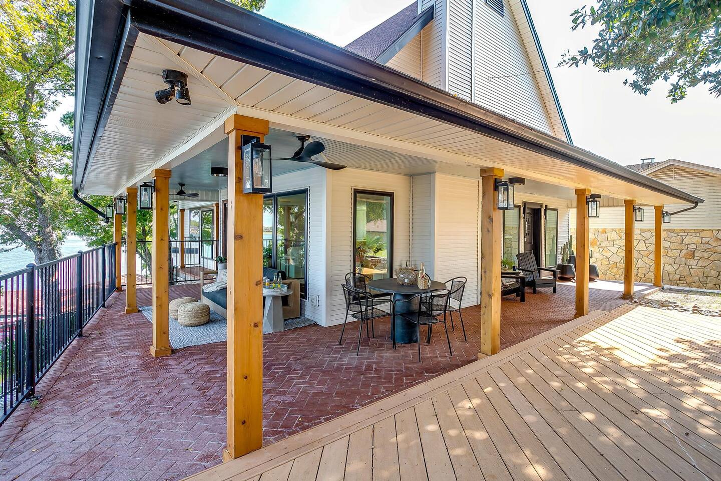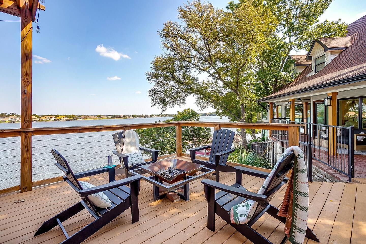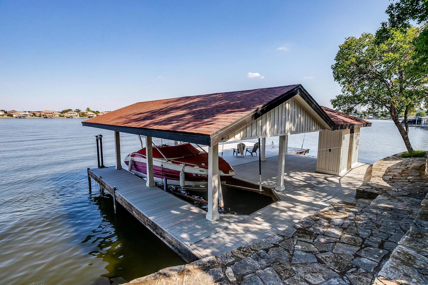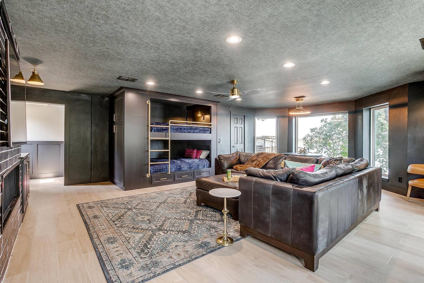 Welcome to Rough Creek Falls—your private lakefront escape tucked away in a peaceful cul-de-sac. This beautifully remodeled 4-bedroom retreat features 2 full and 2 half bathrooms, custom design touches, and sweeping water views. With space to comfortably host up to 12 guests, it’s the perfect setting for family vacations, group getaways, or a restful recharge surrounded by nature and style. Outdoor Spaces: Arrive to a long driveway that fits 6 vehicles, with additional street parking available. The front yard features a grassy area shaded by large trees. Step onto the front porch that flows into a large wrap around deck complete with Lake Granbury views, a hot tub, Adirondack chairs, a small balcony with an outdoor dining table for 4, and a comfortable couch—all overlooking scenic Lake Granbury. The deck extends to the back of the house, revealing a large pergola-covered dining area with seating for 8, a wood-burning firepit surrounded by Adirondack chairs, and a grill. Follow the stone path along the home and pass the beautiful waterfall feature as you make your way down to the private boat dock. Here, you’ll find a shaded area with fans and seating for two, perfect for fishing or soaking in the views. Please note: The boat parked on site is off-limits to guests, but you’re welcome to enjoy the dock. Additionally, the water near the dock can have rougher conditions, especially for kayaks or paddleboards. We recommend extra caution for those using these, especially inexperienced paddlers. Additionally, the water is very deep immediately off the dock, making it less suitable for wading but great for diving and boating. Main Level: Upon entering the home, you’ll find a welcoming entryway that flows into the butler’s pantry and a colorful half bath featuring a washer and dryer and a unique blue concrete sink. The adjoining gourmet kitchen is fully stocked and features a large gas stove, full-sized refrigerator, wine fridge, ice maker, coffee station, and a spacious island with additional bar seating. It’s perfect for family meals and entertaining! The dining area features a custom solid white oak table that seats 8 under a stunning chandelier, offering panoramic lake views. The adjacent living room includes a large sectional, a fun blue accent chair, and a Samsung Frame TV. Note: The fireplace in the living room is not available for use. Just off the dining area is the master suite, featuring a king-sized bed, electric fireplace, Samsung Frame TV, and a bay window seating area with lake views. The en-suite bathroom includes dual vanities, a walk-in shower, and a spacious walk-in closet—perfect for extended stays. Lower Level: Downstairs, the second living area is perfect for groups or families, featuring two custom-built double sized bunk beds, a cozy sectional sofa, a half bath, and a Samsung Smart TV. There’s a game cabinet filled with board games, a card table for 4, and a desk area for anyone needing a dedicated workspace. The dark, moody decor and vintage accents like framed newspaper clippings and an antique gumball machine give the space a unique personality! Upper Level: The upper level hosts three beautifully decorated bedrooms: - Bedroom 1: Double bunk bed, ideal for families or groups needing flexible sleeping arrangements. - Bedroom 2: Queen bed with closet space and cozy decor. - Bedroom 3: Queen bed with gorgeous lake views—wake up to stunning water vistas every morning! The shared full bathroom features a shower/tub combo and a spacious vanity to accommodate everyone’s needs. Key Details: - Sleeping Arrangements: 4 bedrooms plus additional sleeping space in the lower-level lounge. - Bathrooms: 2 full and 2 half bathrooms. - Parking: Long driveway fits 6 vehicles; additional parking on the street. - Outdoor Amenities: Hot tub, large deck, pergola dining area, firepit, grill, Blackstone, and private boat dock. - Indoor Amenities: Gourmet kitchen, Samsung Frame TVs, game cabinet, and dedicated desk space. - Fireplaces & Boat Use: Fireplaces and boat are not available for guest use. - Wi-Fi & Entertainment: High-speed internet throughout the home. Perfect for Any Occasion: Whether you’re looking to enjoy mornings on the porch, gather for meals under the pergola, fish off the dock, or explore Lake Granbury, Rough Creek Falls has something for everyone. Book now and create memories at this one-of-a-kind lakeside retreat!