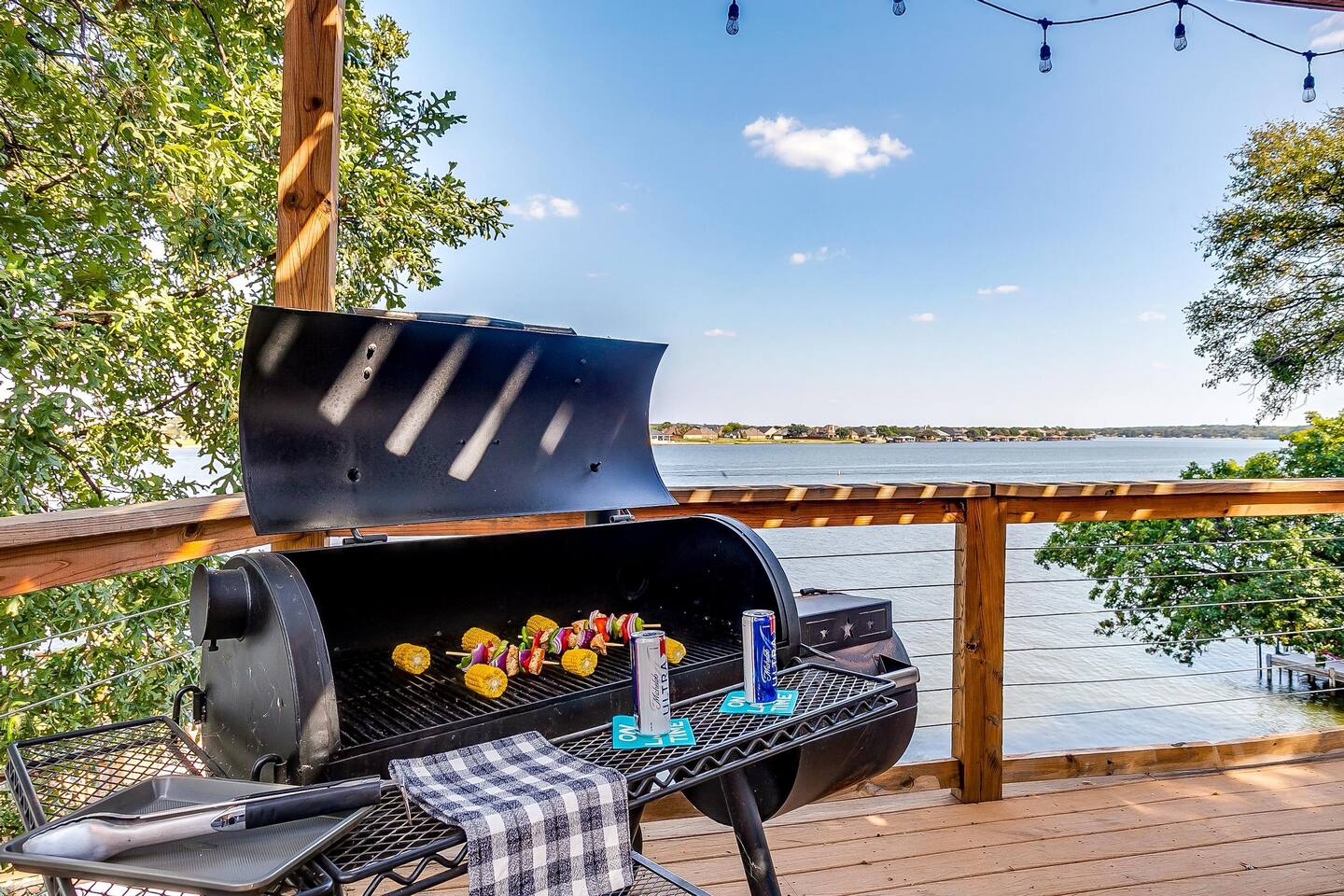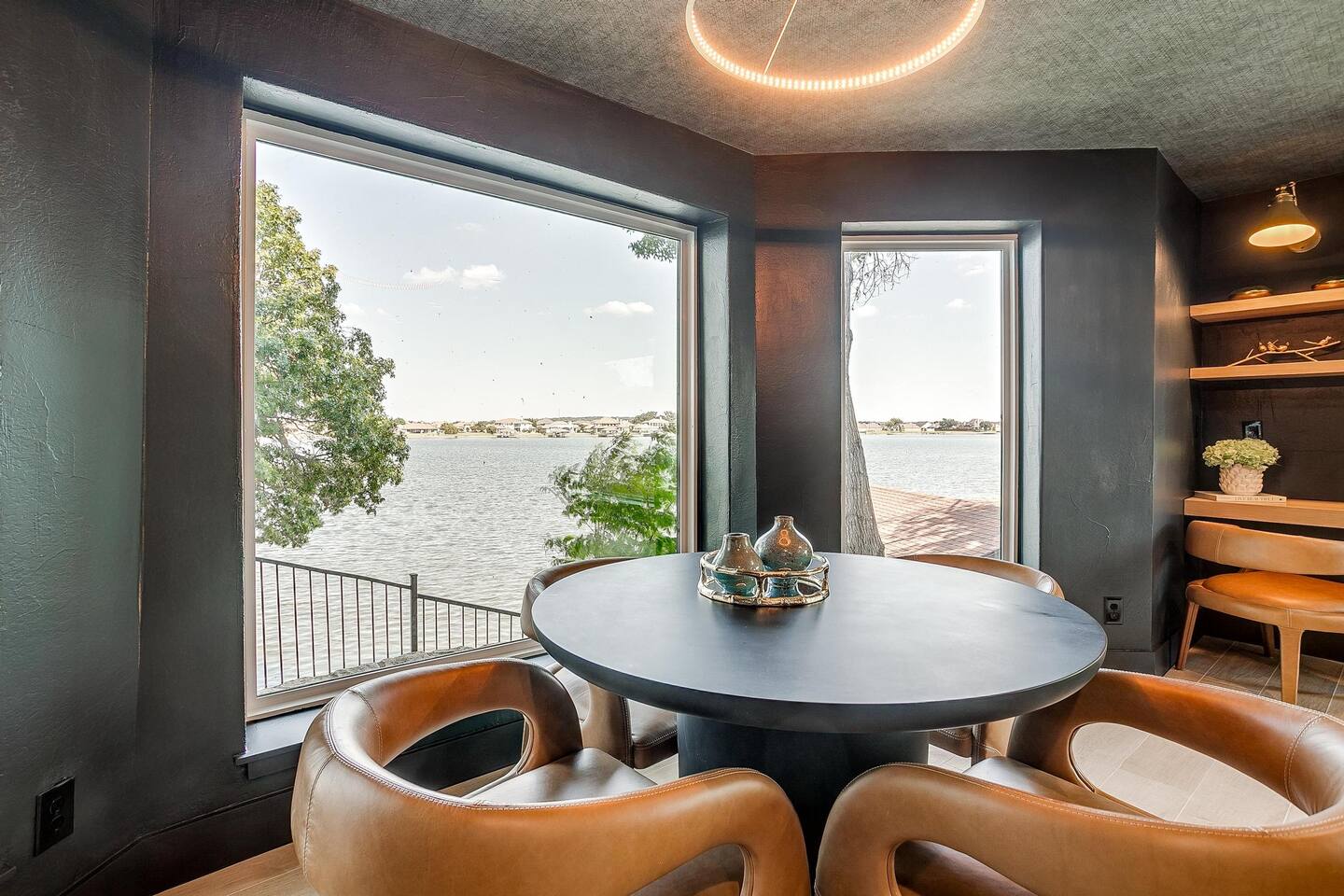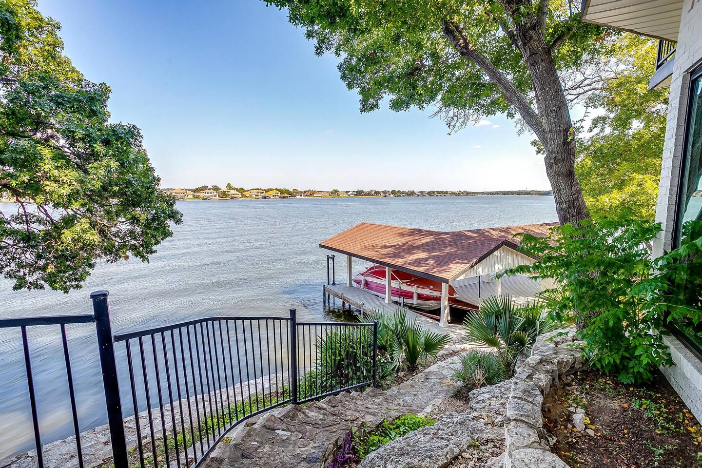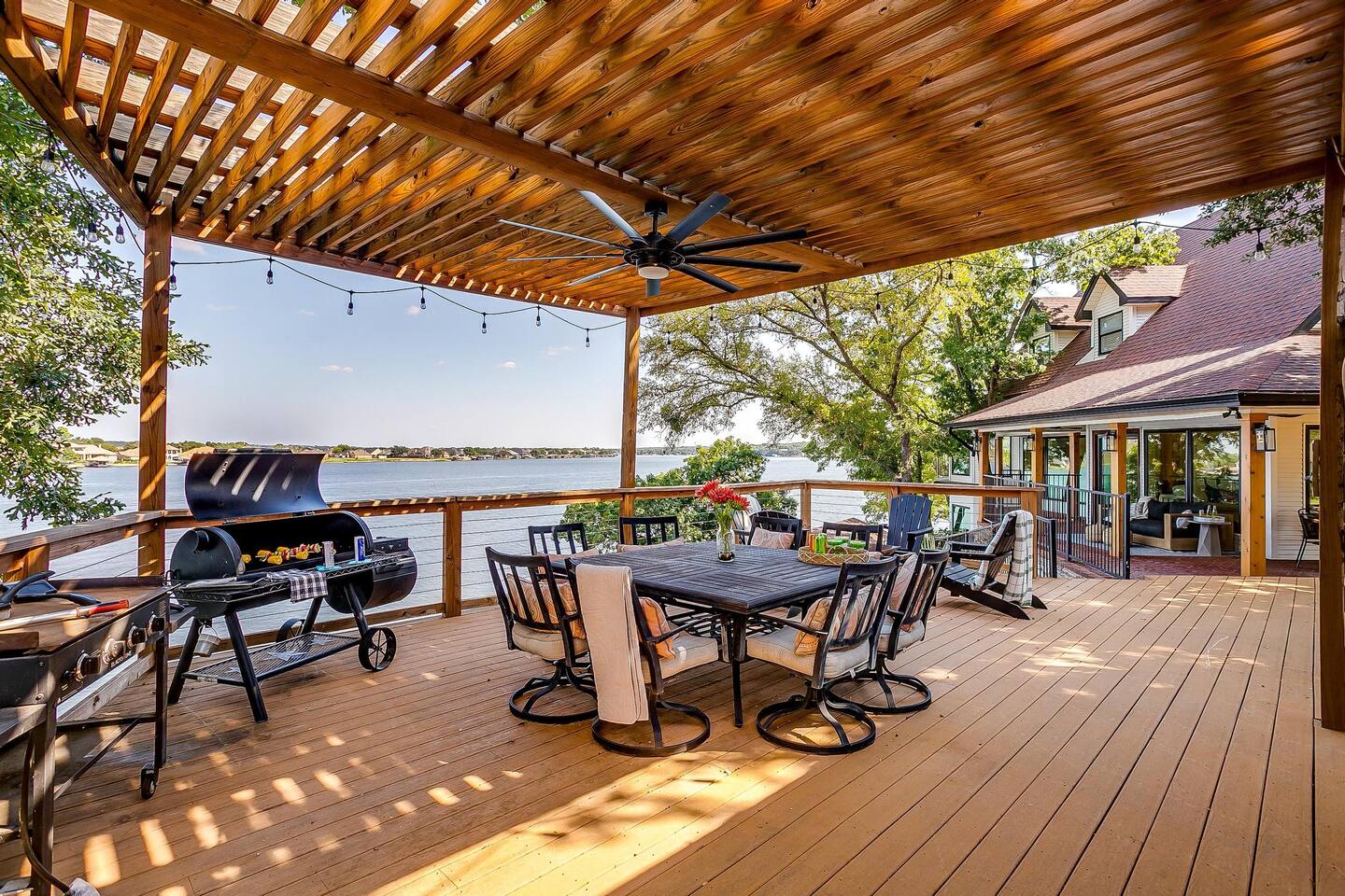 Welcome to Rough Creek Falls—your private lakefront escape tucked away in a peaceful cul-de-sac. This beautifully remodeled 4-bedroom retreat features 2 full and 2 half bathrooms, custom design touches, and sweeping water views. With space to comfortably host up to 12 guests, it’s the perfect setting for family vacations, group getaways, or a restful recharge surrounded by nature and style. Outdoor Spaces: Arrive to a long driveway that fits 6 vehicles, with additional street parking available. The front yard features a grassy area shaded by large trees. Step onto the front porch that flows into a large wrap around deck complete with Lake Granbury views, a hot tub, Adirondack chairs, a small balcony with an outdoor dining table for 4, and a comfortable couch—all overlooking scenic Lake Granbury. The deck extends to the back of the house, revealing a large pergola-covered dining area with seating for 8, a wood-burning firepit surrounded by Adirondack chairs, and a grill. Follow the stone path along the home and pass the beautiful waterfall feature as you make your way down to the private boat dock. Here, you’ll find a shaded area with fans and seating for two, perfect for fishing or soaking in the views. Please note: The boat parked on site is off-limits to guests, but you’re welcome to enjoy the dock. Additionally, the water near the dock can have rougher conditions, especially for kayaks or paddleboards. We recommend extra caution for those using these, especially inexperienced paddlers. Additionally, the water is very deep immediately off the dock, making it less suitable for wading but great for diving and boating. Main Level: Upon entering the home, you’ll find a welcoming entryway that flows into the butler’s pantry and a colorful half bath featuring a washer and dryer and a unique blue concrete sink. The adjoining gourmet kitchen is fully stocked and features a large gas stove, full-sized refrigerator, wine fridge, ice maker, coffee station, and a spacious island with additional bar seating. It’s perfect for family meals and entertaining! The dining area features a custom solid white oak table that seats 8 under a stunning chandelier, offering panoramic lake views. The adjacent living room includes a large sectional, a fun blue accent chair, and a Samsung Frame TV. Note: The fireplace in the living room is not available for use. Just off the dining area is the master suite, featuring a king-sized bed, electric fireplace, Samsung Frame TV, and a bay window seating area with lake views. The en-suite bathroom includes dual vanities, a walk-in shower, and a spacious walk-in closet—perfect for extended stays. Lower Level: Downstairs, the second living area is perfect for groups or families, featuring two custom-built double sized bunk beds, a cozy sectional sofa, a half bath, and a Samsung Smart TV. There’s a game cabinet filled with board games, a card table for 4, and a desk area for anyone needing a dedicated workspace. The dark, moody decor and vintage accents like framed newspaper clippings and an antique gumball machine give the space a unique personality! Upper Level: The upper level hosts three beautifully decorated bedrooms: - Bedroom 1: Double bunk bed, ideal for families or groups needing flexible sleeping arrangements. - Bedroom 2: Queen bed with closet space and cozy decor. - Bedroom 3: Queen bed with gorgeous lake views—wake up to stunning water vistas every morning! The shared full bathroom features a shower/tub combo and a spacious vanity to accommodate everyone’s needs. Key Details: - Sleeping Arrangements: 4 bedrooms plus additional sleeping space in the lower-level lounge. - Bathrooms: 2 full and 2 half bathrooms. - Parking: Long driveway fits 6 vehicles; additional parking on the street. - Outdoor Amenities: Hot tub, large deck, pergola dining area, firepit, grill, Blackstone, and private boat dock. - Indoor Amenities: Gourmet kitchen, Samsung Frame TVs, game cabinet, and dedicated desk space. - Fireplaces & Boat Use: Fireplaces and boat are not available for guest use. - Wi-Fi & Entertainment: High-speed internet throughout the home. Perfect for Any Occasion: Whether you’re looking to enjoy mornings on the porch, gather for meals under the pergola, fish off the dock, or explore Lake Granbury, Rough Creek Falls has something for everyone. Book now and create memories at this one-of-a-kind lakeside retreat!