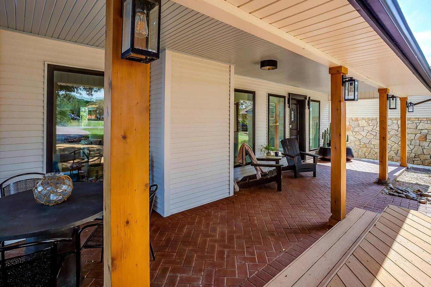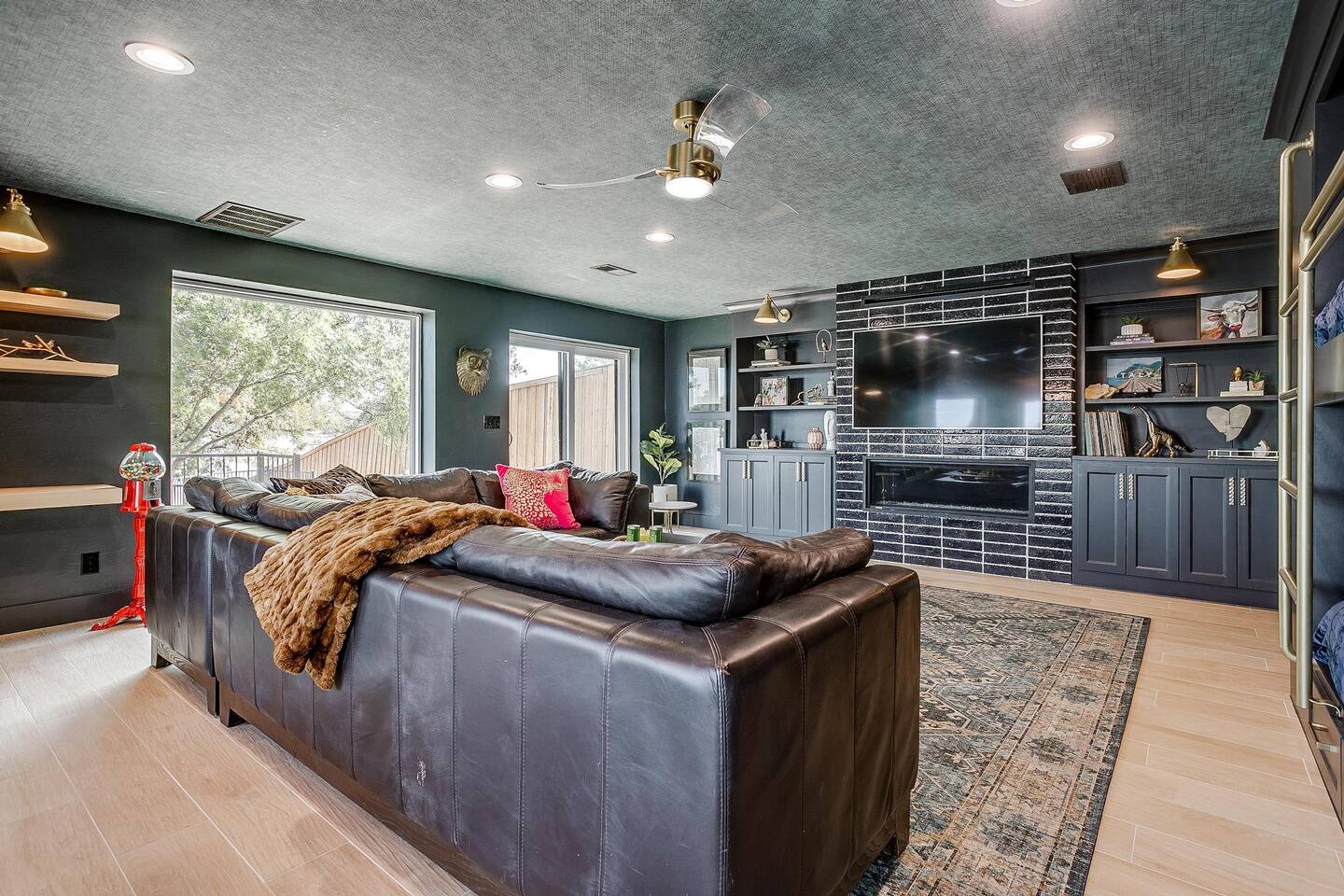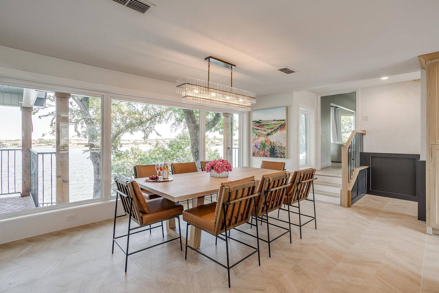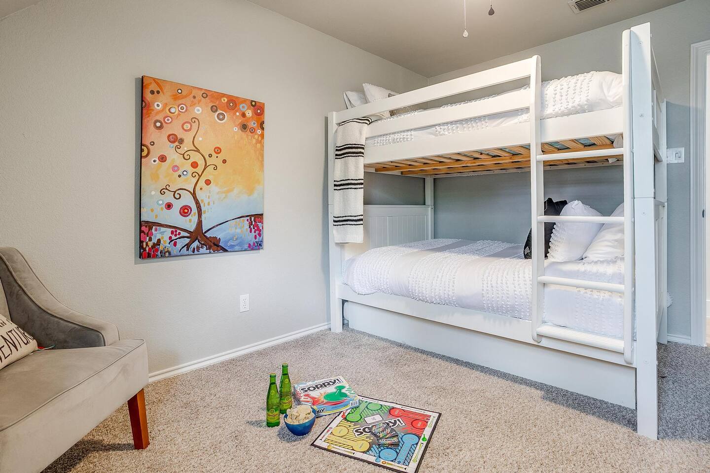 Welcome to Rough Creek Falls—your private lakefront escape tucked away in a peaceful cul-de-sac. This beautifully remodeled 4-bedroom retreat features 2 full and 2 half bathrooms, custom design touches, and sweeping water views. With space to comfortably host up to 12 guests, it’s the perfect setting for family vacations, group getaways, or a restful recharge surrounded by nature and style. Outdoor Spaces: Arrive to a long driveway that fits 6 vehicles, with additional street parking available. The front yard features a grassy area shaded by large trees. Step onto the front porch that flows into a large wrap around deck complete with Lake Granbury views, a hot tub, Adirondack chairs, a small balcony with an outdoor dining table for 4, and a comfortable couch—all overlooking scenic Lake Granbury. The deck extends to the back of the house, revealing a large pergola-covered dining area with seating for 8, a wood-burning firepit surrounded by Adirondack chairs, and a grill. Follow the stone path along the home and pass the beautiful waterfall feature as you make your way down to the private boat dock. Here, you’ll find a shaded area with fans and seating for two, perfect for fishing or soaking in the views. Please note: The boat parked on site is off-limits to guests, but you’re welcome to enjoy the dock. Additionally, the water near the dock can have rougher conditions, especially for kayaks or paddleboards. We recommend extra caution for those using these, especially inexperienced paddlers. Additionally, the water is very deep immediately off the dock, making it less suitable for wading but great for diving and boating. Main Level: Upon entering the home, you’ll find a welcoming entryway that flows into the butler’s pantry and a colorful half bath featuring a washer and dryer and a unique blue concrete sink. The adjoining gourmet kitchen is fully stocked and features a large gas stove, full-sized refrigerator, wine fridge, ice maker, coffee station, and a spacious island with additional bar seating. It’s perfect for family meals and entertaining! The dining area features a custom solid white oak table that seats 8 under a stunning chandelier, offering panoramic lake views. The adjacent living room includes a large sectional, a fun blue accent chair, and a Samsung Frame TV. Note: The fireplace in the living room is not available for use. Just off the dining area is the master suite, featuring a king-sized bed, electric fireplace, Samsung Frame TV, and a bay window seating area with lake views. The en-suite bathroom includes dual vanities, a walk-in shower, and a spacious walk-in closet—perfect for extended stays. Lower Level: Downstairs, the second living area is perfect for groups or families, featuring two custom-built double sized bunk beds, a cozy sectional sofa, a half bath, and a Samsung Smart TV. There’s a game cabinet filled with board games, a card table for 4, and a desk area for anyone needing a dedicated workspace. The dark, moody decor and vintage accents like framed newspaper clippings and an antique gumball machine give the space a unique personality! Upper Level: The upper level hosts three beautifully decorated bedrooms: - Bedroom 1: Double bunk bed, ideal for families or groups needing flexible sleeping arrangements. - Bedroom 2: Queen bed with closet space and cozy decor. - Bedroom 3: Queen bed with gorgeous lake views—wake up to stunning water vistas every morning! The shared full bathroom features a shower/tub combo and a spacious vanity to accommodate everyone’s needs. Key Details: - Sleeping Arrangements: 4 bedrooms plus additional sleeping space in the lower-level lounge. - Bathrooms: 2 full and 2 half bathrooms. - Parking: Long driveway fits 6 vehicles; additional parking on the street. - Outdoor Amenities: Hot tub, large deck, pergola dining area, firepit, grill, Blackstone, and private boat dock. - Indoor Amenities: Gourmet kitchen, Samsung Frame TVs, game cabinet, and dedicated desk space. - Fireplaces & Boat Use: Fireplaces and boat are not available for guest use. - Wi-Fi & Entertainment: High-speed internet throughout the home. Perfect for Any Occasion: Whether you’re looking to enjoy mornings on the porch, gather for meals under the pergola, fish off the dock, or explore Lake Granbury, Rough Creek Falls has something for everyone. Book now and create memories at this one-of-a-kind lakeside retreat!
