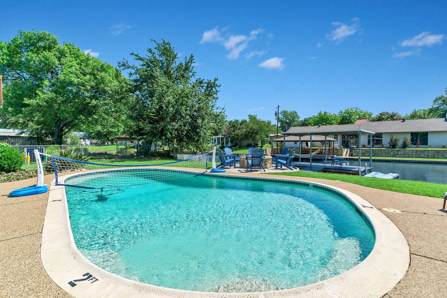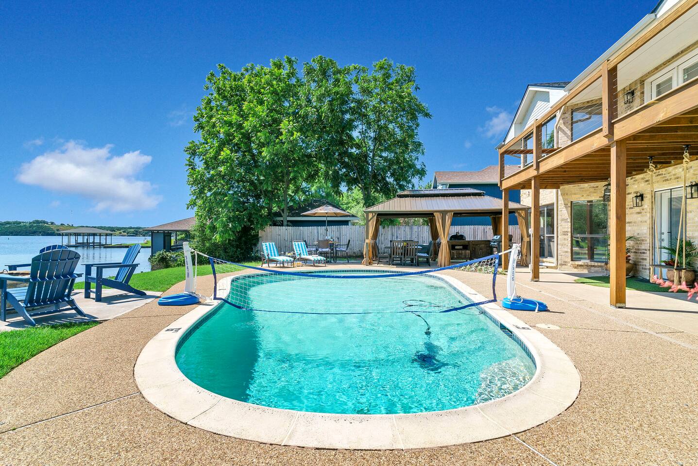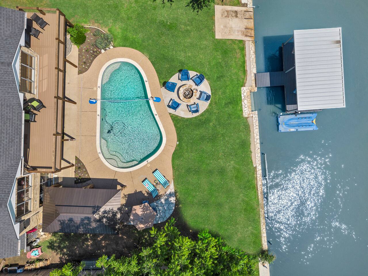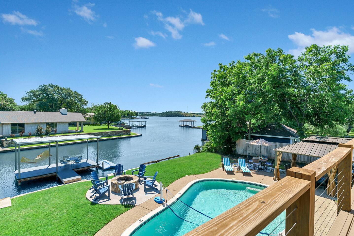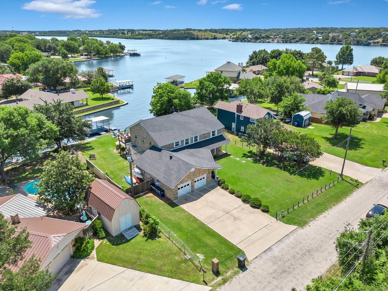 Experience the ultimate lake vacation at Skyview Lakehouse – the go-to destination house in Granbury! This private home sits on a 1/3 acre lot on a peaceful canal that opens up to Lake Granbury, offering stunning sunrise views and a spackling of birds saying their morning hellos. Perfect for families and friends, our spacious house with 5 bedrooms and 4 baths comfortably sleeps up to 12 people. Equipped with all linens, bathroom and pool towels, dishes, kitchen wares, and more, you'll feel right at home. Plus, we have large kitchens and dining spaces both upstairs and downstairs which allows for easy and seamless meal prep and dining. But what truly sets us apart are our incredible entertainment options. Take advantage of our two game rooms featuring a variety of games including: *a full-sized pool table *basketball game *shuffleboard *darts *ping pong *and more. Sports lovers, don't forget to bring your logins for Youtube, ESPN, or your favorite streaming service-- so you won't miss a single game, even while on vacations! Relax by the full-sized pool in the backyard, roast s'mores over the stone fire pit, or take out our provided kayaks or tie up your boat at our exclusive boat dock. The backyard also features a covered patio with several grills, seating, and pool toys, as well as ample space for soccer or unwinding. And when the day comes to a close, retire to one of our beautifully appointed bedrooms - each with plenty of closet space and comfortable bedding. With high-speed Wi-Fi throughout the house, you can easily stay connected while escaping the hustle and bustle of everyday life. Book your stay at Skyview Lakehouse today and experience the ultimate lake vacation! Bedroom Layouts: Captain's Quarters (downstairs) King bed, Twin bed, Twin Trundle En-suite bathroom with standup shower and single sink The Bunk Room (downstairs) 2 Twin Beds over 2 Queen beds En-suite bathroom with bathtub and dual sinks The Sunset Room (upstairs) King bed Shared bathroom with large remodeled walk in shower and single sink The Beach Room (upstairs) Queen bed Cowtown (upstairs) King bed Shared bathroom with stand-up shower, sit down vanity and dual sinks How far it is to.... Fossil Rim Wildlife Center: 20 miles Dinosaur Valley State Park: 26 miles Fort Worth Zoo: 27 miles Historic Fort Worth Stockyards: 31 miles Dallas World Aquarium: 57 miles John F Kennedy Memorial Museum: 68 miles Chip and Johanna Gaines Magnolia Silos and Market: 71 miles FAQ: Q: Is there a place to pull my boat up to the house? A: Yes, we have a dock with numbers where you can tie up your boat or jet ski Q: Where is the nearest boat ramp? A: The closest public boat ramp via car is across from Mesquite Pit restaurant on Pearl St. (It is a 14 minute drive) The restaurant address is 919 E Pearl St, Granbury. The entrance to the boat ramp area is directly across from it on the other side of of Pearl St. Q: Where can I park my boat and trailer? A: A trailer/boat can be parked in the grass along the street directly in front of the house, or along the grass on the other side of the driveway on the north side of the home. Q: Is the pool heated? A: No, but you can still find my kids swimming in it most of the year . Q: Can we bring our furry family member? A: We do allow house-trained dogs upon request.