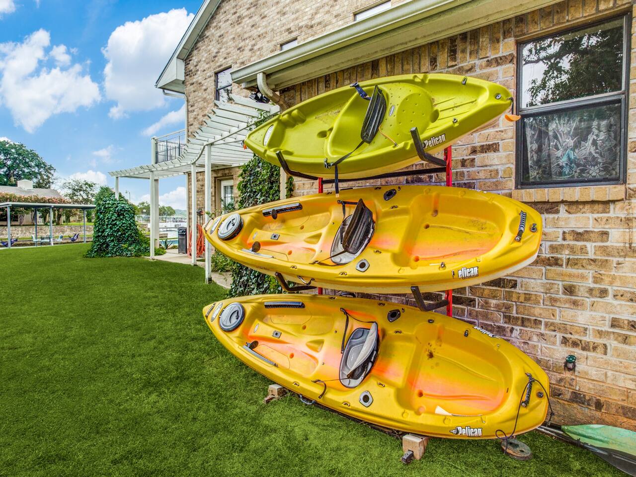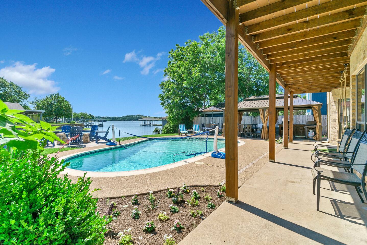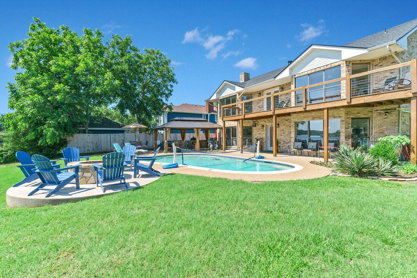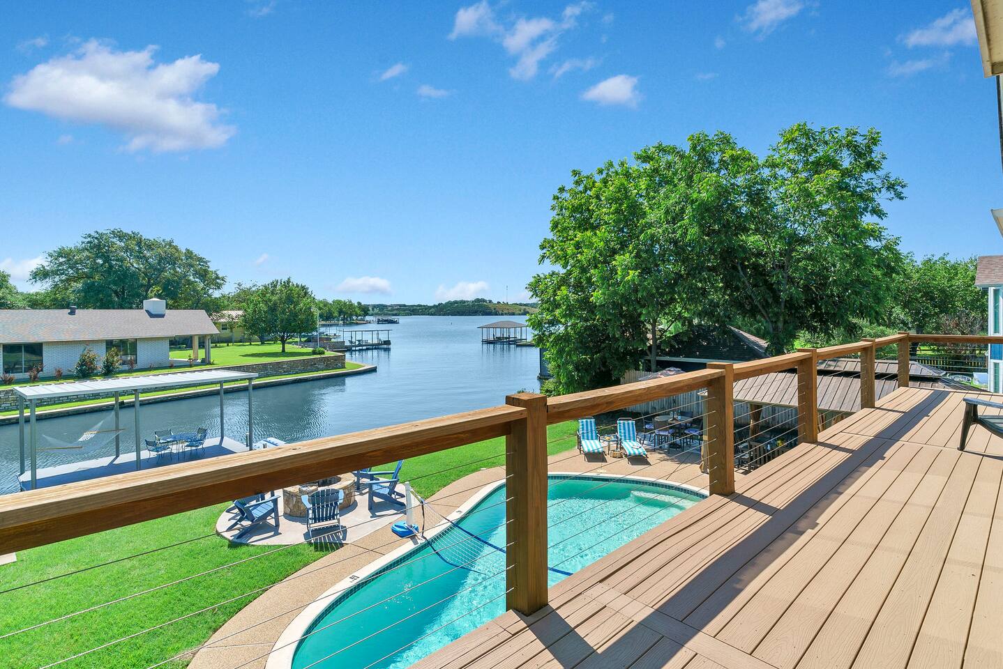 Experience the ultimate lake vacation at Skyview Lakehouse – the go-to destination house in Granbury! This private home sits on a 1/3 acre lot on a peaceful canal that opens up to Lake Granbury, offering stunning sunrise views and a spackling of birds saying their morning hellos. Perfect for families and friends, our spacious house with 5 bedrooms and 4 baths comfortably sleeps up to 12 people. Equipped with all linens, bathroom and pool towels, dishes, kitchen wares, and more, you'll feel right at home. Plus, we have large kitchens and dining spaces both upstairs and downstairs which allows for easy and seamless meal prep and dining. But what truly sets us apart are our incredible entertainment options. Take advantage of our two game rooms featuring a variety of games including: *a full-sized pool table *basketball game *shuffleboard *darts *ping pong *and more. Sports lovers, don't forget to bring your logins for Youtube, ESPN, or your favorite streaming service-- so you won't miss a single game, even while on vacations! Relax by the full-sized pool in the backyard, roast s'mores over the stone fire pit, or take out our provided kayaks or tie up your boat at our exclusive boat dock. The backyard also features a covered patio with several grills, seating, and pool toys, as well as ample space for soccer or unwinding. And when the day comes to a close, retire to one of our beautifully appointed bedrooms - each with plenty of closet space and comfortable bedding. With high-speed Wi-Fi throughout the house, you can easily stay connected while escaping the hustle and bustle of everyday life. Book your stay at Skyview Lakehouse today and experience the ultimate lake vacation! Bedroom Layouts: Captain's Quarters (downstairs) King bed, Twin bed, Twin Trundle En-suite bathroom with standup shower and single sink The Bunk Room (downstairs) 2 Twin Beds over 2 Queen beds En-suite bathroom with bathtub and dual sinks The Sunset Room (upstairs) King bed Shared bathroom with large remodeled walk in shower and single sink The Beach Room (upstairs) Queen bed Cowtown (upstairs) King bed Shared bathroom with stand-up shower, sit down vanity and dual sinks How far it is to.... Fossil Rim Wildlife Center: 20 miles Dinosaur Valley State Park: 26 miles Fort Worth Zoo: 27 miles Historic Fort Worth Stockyards: 31 miles Dallas World Aquarium: 57 miles John F Kennedy Memorial Museum: 68 miles Chip and Johanna Gaines Magnolia Silos and Market: 71 miles FAQ: Q: Is there a place to pull my boat up to the house? A: Yes, we have a dock with numbers where you can tie up your boat or jet ski Q: Where is the nearest boat ramp? A: The closest public boat ramp via car is across from Mesquite Pit restaurant on Pearl St. (It is a 14 minute drive) The restaurant address is 919 E Pearl St, Granbury. The entrance to the boat ramp area is directly across from it on the other side of of Pearl St. Q: Where can I park my boat and trailer? A: A trailer/boat can be parked in the grass along the street directly in front of the house, or along the grass on the other side of the driveway on the north side of the home. Q: Is the pool heated? A: No, but you can still find my kids swimming in it most of the year . Q: Can we bring our furry family member? A: We do allow house-trained dogs upon request.
