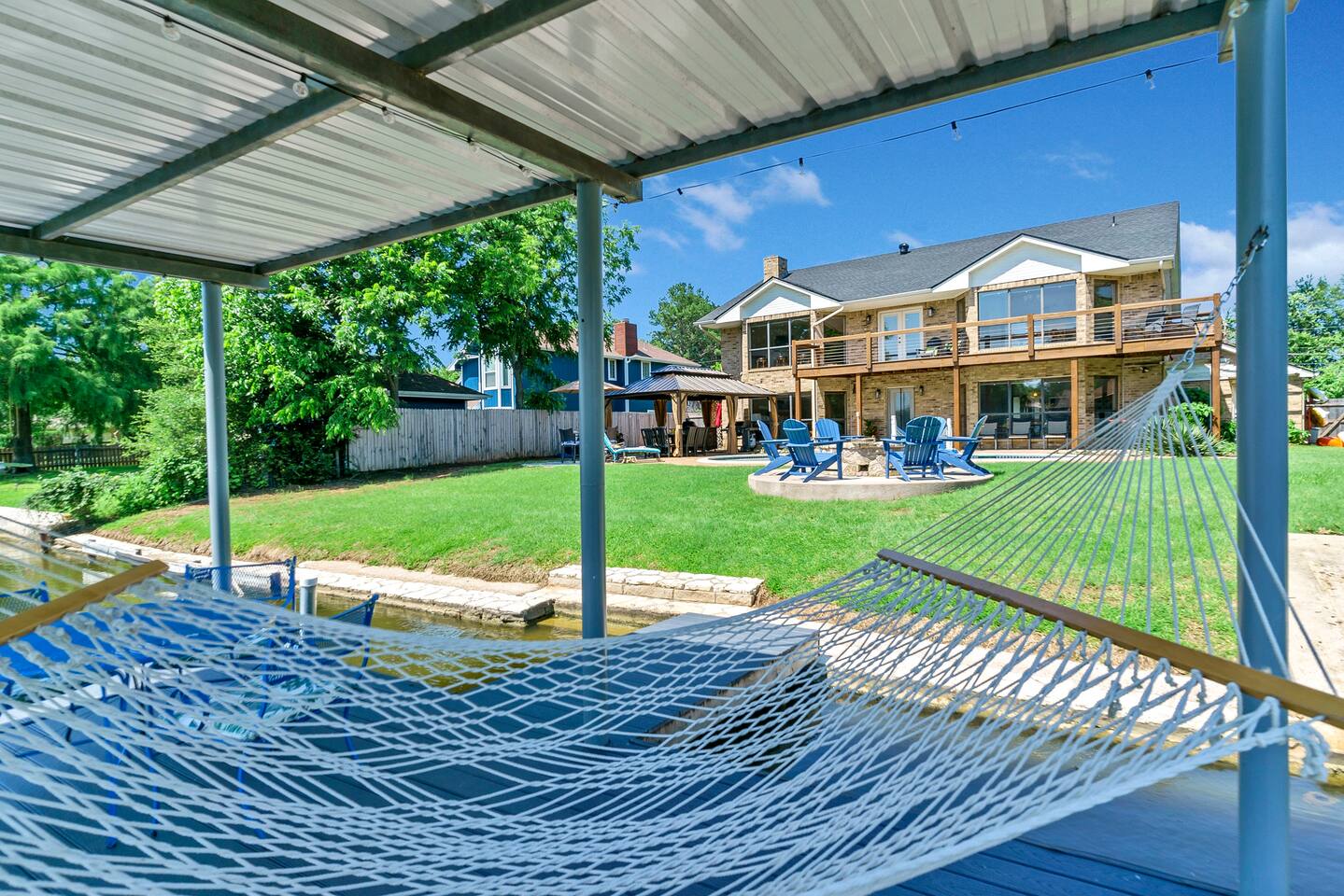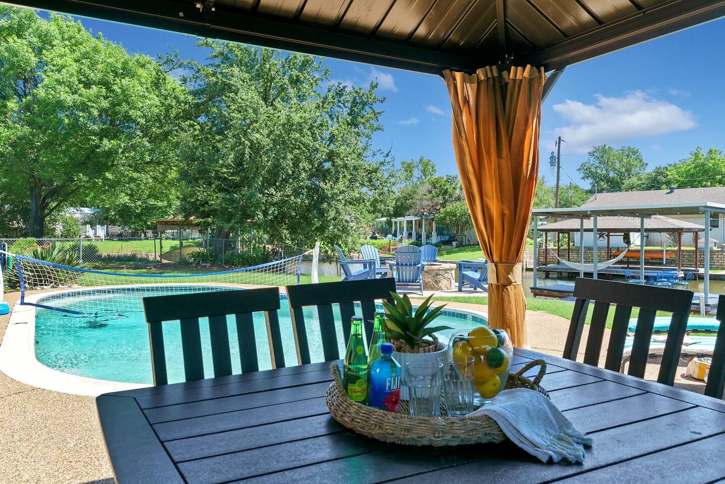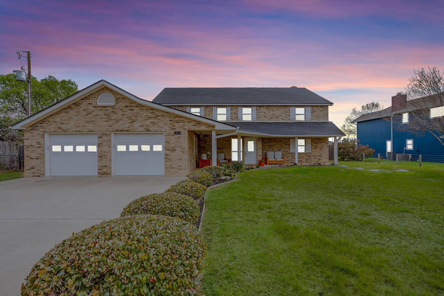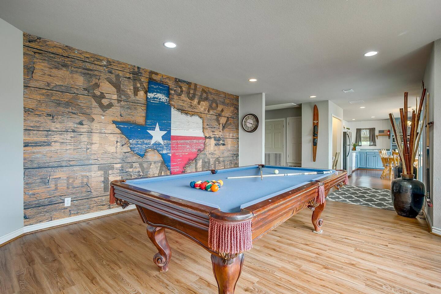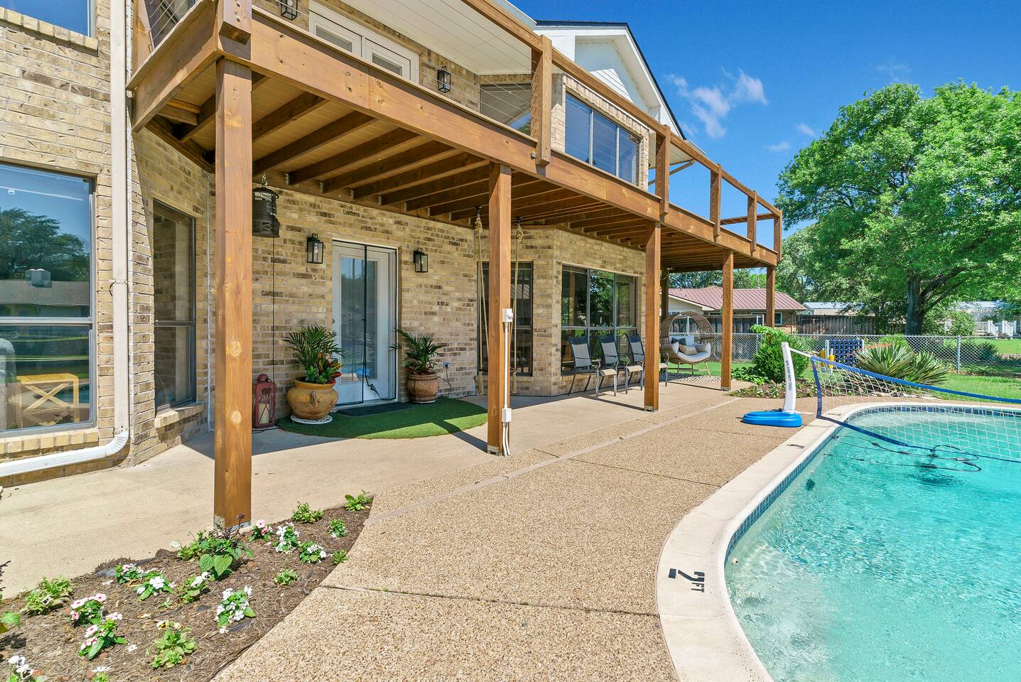 Experience the ultimate lake vacation at Skyview Lakehouse – the go-to destination house in Granbury! This private home sits on a 1/3 acre lot on a peaceful canal that opens up to Lake Granbury, offering stunning sunrise views and a spackling of birds saying their morning hellos. Perfect for families and friends, our spacious house with 5 bedrooms and 4 baths comfortably sleeps up to 12 people. Equipped with all linens, bathroom and pool towels, dishes, kitchen wares, and more, you'll feel right at home. Plus, we have large kitchens and dining spaces both upstairs and downstairs which allows for easy and seamless meal prep and dining. But what truly sets us apart are our incredible entertainment options. Take advantage of our two game rooms featuring a variety of games including: *a full-sized pool table *basketball game *shuffleboard *darts *ping pong *and more. Sports lovers, don't forget to bring your logins for Youtube, ESPN, or your favorite streaming service-- so you won't miss a single game, even while on vacations! Relax by the full-sized pool in the backyard, roast s'mores over the stone fire pit, or take out our provided kayaks or tie up your boat at our exclusive boat dock. The backyard also features a covered patio with several grills, seating, and pool toys, as well as ample space for soccer or unwinding. And when the day comes to a close, retire to one of our beautifully appointed bedrooms - each with plenty of closet space and comfortable bedding. With high-speed Wi-Fi throughout the house, you can easily stay connected while escaping the hustle and bustle of everyday life. Book your stay at Skyview Lakehouse today and experience the ultimate lake vacation! Bedroom Layouts: Captain's Quarters (downstairs) King bed, Twin bed, Twin Trundle En-suite bathroom with standup shower and single sink The Bunk Room (downstairs) 2 Twin Beds over 2 Queen beds En-suite bathroom with bathtub and dual sinks The Sunset Room (upstairs) King bed Shared bathroom with large remodeled walk in shower and single sink The Beach Room (upstairs) Queen bed Cowtown (upstairs) King bed Shared bathroom with stand-up shower, sit down vanity and dual sinks How far it is to.... Fossil Rim Wildlife Center: 20 miles Dinosaur Valley State Park: 26 miles Fort Worth Zoo: 27 miles Historic Fort Worth Stockyards: 31 miles Dallas World Aquarium: 57 miles John F Kennedy Memorial Museum: 68 miles Chip and Johanna Gaines Magnolia Silos and Market: 71 miles FAQ: Q: Is there a place to pull my boat up to the house? A: Yes, we have a dock with numbers where you can tie up your boat or jet ski Q: Where is the nearest boat ramp? A: The closest public boat ramp via car is across from Mesquite Pit restaurant on Pearl St. (It is a 14 minute drive) The restaurant address is 919 E Pearl St, Granbury. The entrance to the boat ramp area is directly across from it on the other side of of Pearl St. Q: Where can I park my boat and trailer? A: A trailer/boat can be parked in the grass along the street directly in front of the house, or along the grass on the other side of the driveway on the north side of the home. Q: Is the pool heated? A: No, but you can still find my kids swimming in it most of the year . Q: Can we bring our furry family member? A: We do allow house-trained dogs upon request.