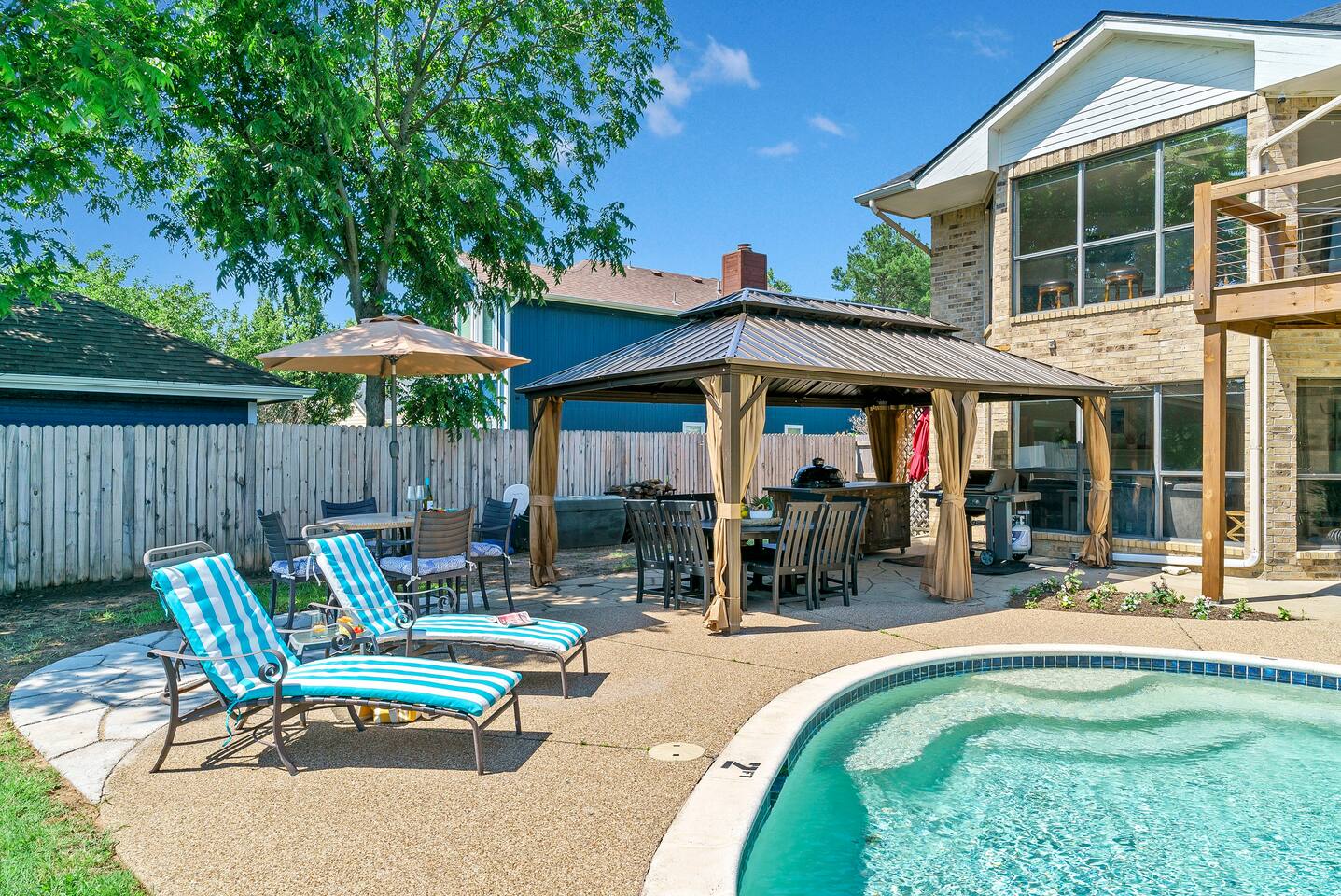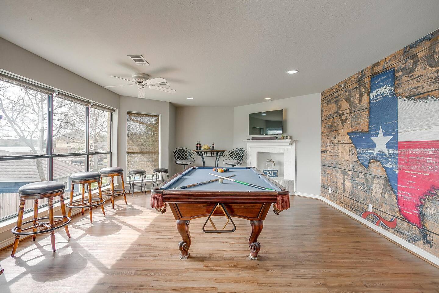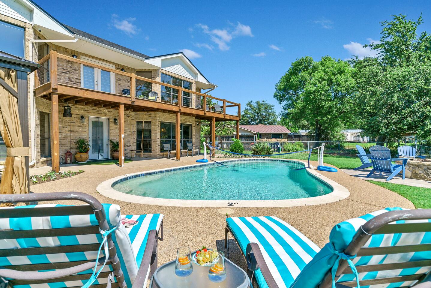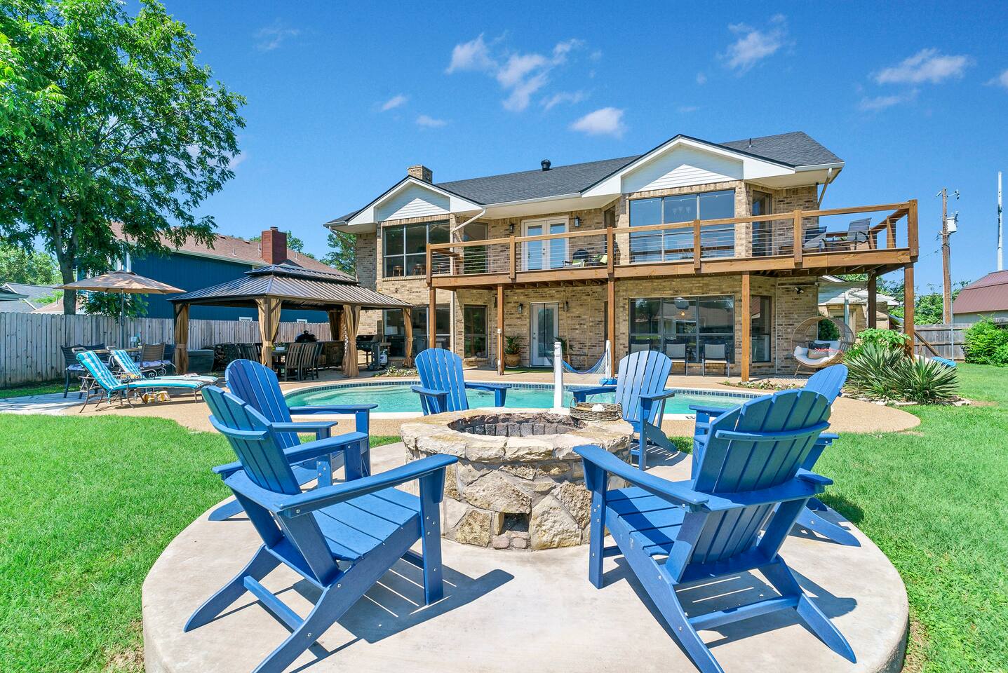 Experience the ultimate lake vacation at Skyview Lakehouse – the go-to destination house in Granbury! This private home sits on a 1/3 acre lot on a peaceful canal that opens up to Lake Granbury, offering stunning sunrise views and a spackling of birds saying their morning hellos. Perfect for families and friends, our spacious house with 5 bedrooms and 4 baths comfortably sleeps up to 12 people. Equipped with all linens, bathroom and pool towels, dishes, kitchen wares, and more, you'll feel right at home. Plus, we have large kitchens and dining spaces both upstairs and downstairs which allows for easy and seamless meal prep and dining. But what truly sets us apart are our incredible entertainment options. Take advantage of our two game rooms featuring a variety of games including: *a full-sized pool table *basketball game *shuffleboard *darts *ping pong *and more. Sports lovers, don't forget to bring your logins for Youtube, ESPN, or your favorite streaming service-- so you won't miss a single game, even while on vacations! Relax by the full-sized pool in the backyard, roast s'mores over the stone fire pit, or take out our provided kayaks or tie up your boat at our exclusive boat dock. The backyard also features a covered patio with several grills, seating, and pool toys, as well as ample space for soccer or unwinding. And when the day comes to a close, retire to one of our beautifully appointed bedrooms - each with plenty of closet space and comfortable bedding. With high-speed Wi-Fi throughout the house, you can easily stay connected while escaping the hustle and bustle of everyday life. Book your stay at Skyview Lakehouse today and experience the ultimate lake vacation! Bedroom Layouts: Captain's Quarters (downstairs) King bed, Twin bed, Twin Trundle En-suite bathroom with standup shower and single sink The Bunk Room (downstairs) 2 Twin Beds over 2 Queen beds En-suite bathroom with bathtub and dual sinks The Sunset Room (upstairs) King bed Shared bathroom with large remodeled walk in shower and single sink The Beach Room (upstairs) Queen bed Cowtown (upstairs) King bed Shared bathroom with stand-up shower, sit down vanity and dual sinks How far it is to.... Fossil Rim Wildlife Center: 20 miles Dinosaur Valley State Park: 26 miles Fort Worth Zoo: 27 miles Historic Fort Worth Stockyards: 31 miles Dallas World Aquarium: 57 miles John F Kennedy Memorial Museum: 68 miles Chip and Johanna Gaines Magnolia Silos and Market: 71 miles FAQ: Q: Is there a place to pull my boat up to the house? A: Yes, we have a dock with numbers where you can tie up your boat or jet ski Q: Where is the nearest boat ramp? A: The closest public boat ramp via car is across from Mesquite Pit restaurant on Pearl St. (It is a 14 minute drive) The restaurant address is 919 E Pearl St, Granbury. The entrance to the boat ramp area is directly across from it on the other side of of Pearl St. Q: Where can I park my boat and trailer? A: A trailer/boat can be parked in the grass along the street directly in front of the house, or along the grass on the other side of the driveway on the north side of the home. Q: Is the pool heated? A: No, but you can still find my kids swimming in it most of the year . Q: Can we bring our furry family member? A: We do allow house-trained dogs upon request.