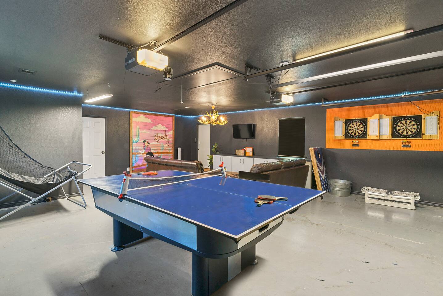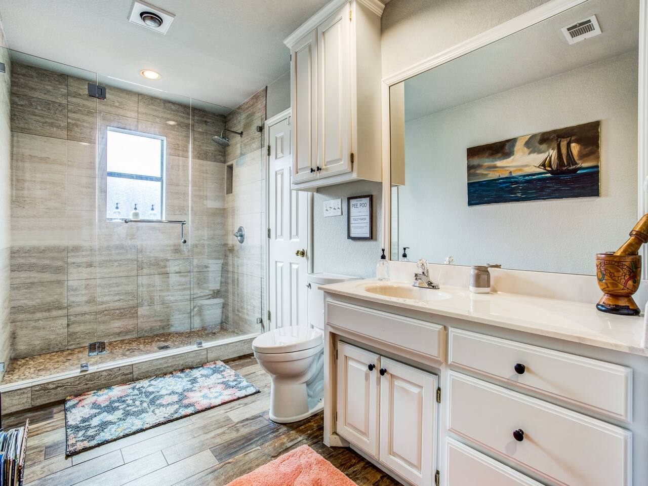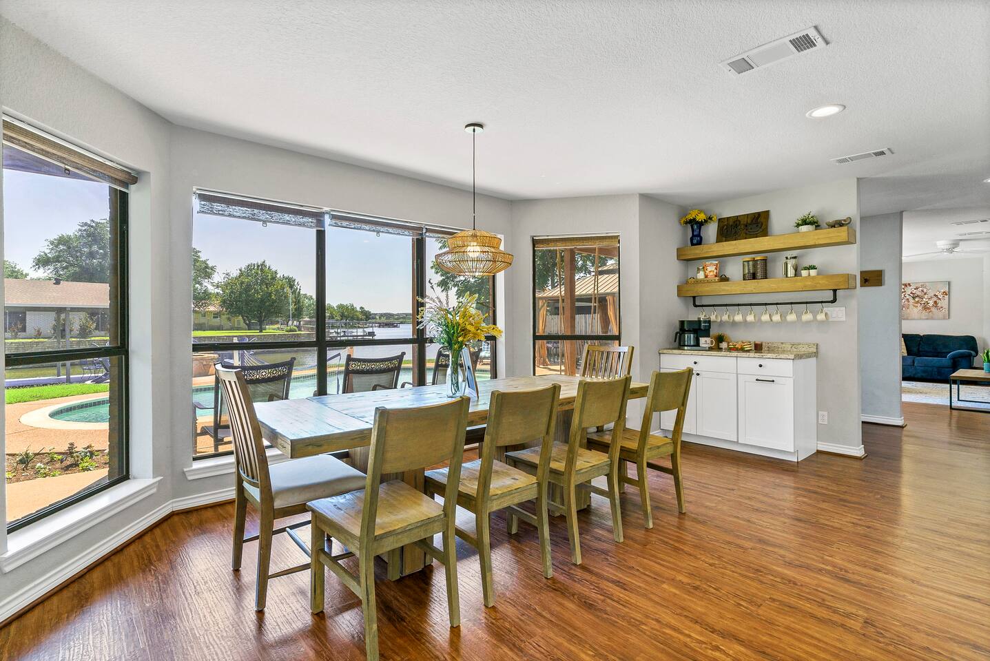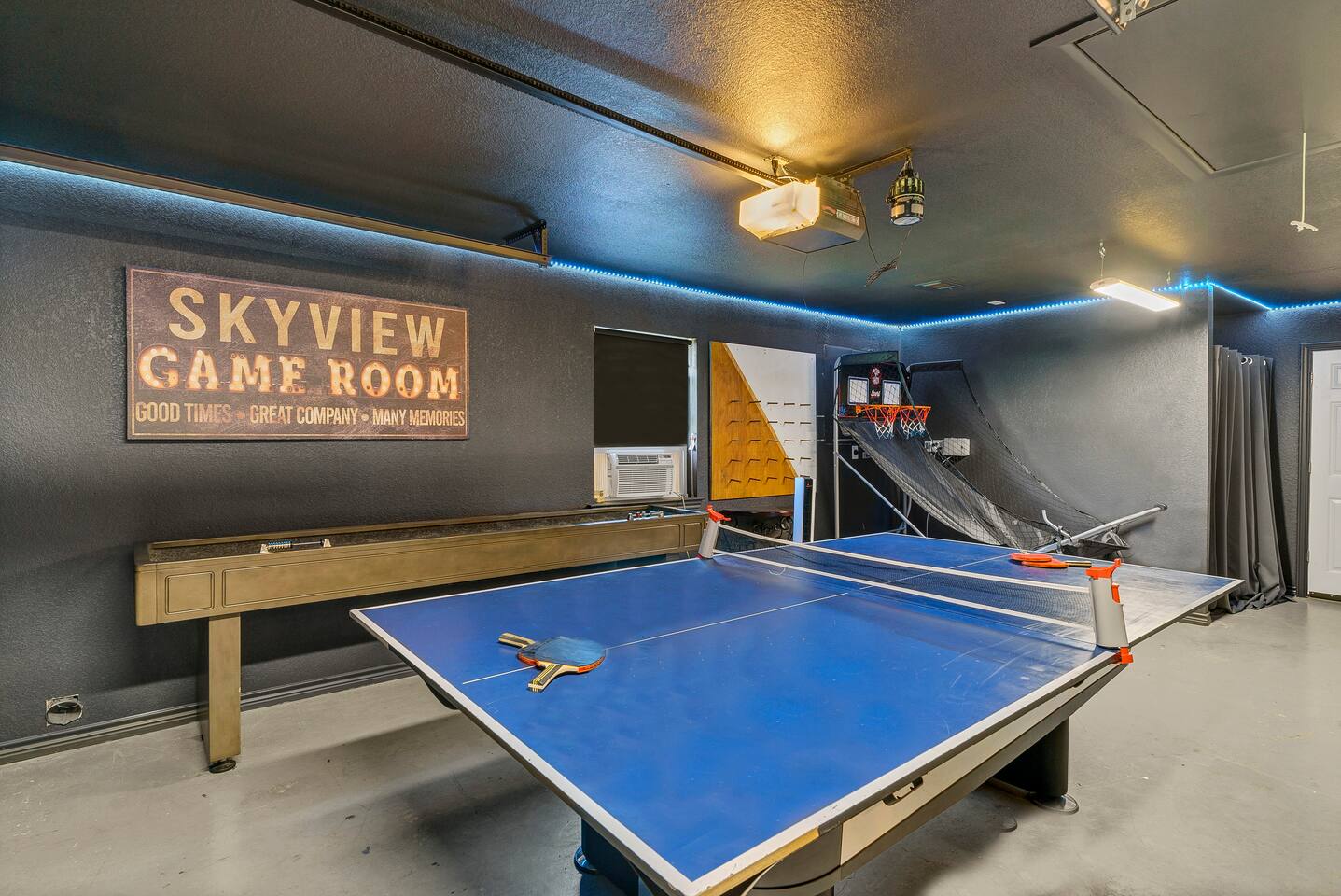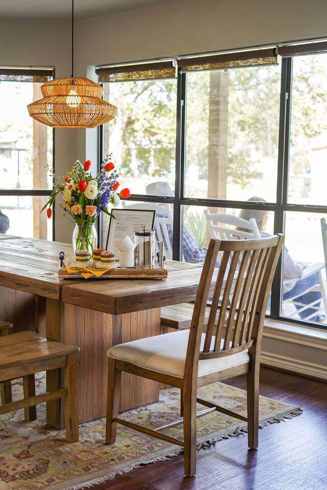 Experience the ultimate lake vacation at Skyview Lakehouse – the go-to destination house in Granbury! This private home sits on a 1/3 acre lot on a peaceful canal that opens up to Lake Granbury, offering stunning sunrise views and a spackling of birds saying their morning hellos. Perfect for families and friends, our spacious house with 5 bedrooms and 4 baths comfortably sleeps up to 12 people. Equipped with all linens, bathroom and pool towels, dishes, kitchen wares, and more, you'll feel right at home. Plus, we have large kitchens and dining spaces both upstairs and downstairs which allows for easy and seamless meal prep and dining. But what truly sets us apart are our incredible entertainment options. Take advantage of our two game rooms featuring a variety of games including: *a full-sized pool table *basketball game *shuffleboard *darts *ping pong *and more. Sports lovers, don't forget to bring your logins for Youtube, ESPN, or your favorite streaming service-- so you won't miss a single game, even while on vacations! Relax by the full-sized pool in the backyard, roast s'mores over the stone fire pit, or take out our provided kayaks or tie up your boat at our exclusive boat dock. The backyard also features a covered patio with several grills, seating, and pool toys, as well as ample space for soccer or unwinding. And when the day comes to a close, retire to one of our beautifully appointed bedrooms - each with plenty of closet space and comfortable bedding. With high-speed Wi-Fi throughout the house, you can easily stay connected while escaping the hustle and bustle of everyday life. Book your stay at Skyview Lakehouse today and experience the ultimate lake vacation! Bedroom Layouts: Captain's Quarters (downstairs) King bed, Twin bed, Twin Trundle En-suite bathroom with standup shower and single sink The Bunk Room (downstairs) 2 Twin Beds over 2 Queen beds En-suite bathroom with bathtub and dual sinks The Sunset Room (upstairs) King bed Shared bathroom with large remodeled walk in shower and single sink The Beach Room (upstairs) Queen bed Cowtown (upstairs) King bed Shared bathroom with stand-up shower, sit down vanity and dual sinks How far it is to.... Fossil Rim Wildlife Center: 20 miles Dinosaur Valley State Park: 26 miles Fort Worth Zoo: 27 miles Historic Fort Worth Stockyards: 31 miles Dallas World Aquarium: 57 miles John F Kennedy Memorial Museum: 68 miles Chip and Johanna Gaines Magnolia Silos and Market: 71 miles FAQ: Q: Is there a place to pull my boat up to the house? A: Yes, we have a dock with numbers where you can tie up your boat or jet ski Q: Where is the nearest boat ramp? A: The closest public boat ramp via car is across from Mesquite Pit restaurant on Pearl St. (It is a 14 minute drive) The restaurant address is 919 E Pearl St, Granbury. The entrance to the boat ramp area is directly across from it on the other side of of Pearl St. Q: Where can I park my boat and trailer? A: A trailer/boat can be parked in the grass along the street directly in front of the house, or along the grass on the other side of the driveway on the north side of the home. Q: Is the pool heated? A: No, but you can still find my kids swimming in it most of the year . Q: Can we bring our furry family member? A: We do allow house-trained dogs upon request.