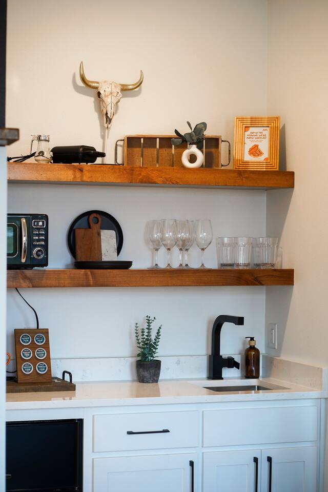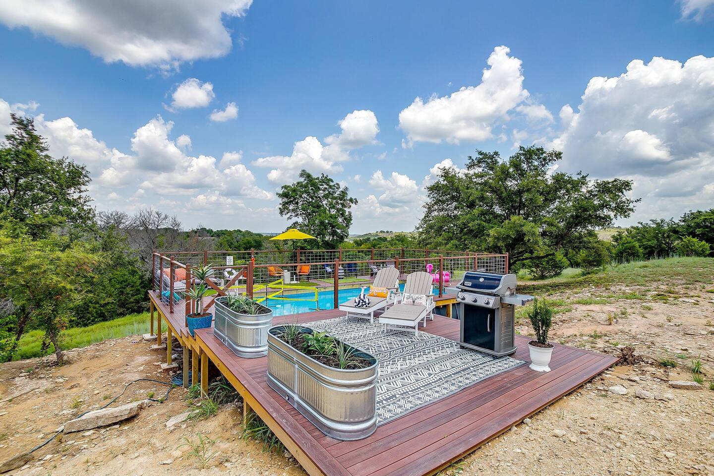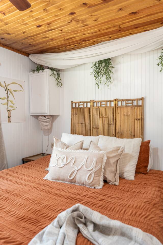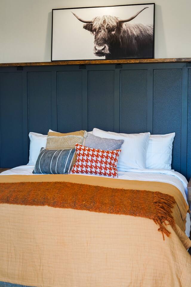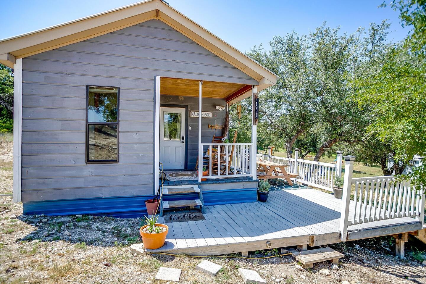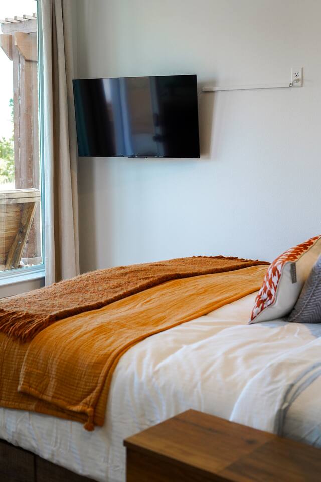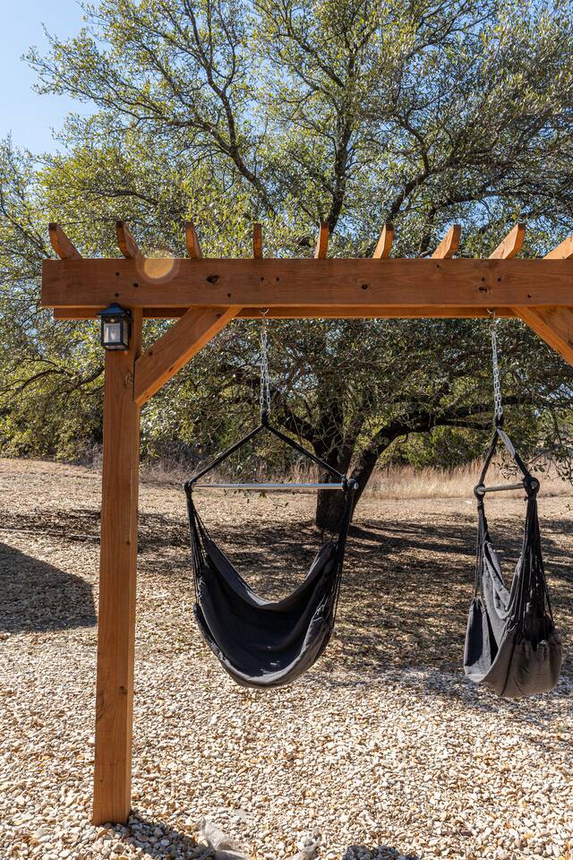 Wake Up in a Rustic Paradise... Picture waking up to the chirping of birds, enjoying the serenity of a picturesque valley filled with trees and charming landscapes. Nestled in the heart of the ranch, you'll find: Casa Blanca: When you enter our Ranch, Casa Blanca is your first stop! This newly built casa Blanca home boasts 5 King Suites and a Grand Hall. Each Villa features a kitchenette with fridge, mini freezer, full en-suite bathroom with shower, couch and eating area. The Grand Hall, which we've dubbed "The Gathering Room" boasts a large open space for your party to come together to cook meals in our brand new kitchen, fuel at our coffee bar, and eat at our large 10- seat dining table. The 32’ pool can be found just out the backyard. Additional sleeping accommodations: There are 4 twin-size air mattresses stored in the laundry room. These are available for guests to set up as needed—perfect for children or to accommodate additional guests in the Gathering Room or any of the Villas. Bed Configuration Option King beds in Villas 2, 3, 4, and 5 can be separated into twin beds prior to your arrival for a $50 per room fee. Please note, due to mattress toppers, this service may be unavailable after check in. Next, If you take the gravel road passed Casa Blanca, you will find a 3 acre valley with 3 COZY CABINS: Your first Cabin is Bamboo Bungalow A cozy 350 square foot getaway, perfect for couples or individuals. Inside you'll find a Bamboo oasis with a fully equipped kitchen and a comfortable king-sized bed. You can also relax outside on the wrap-around deck, rocking chairs, grill your favorite meat on the Weber gas grill, and savor your meal at the shaded picnic table. A stone's throw down the gravel road from Bamboo Bungalow is Cactus Cottage and Sunset Shack. These two cabins are connected by an ample 800 square foot covered deck where you can relish quality time with family while keeping an eye on the kids. Cactus Cottage You'll find the Cactus Cottage tailored to families with adorable Cactus décor complete with a comfy queen-sized bed, a day bed & trundle bed, and two adorable lofts perfect for the young ones. At night, peek out the bunk windows to catch a glimpse of the wildlife. There is a full sized bathroom with a shower/tub combo and single sink, as well as a kitchenette with full sized refrigerator. Sunset Shack The cozy Sunset Shack is outfitted with Sunset vibes décor! Inside you'll find a newly upgraded queen sized bed and comfortable sectional sofa. Above the living space, there is a ladder access to two more lofts with bean bags and coloring supplies, making it an ideal spot for a small family. A kitchenette boasts all the amenities you'll need (Keurig, Mini Fridge, Electric Cooktop) as well as a full bathroom with sink and vanity. Skyview Ranch Outdoor Amenities: 32’ pool Hydropool Swim Spa: When you need to cool off from the Texas heat, our 17 ft. long and 8 ft. wide hydro swim spa provides both swim and spa options in one delightful experience. Hiking: Hike through endless trails on the full 34 acre ranch and explore the beauty of our peaceful surroundings. Game Arena: We also offer exciting recreational activities such as our game arena with a horseshoe pit, tetherball court, and comfy seating. Fire Pits: We have a new updated stone firepit with swinging hammock chairs and 6 Adirondack chairs perfect for roasting smores under the starry night skies. Fishing: Bring your fishing poles as the pond off the dock is fully stocked! Outdoor Dining: If you're in the mood for a delightful picnic, you'll love our tree-shaded area featuring four picnic tables with enough seating for 24 and enchanting string lights. And don't forget to take a moment to relax on our inviting swing - it's pure magic! Pets: Our property is dog friendly! We allow dogs during your stay for a non-refundable $75 pet fee per pet. EV Charger: Tesla EV charger is installed and easily accessible to guests. Events: Events welcome! Inquire for pricing. Don't hesitate to contact us to find out more. Photography Sessions: With the incredible views at Skyview Ranch, it is a great place to take family photos! Message us about our recommended photographer! Pizza Oven Package: Ask us about our outdoor Pizza Oven package to be able to make your own individual sized 8" pizzas! How far it is to.... Granbury: Historic Granbury Square: 4.6 miles Glen Rose: Fossil Rim Wildlife Center: 12 miles Dinosaur Valley State Park: 13 miles Big Rocks Park: 15 miles Stephenville: Hard Eight BBQ: 23 miles Hico: Wiseman House Chocolates: 22 miles Fort Worth Historic Fort Worth Stockyards: 64 miles