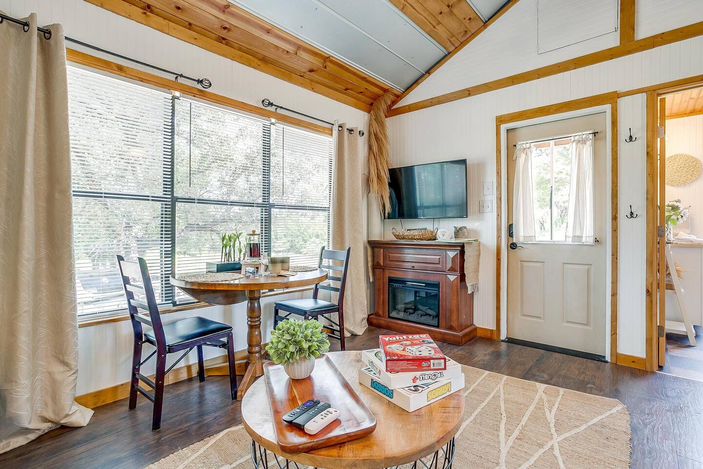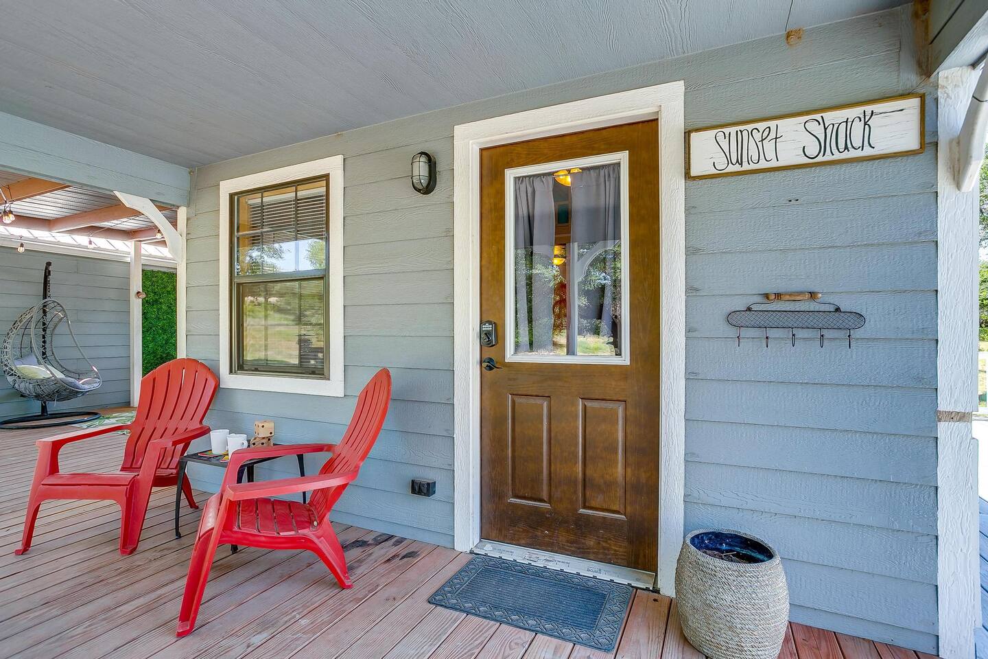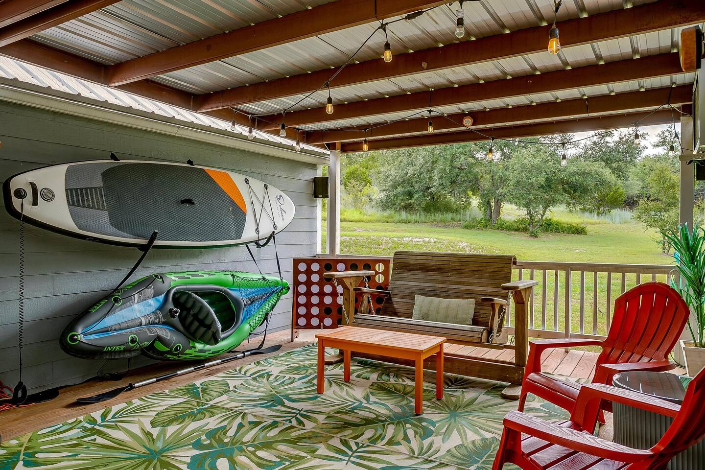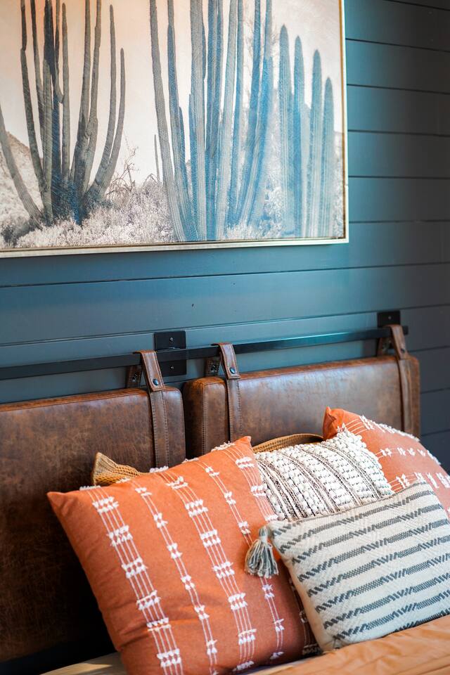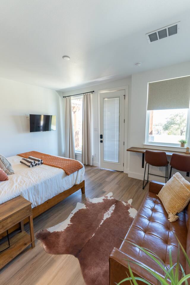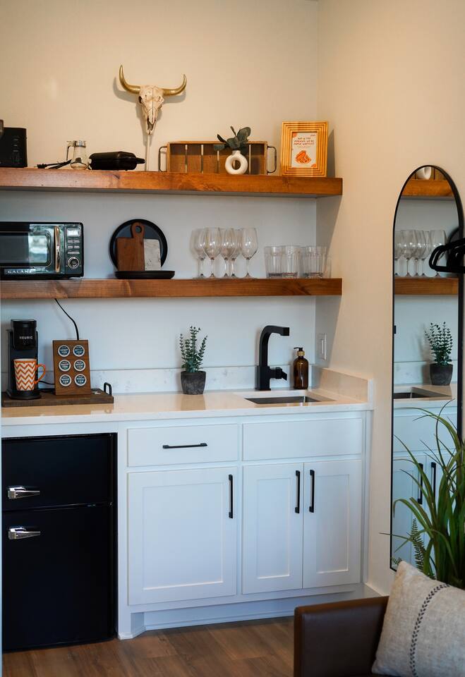 Wake Up in a Rustic Paradise... Picture waking up to the chirping of birds, enjoying the serenity of a picturesque valley filled with trees and charming landscapes. Nestled in the heart of the ranch, you'll find: Casa Blanca: When you enter our Ranch, Casa Blanca is your first stop! This newly built casa Blanca home boasts 5 King Suites and a Grand Hall. Each Villa features a kitchenette with fridge, mini freezer, full en-suite bathroom with shower, couch and eating area. The Grand Hall, which we've dubbed "The Gathering Room" boasts a large open space for your party to come together to cook meals in our brand new kitchen, fuel at our coffee bar, and eat at our large 10- seat dining table. The 32’ pool can be found just out the backyard. Additional sleeping accommodations: There are 4 twin-size air mattresses stored in the laundry room. These are available for guests to set up as needed—perfect for children or to accommodate additional guests in the Gathering Room or any of the Villas. Bed Configuration Option King beds in Villas 2, 3, 4, and 5 can be separated into twin beds prior to your arrival for a $50 per room fee. Please note, due to mattress toppers, this service may be unavailable after check in. Next, If you take the gravel road passed Casa Blanca, you will find a 3 acre valley with 3 COZY CABINS: Your first Cabin is Bamboo Bungalow A cozy 350 square foot getaway, perfect for couples or individuals. Inside you'll find a Bamboo oasis with a fully equipped kitchen and a comfortable king-sized bed. You can also relax outside on the wrap-around deck, rocking chairs, grill your favorite meat on the Weber gas grill, and savor your meal at the shaded picnic table. A stone's throw down the gravel road from Bamboo Bungalow is Cactus Cottage and Sunset Shack. These two cabins are connected by an ample 800 square foot covered deck where you can relish quality time with family while keeping an eye on the kids. Cactus Cottage You'll find the Cactus Cottage tailored to families with adorable Cactus décor complete with a comfy queen-sized bed, a day bed & trundle bed, and two adorable lofts perfect for the young ones. At night, peek out the bunk windows to catch a glimpse of the wildlife. There is a full sized bathroom with a shower/tub combo and single sink, as well as a kitchenette with full sized refrigerator. Sunset Shack The cozy Sunset Shack is outfitted with Sunset vibes décor! Inside you'll find a newly upgraded queen sized bed and comfortable sectional sofa. Above the living space, there is a ladder access to two more lofts with bean bags and coloring supplies, making it an ideal spot for a small family. A kitchenette boasts all the amenities you'll need (Keurig, Mini Fridge, Electric Cooktop) as well as a full bathroom with sink and vanity. Skyview Ranch Outdoor Amenities: 32’ pool Hydropool Swim Spa: When you need to cool off from the Texas heat, our 17 ft. long and 8 ft. wide hydro swim spa provides both swim and spa options in one delightful experience. Hiking: Hike through endless trails on the full 34 acre ranch and explore the beauty of our peaceful surroundings. Game Arena: We also offer exciting recreational activities such as our game arena with a horseshoe pit, tetherball court, and comfy seating. Fire Pits: We have a new updated stone firepit with swinging hammock chairs and 6 Adirondack chairs perfect for roasting smores under the starry night skies. Fishing: Bring your fishing poles as the pond off the dock is fully stocked! Outdoor Dining: If you're in the mood for a delightful picnic, you'll love our tree-shaded area featuring four picnic tables with enough seating for 24 and enchanting string lights. And don't forget to take a moment to relax on our inviting swing - it's pure magic! Pets: Our property is dog friendly! We allow dogs during your stay for a non-refundable $75 pet fee per pet. EV Charger: Tesla EV charger is installed and easily accessible to guests. Events: Events welcome! Inquire for pricing. Don't hesitate to contact us to find out more. Photography Sessions: With the incredible views at Skyview Ranch, it is a great place to take family photos! Message us about our recommended photographer! Pizza Oven Package: Ask us about our outdoor Pizza Oven package to be able to make your own individual sized 8" pizzas! How far it is to.... Granbury: Historic Granbury Square: 4.6 miles Glen Rose: Fossil Rim Wildlife Center: 12 miles Dinosaur Valley State Park: 13 miles Big Rocks Park: 15 miles Stephenville: Hard Eight BBQ: 23 miles Hico: Wiseman House Chocolates: 22 miles Fort Worth Historic Fort Worth Stockyards: 64 miles
