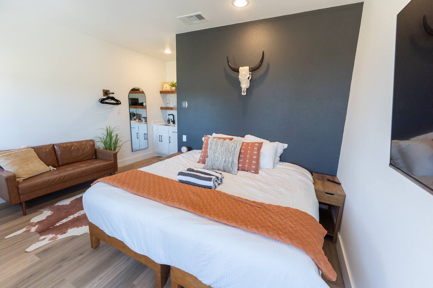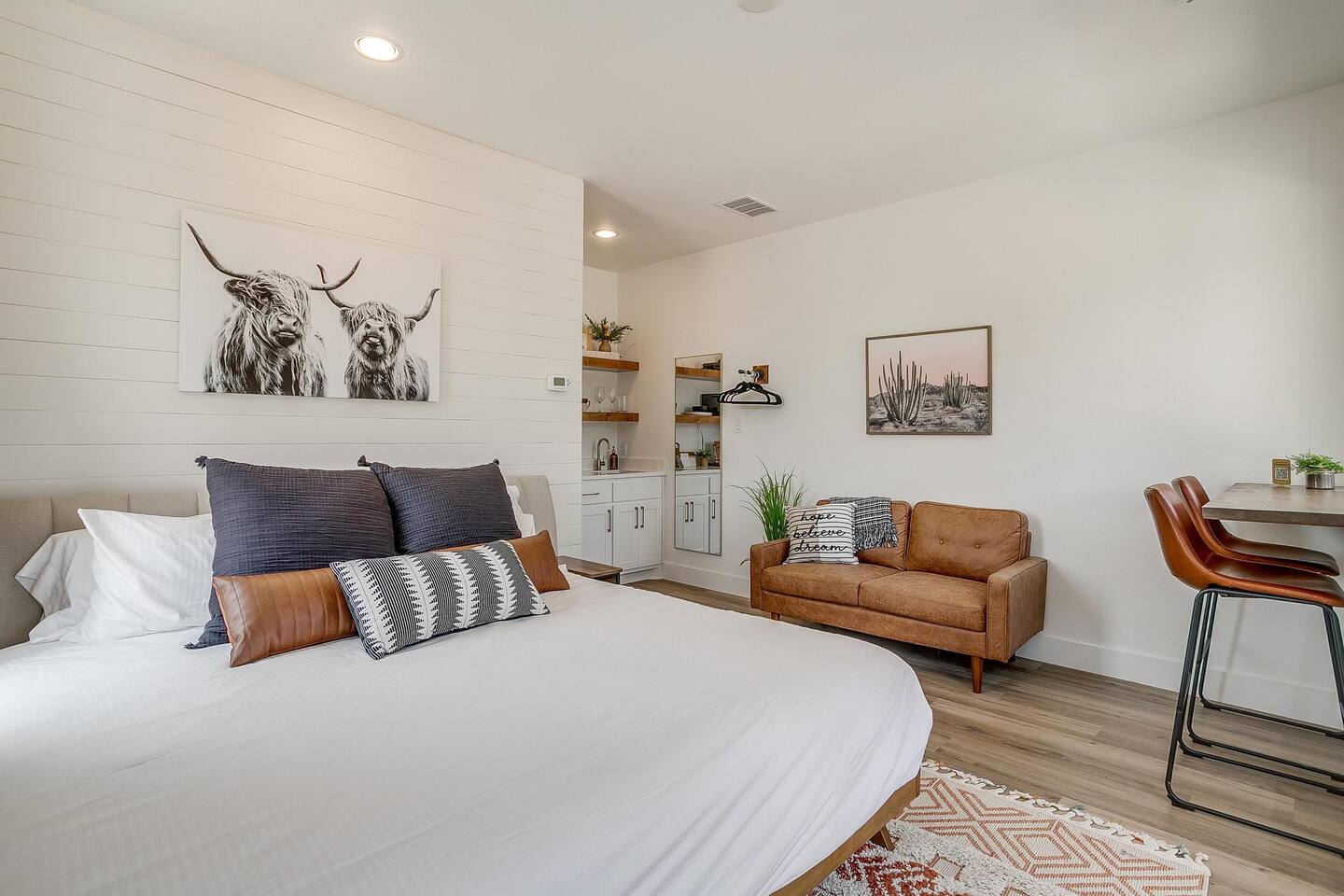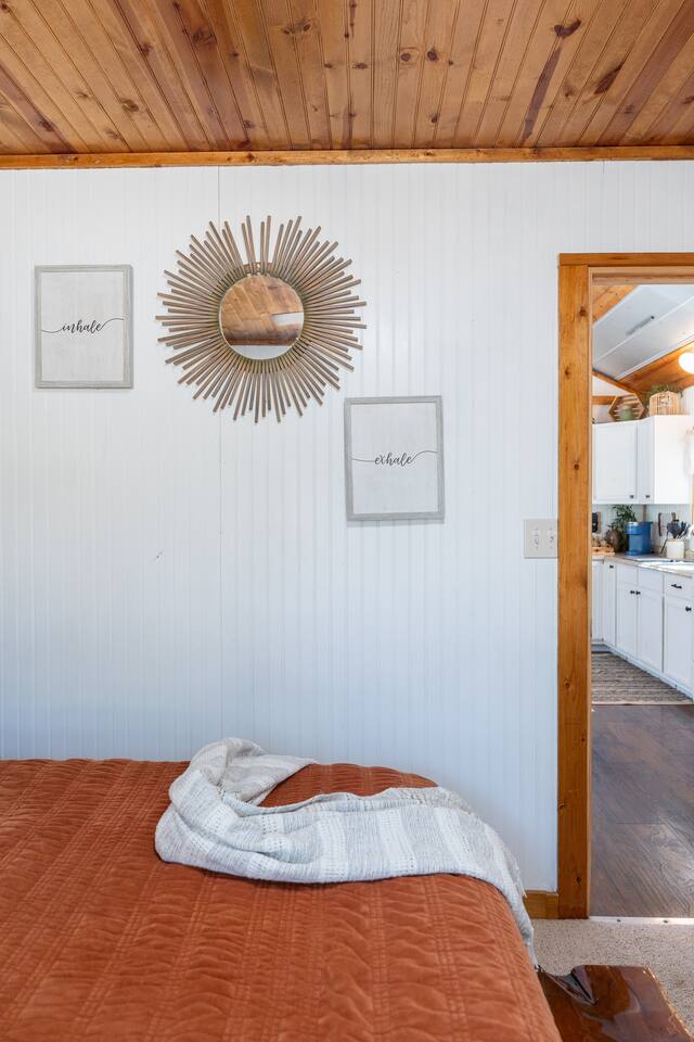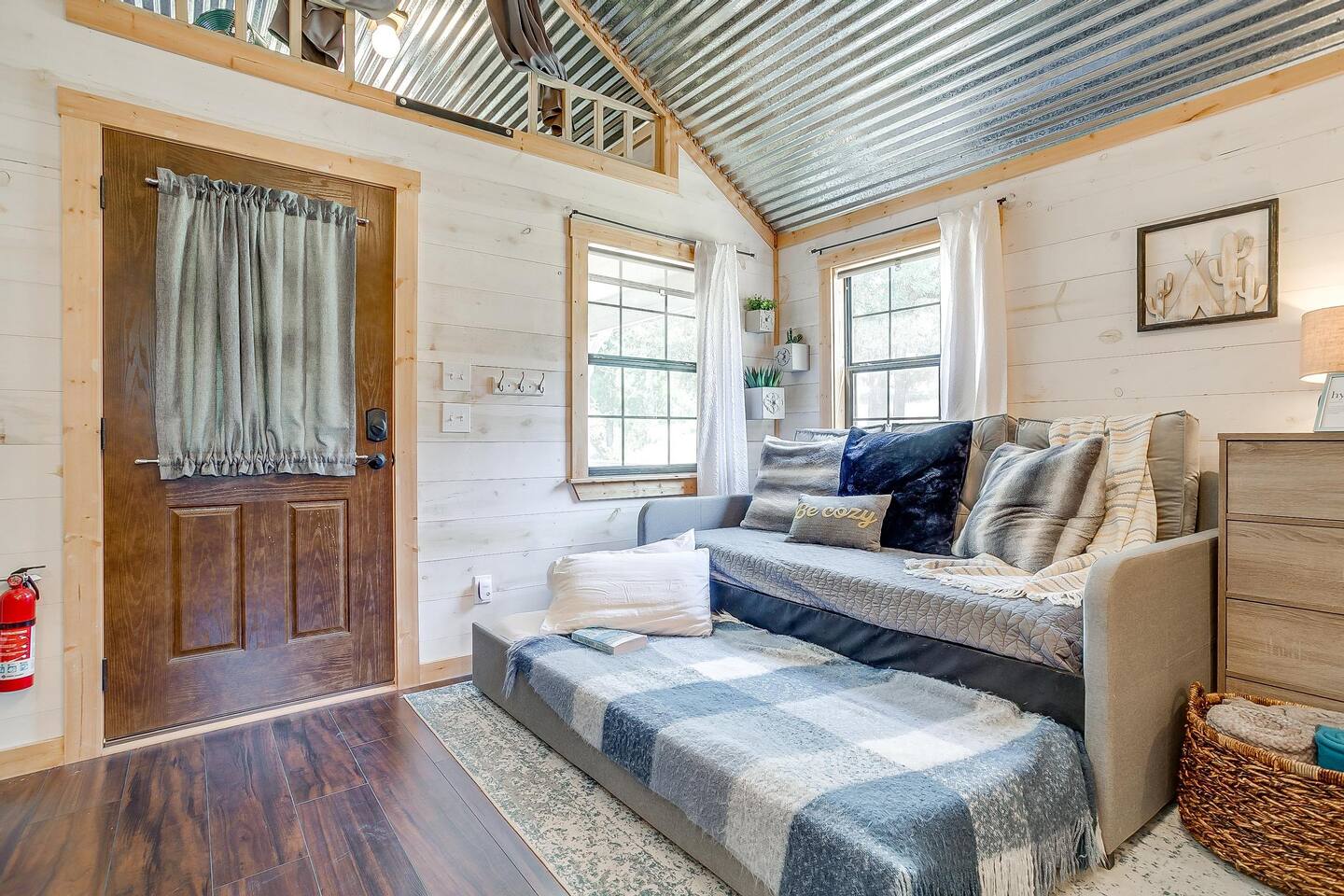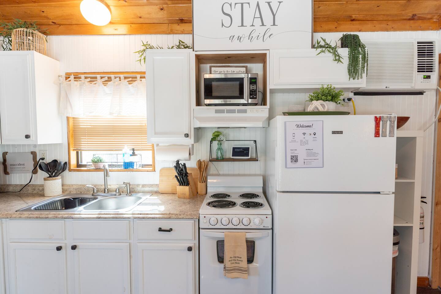 Wake Up in a Rustic Paradise... Picture waking up to the chirping of birds, enjoying the serenity of a picturesque valley filled with trees and charming landscapes. Nestled in the heart of the ranch, you'll find: Casa Blanca: When you enter our Ranch, Casa Blanca is your first stop! This newly built casa Blanca home boasts 5 King Suites and a Grand Hall. Each Villa features a kitchenette with fridge, mini freezer, full en-suite bathroom with shower, couch and eating area. The Grand Hall, which we've dubbed "The Gathering Room" boasts a large open space for your party to come together to cook meals in our brand new kitchen, fuel at our coffee bar, and eat at our large 10- seat dining table. The 32’ pool can be found just out the backyard. Additional sleeping accommodations: There are 4 twin-size air mattresses stored in the laundry room. These are available for guests to set up as needed—perfect for children or to accommodate additional guests in the Gathering Room or any of the Villas. Bed Configuration Option King beds in Villas 2, 3, 4, and 5 can be separated into twin beds prior to your arrival for a $50 per room fee. Please note, due to mattress toppers, this service may be unavailable after check in. Next, If you take the gravel road passed Casa Blanca, you will find a 3 acre valley with 3 COZY CABINS: Your first Cabin is Bamboo Bungalow A cozy 350 square foot getaway, perfect for couples or individuals. Inside you'll find a Bamboo oasis with a fully equipped kitchen and a comfortable king-sized bed. You can also relax outside on the wrap-around deck, rocking chairs, grill your favorite meat on the Weber gas grill, and savor your meal at the shaded picnic table. A stone's throw down the gravel road from Bamboo Bungalow is Cactus Cottage and Sunset Shack. These two cabins are connected by an ample 800 square foot covered deck where you can relish quality time with family while keeping an eye on the kids. Cactus Cottage You'll find the Cactus Cottage tailored to families with adorable Cactus décor complete with a comfy queen-sized bed, a day bed & trundle bed, and two adorable lofts perfect for the young ones. At night, peek out the bunk windows to catch a glimpse of the wildlife. There is a full sized bathroom with a shower/tub combo and single sink, as well as a kitchenette with full sized refrigerator. Sunset Shack The cozy Sunset Shack is outfitted with Sunset vibes décor! Inside you'll find a newly upgraded queen sized bed and comfortable sectional sofa. Above the living space, there is a ladder access to two more lofts with bean bags and coloring supplies, making it an ideal spot for a small family. A kitchenette boasts all the amenities you'll need (Keurig, Mini Fridge, Electric Cooktop) as well as a full bathroom with sink and vanity. Skyview Ranch Outdoor Amenities: 32’ pool Hydropool Swim Spa: When you need to cool off from the Texas heat, our 17 ft. long and 8 ft. wide hydro swim spa provides both swim and spa options in one delightful experience. Hiking: Hike through endless trails on the full 34 acre ranch and explore the beauty of our peaceful surroundings. Game Arena: We also offer exciting recreational activities such as our game arena with a horseshoe pit, tetherball court, and comfy seating. Fire Pits: We have a new updated stone firepit with swinging hammock chairs and 6 Adirondack chairs perfect for roasting smores under the starry night skies. Fishing: Bring your fishing poles as the pond off the dock is fully stocked! Outdoor Dining: If you're in the mood for a delightful picnic, you'll love our tree-shaded area featuring four picnic tables with enough seating for 24 and enchanting string lights. And don't forget to take a moment to relax on our inviting swing - it's pure magic! Pets: Our property is dog friendly! We allow dogs during your stay for a non-refundable $75 pet fee per pet. EV Charger: Tesla EV charger is installed and easily accessible to guests. Events: Events welcome! Inquire for pricing. Don't hesitate to contact us to find out more. Photography Sessions: With the incredible views at Skyview Ranch, it is a great place to take family photos! Message us about our recommended photographer! Pizza Oven Package: Ask us about our outdoor Pizza Oven package to be able to make your own individual sized 8" pizzas! How far it is to.... Granbury: Historic Granbury Square: 4.6 miles Glen Rose: Fossil Rim Wildlife Center: 12 miles Dinosaur Valley State Park: 13 miles Big Rocks Park: 15 miles Stephenville: Hard Eight BBQ: 23 miles Hico: Wiseman House Chocolates: 22 miles Fort Worth Historic Fort Worth Stockyards: 64 miles