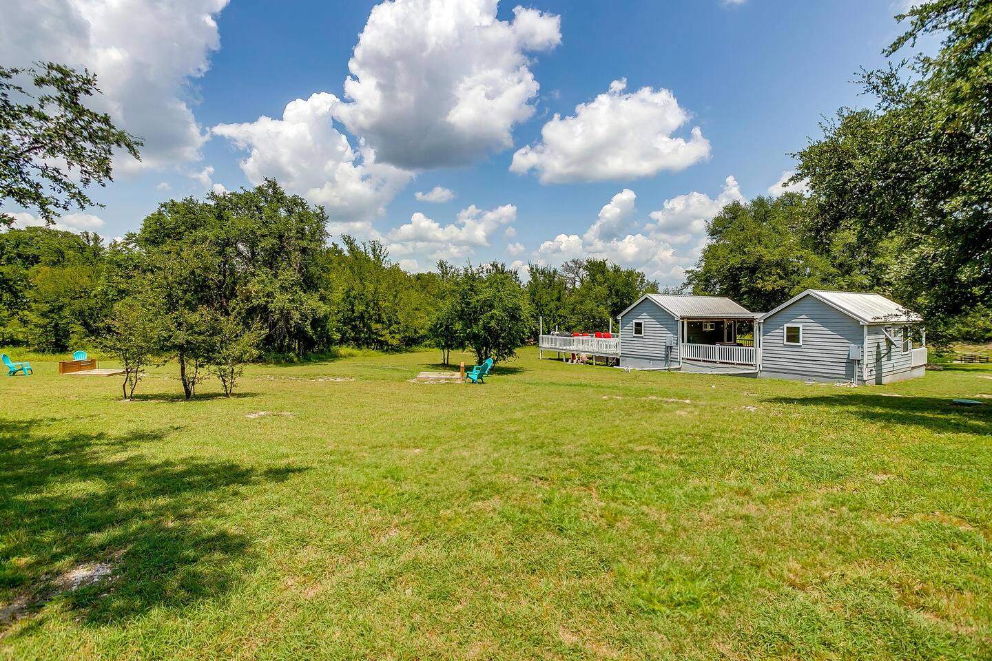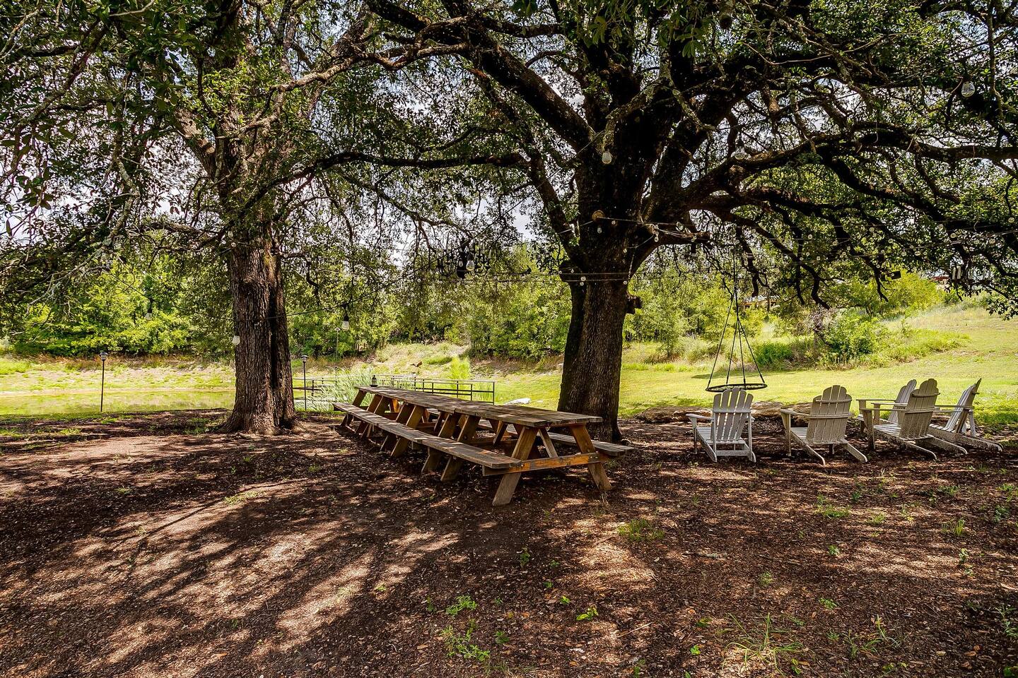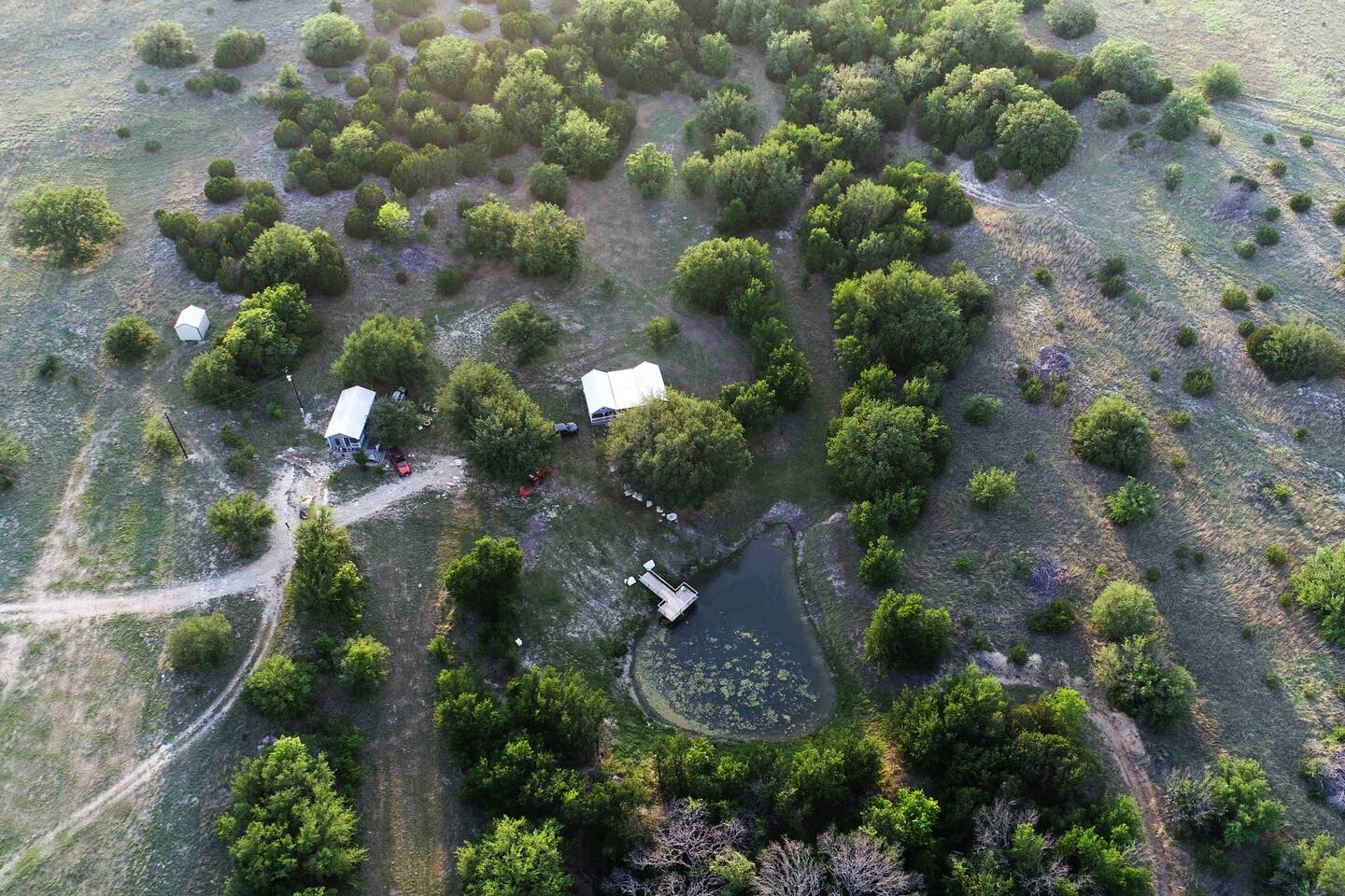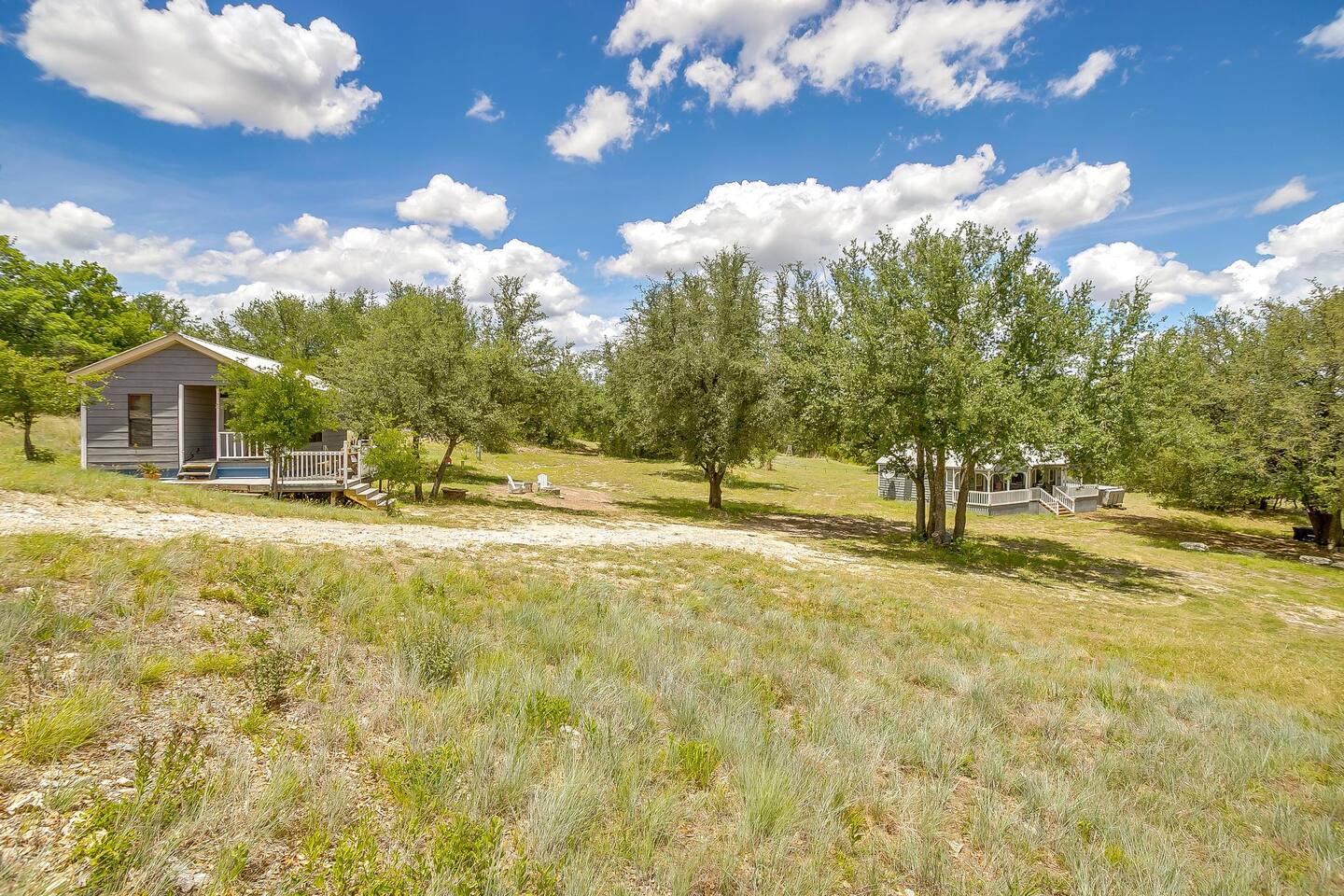 The drive into the property on Farm to Market Road 51, regardless of which side you coming from is a breathtaking drive! Surrounded by lush trees and peaceful farmlands, the beauty of the Texas Rolling Hills does not disappoint! You will be staying at a family ranch on 34 acres outside of city limits.