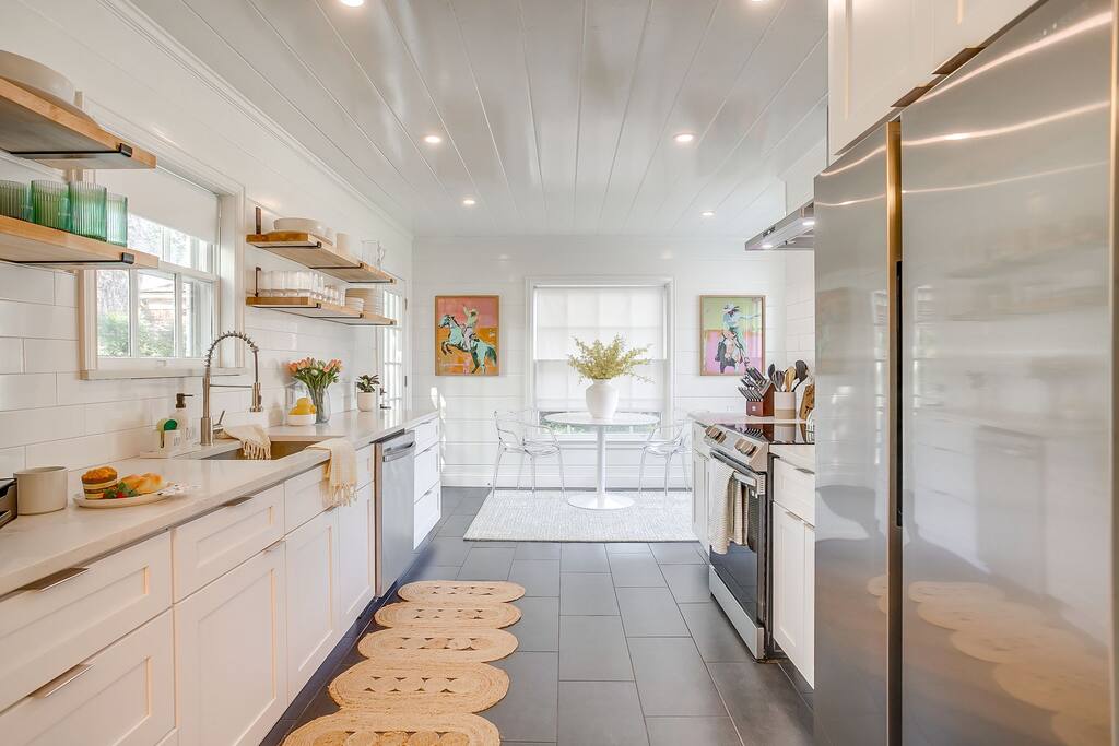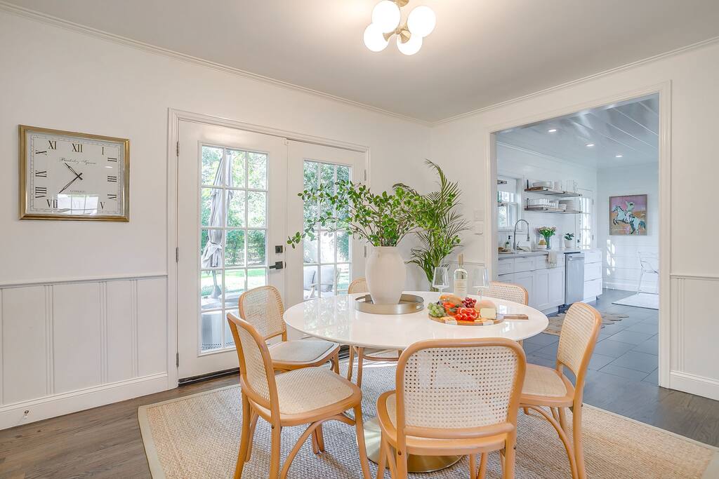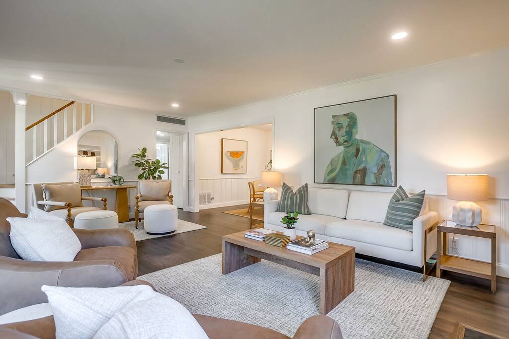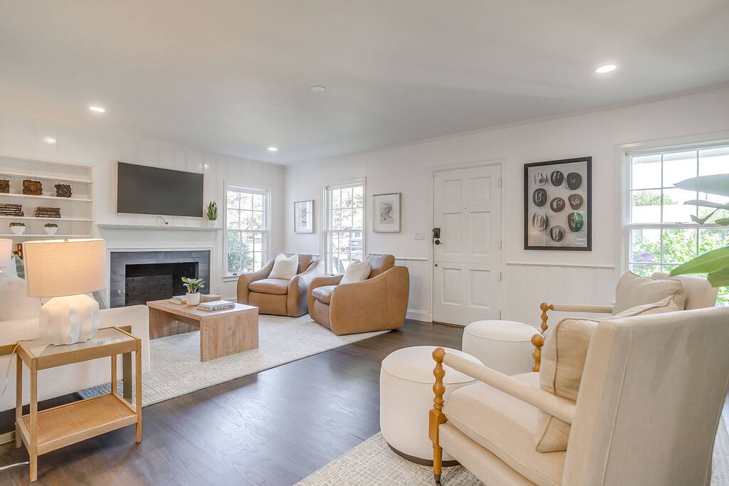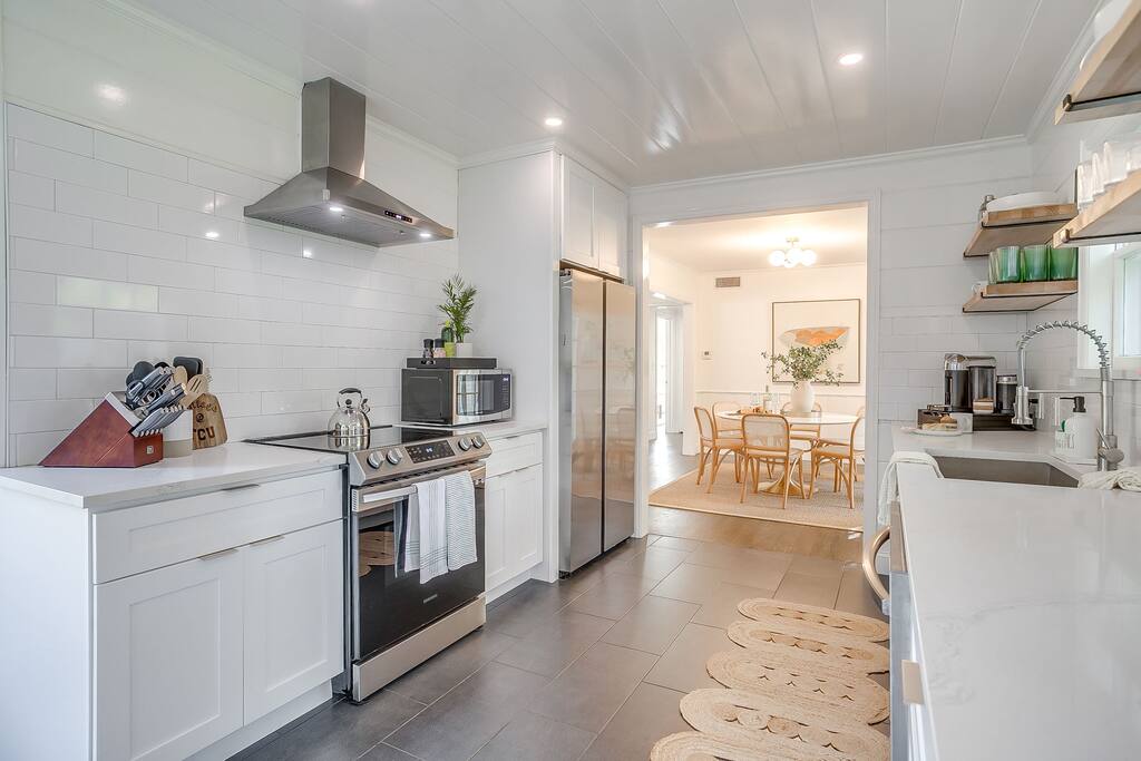 Step inside to find an inviting open-concept layout, complete with refinished hardwood floors, fresh interior paint, and abundant natural light. The updated kitchen features quartz countertops, stainless steel appliances, and custom cabinetry—ideal for home-cooked meals. The spacious living area flows seamlessly into the dining room, creating the perfect space for gatherings. The primary suite includes a private en-suite bath, while two additional bedrooms share a modern, fully updated bathroom. The backyard offers a peaceful retreat with a covered patio and lush lawn.