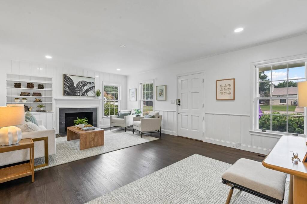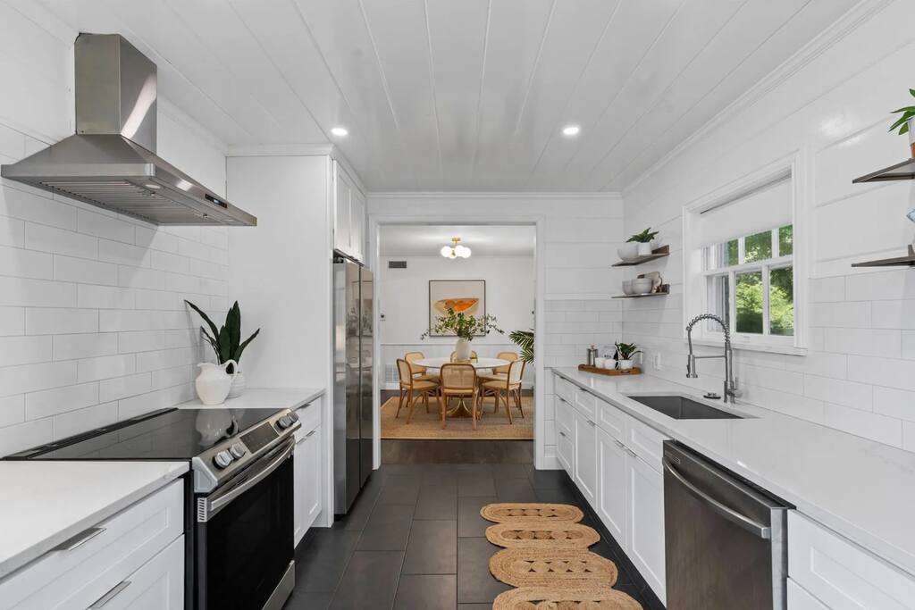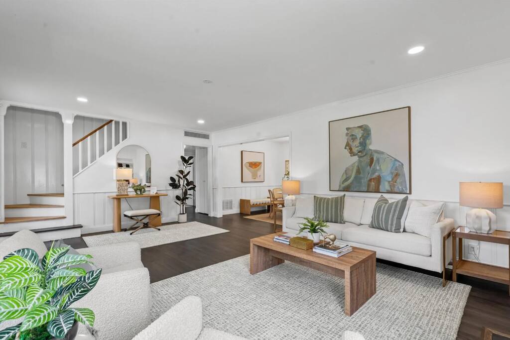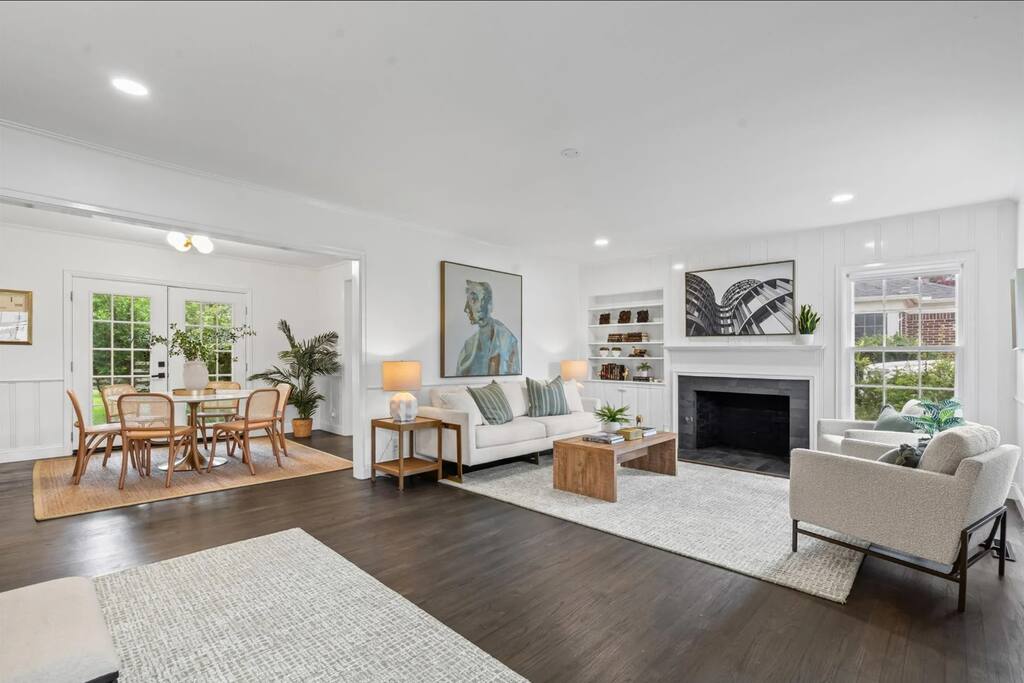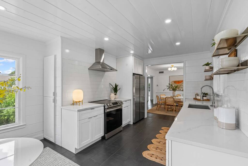 Step inside to find an inviting open-concept layout, complete with refinished hardwood floors, fresh interior paint, and abundant natural light. The updated kitchen features quartz countertops, stainless steel appliances, and custom cabinetry—ideal for home-cooked meals. The spacious living area flows seamlessly into the dining room, creating the perfect space for gatherings. The primary suite includes a private en-suite bath, while two additional bedrooms share a modern, fully updated bathroom. The backyard offers a peaceful retreat with a covered patio and lush lawn.